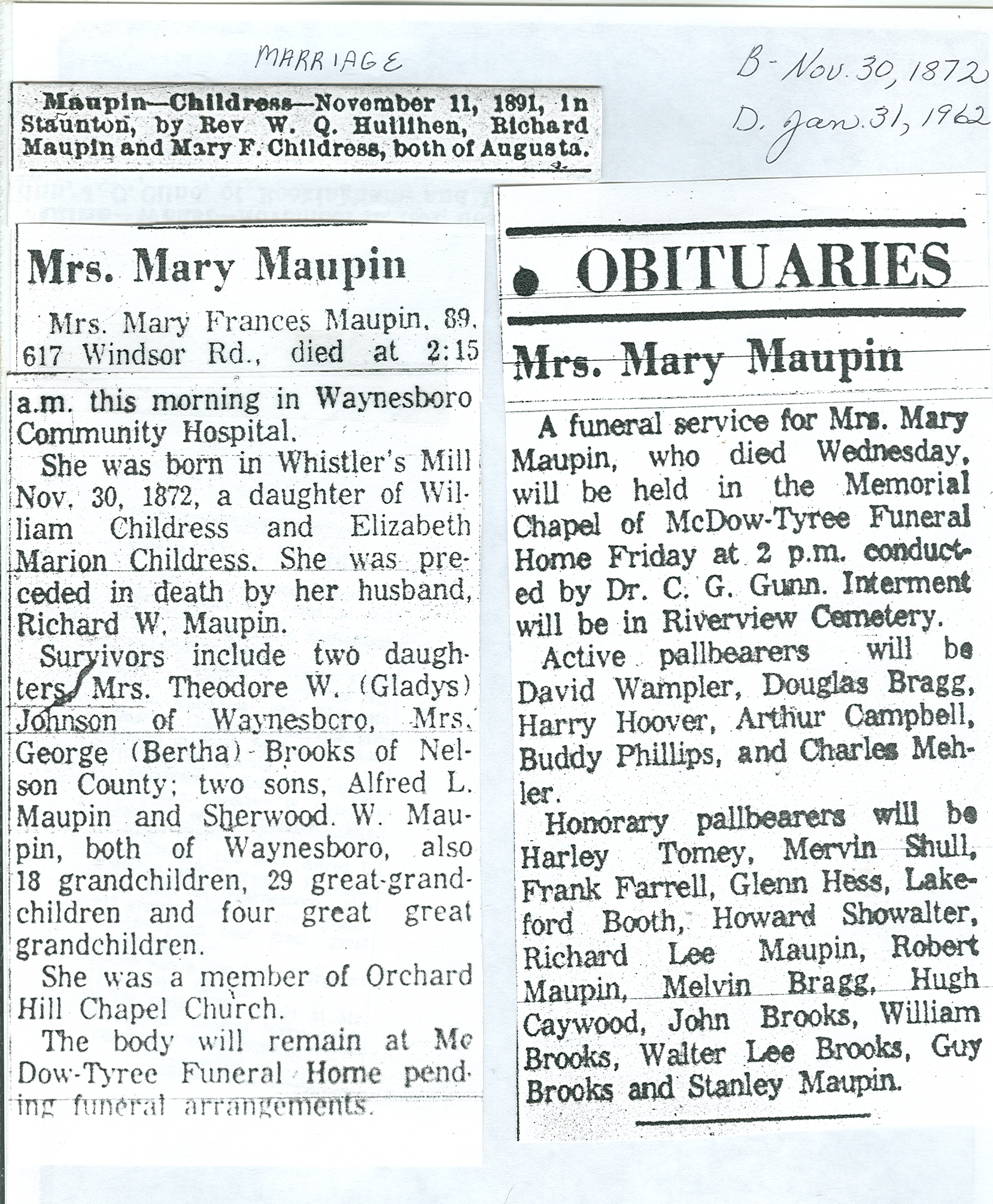 437. Obituary from Waynesboro, VA Newspaper, Mary Louise Maupin Knowles.
