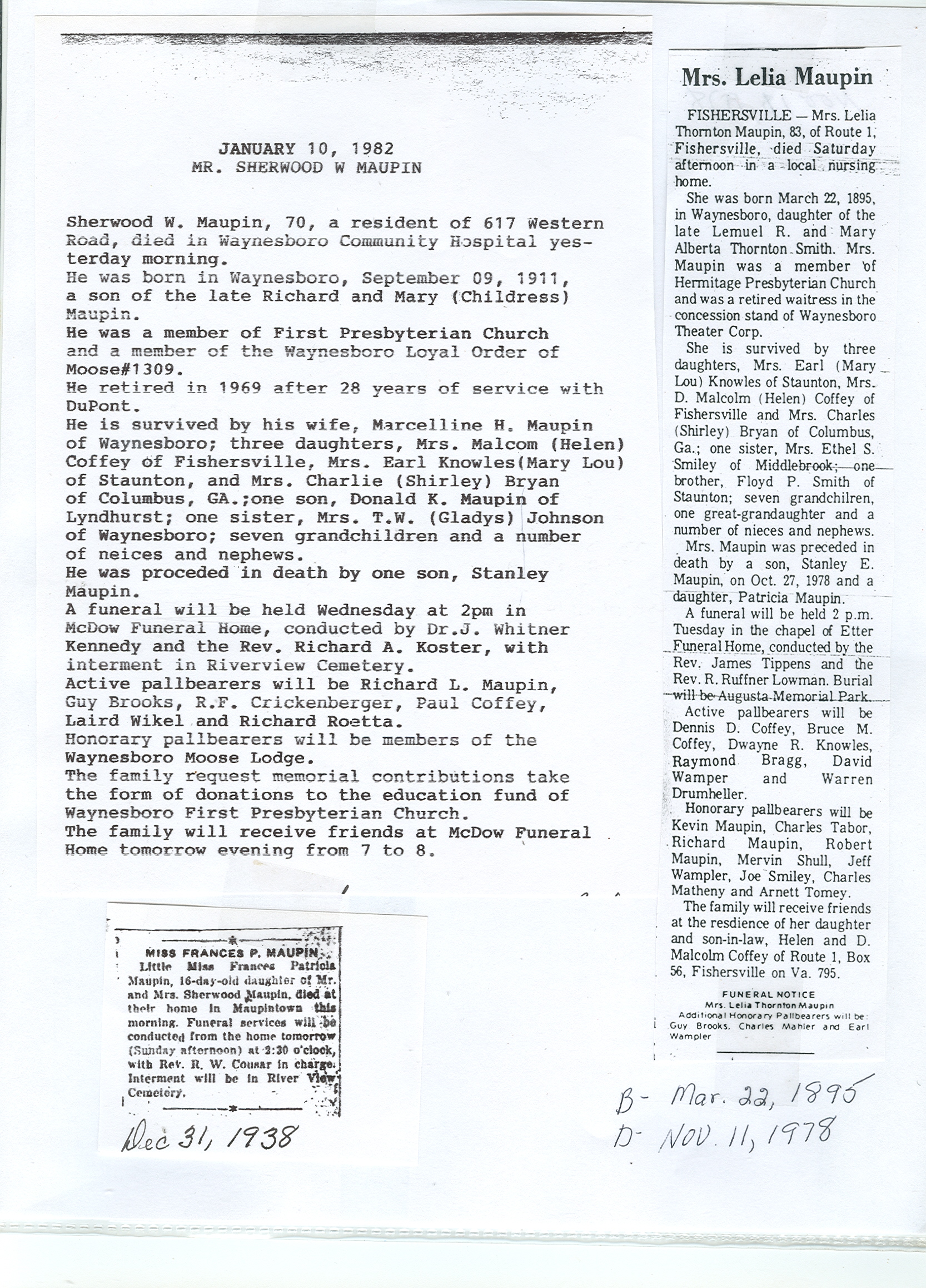 436. Obituary from Waynesboro, VA Newspaper, Lelia Thornton Maupin.