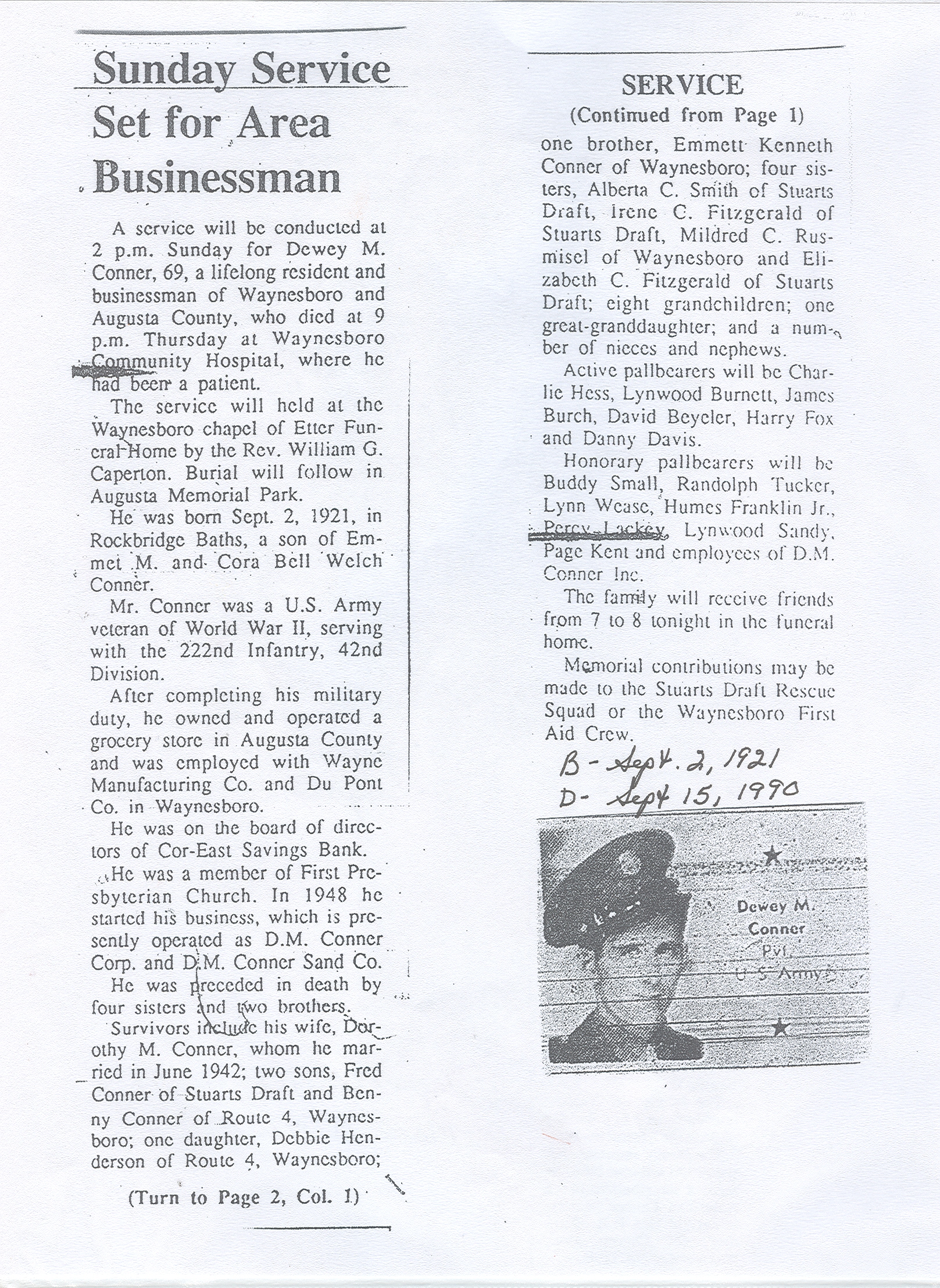 420. Obituary from Waynesboro, VA Newspaper, Dewey M. Conner.