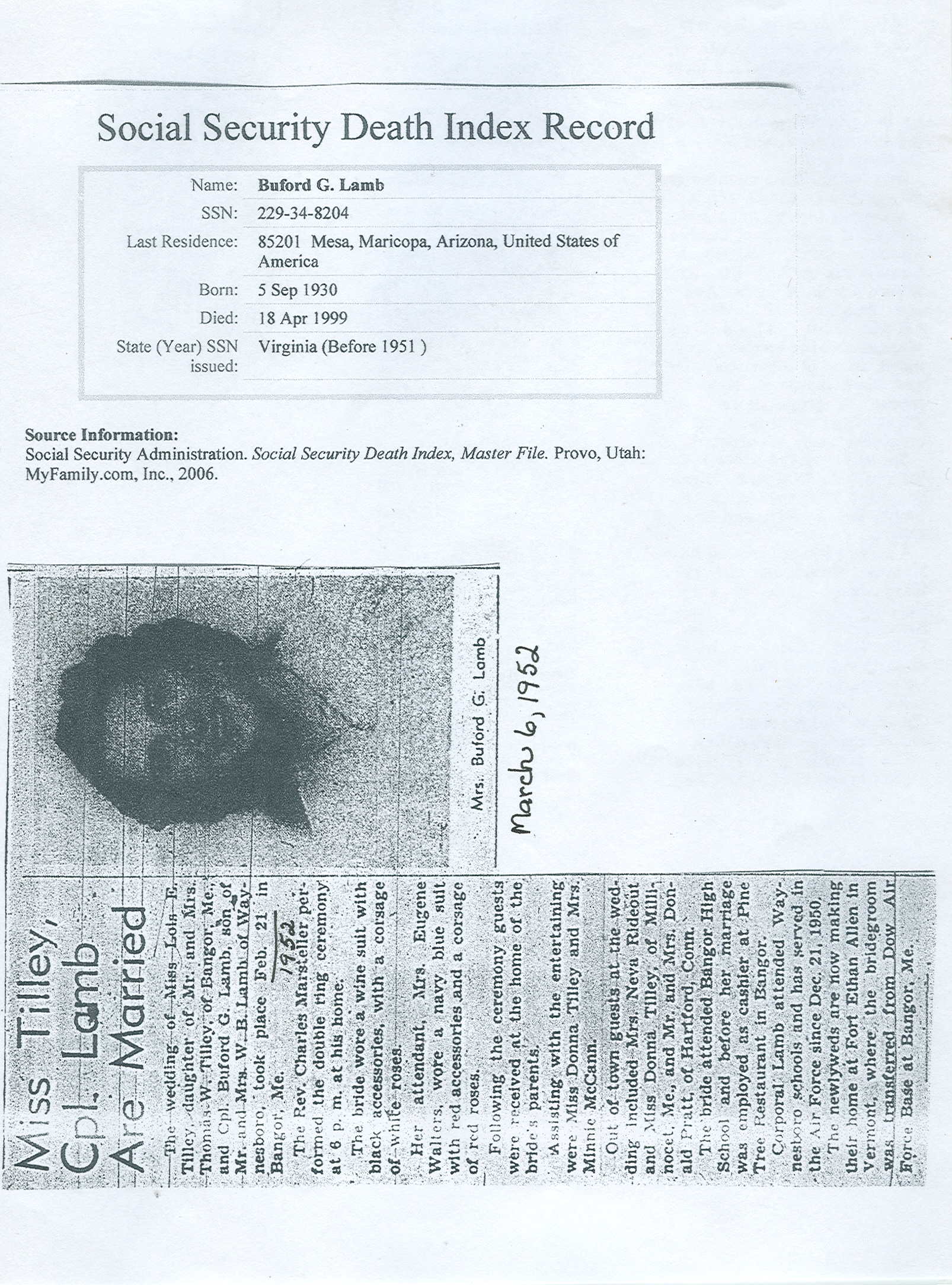 Buford married Lois E. Tilley on 21 Feb 1952 in Bangor, Penobscot, Maine, USA.454 Lois was born in Bangor, Penobscot, Maine, USA.