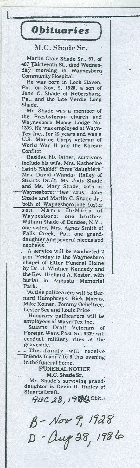 455. Obituary from Waynesboro, VA Newspaper, Martin Clair Shade Sr.