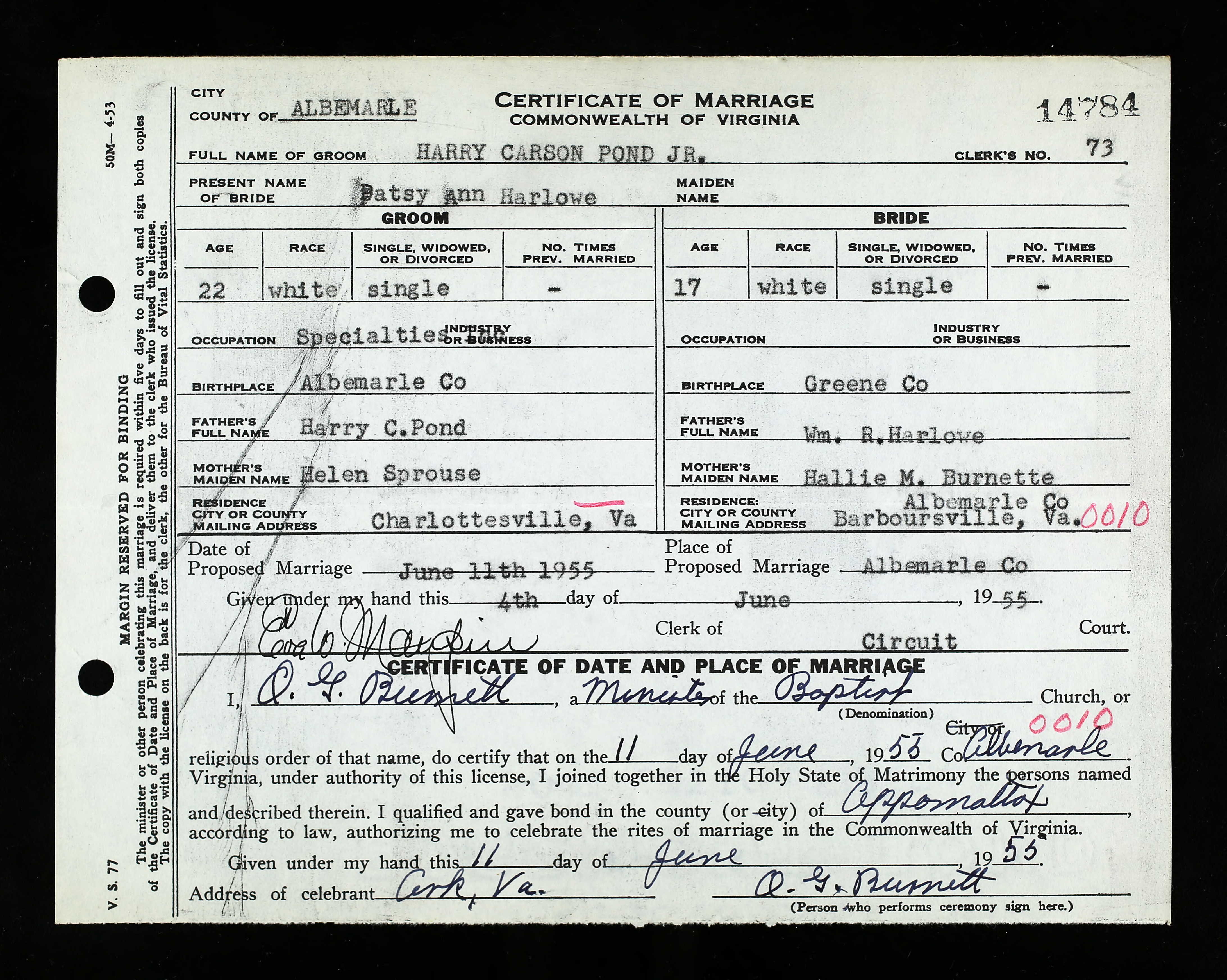 456. Augusta County Clerk of Court, Harry Carson Pond & Patsy Ann Harlowe.