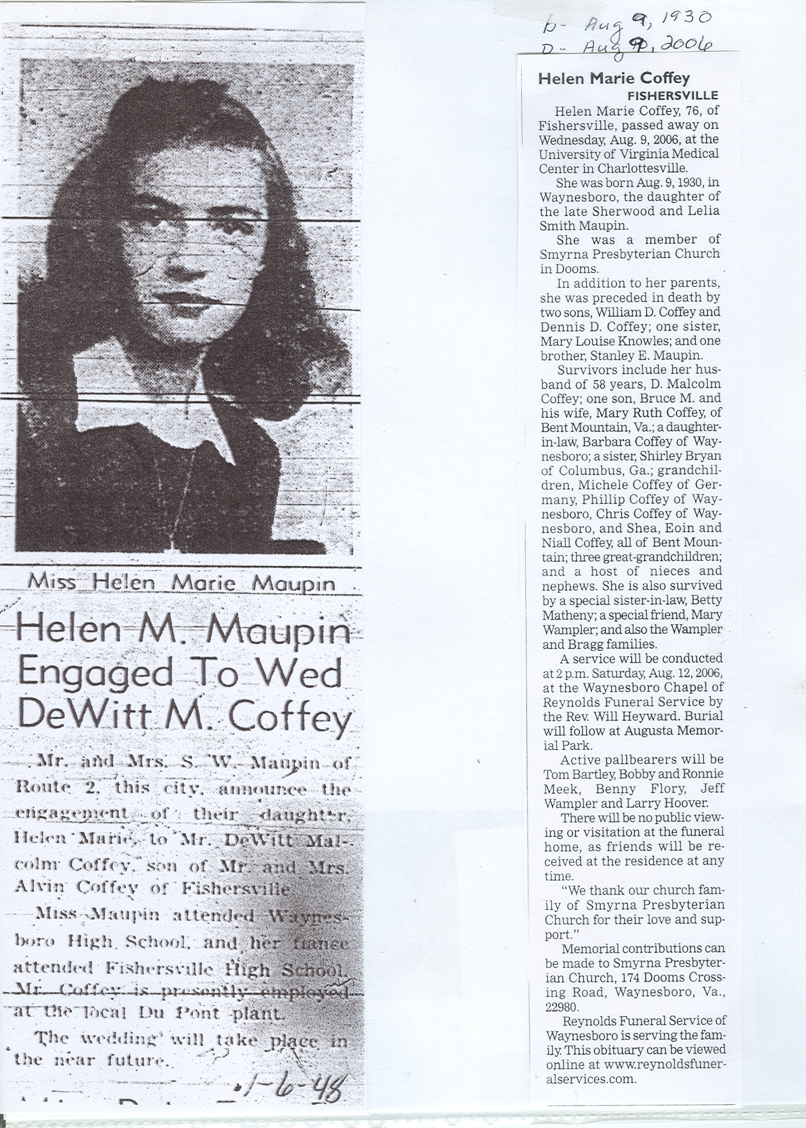 438. Obituary from Waynesboro, VA Newspaper, Helen Marie Maupin Coffey.