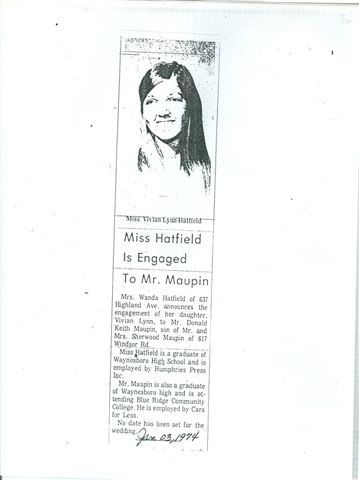 474. Newspaper Marriage Announcement, Donald Keith Maupin & Vivian Lynn Hatfield.