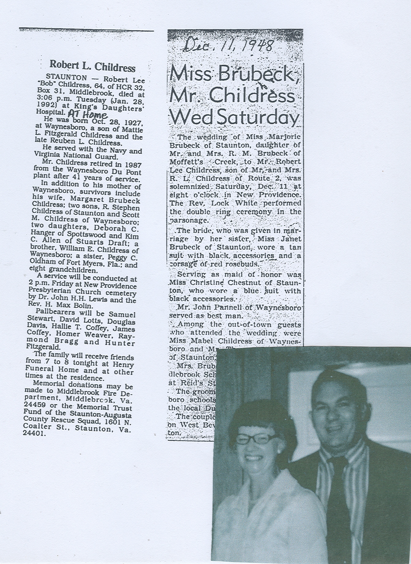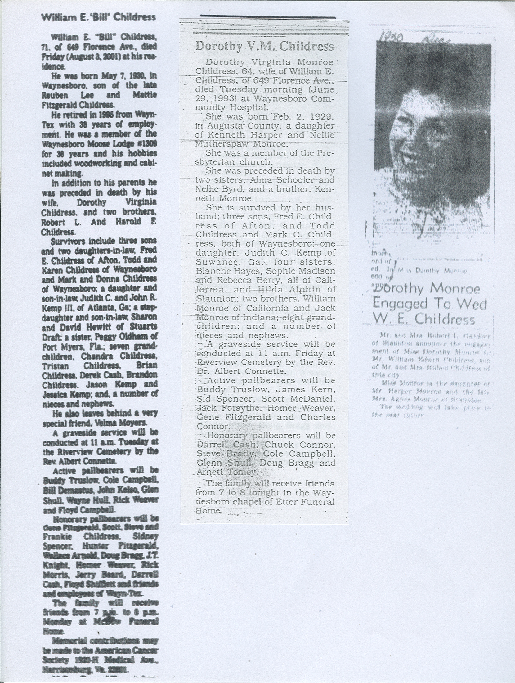 477. Obituary from Waynesboro, VA Newspaper, Dorothy Virginia Monroe Childress.