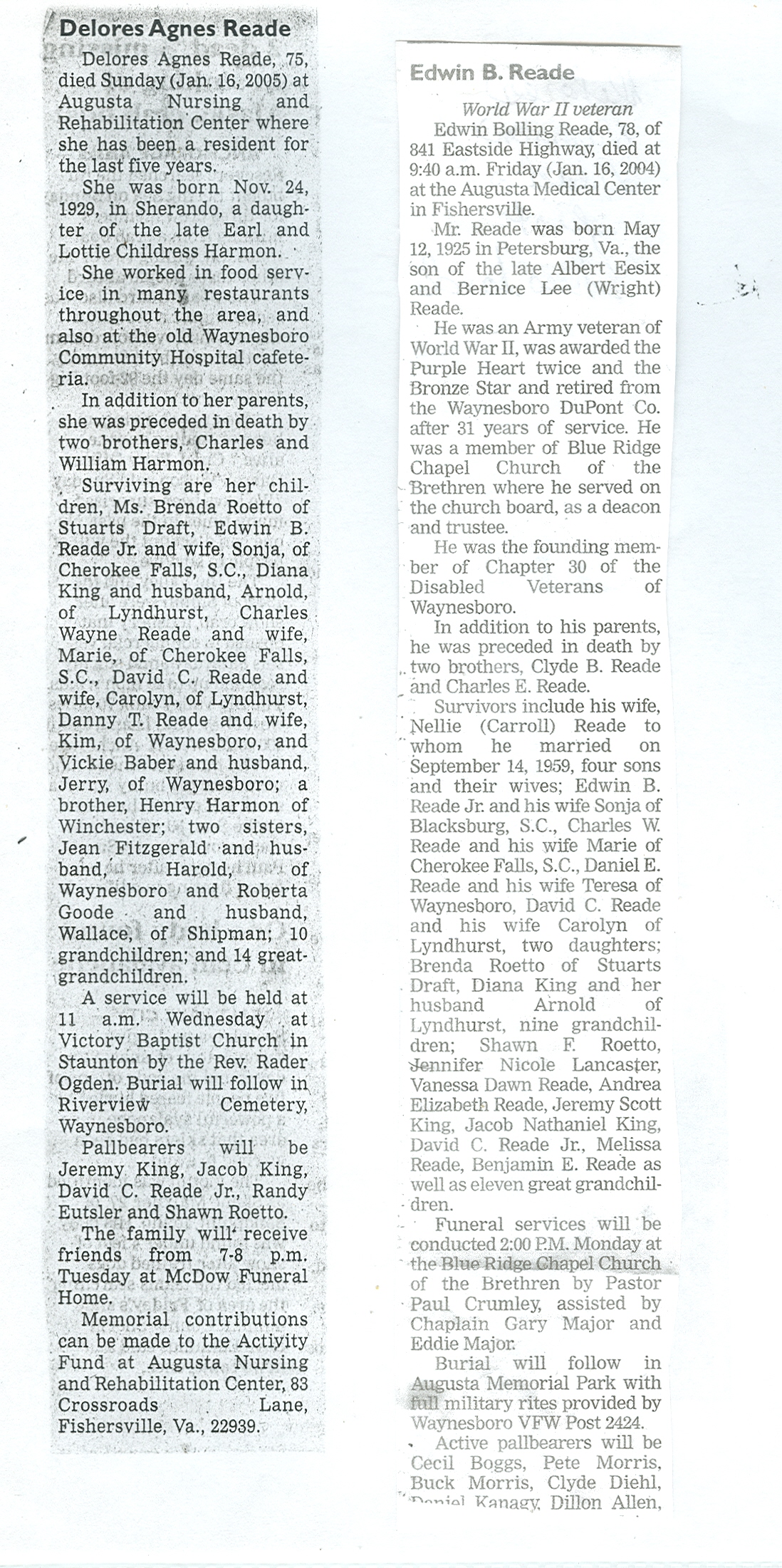 445. Obituary from Waynesboro, VA Newspaper, Delores Agnes Reade.
