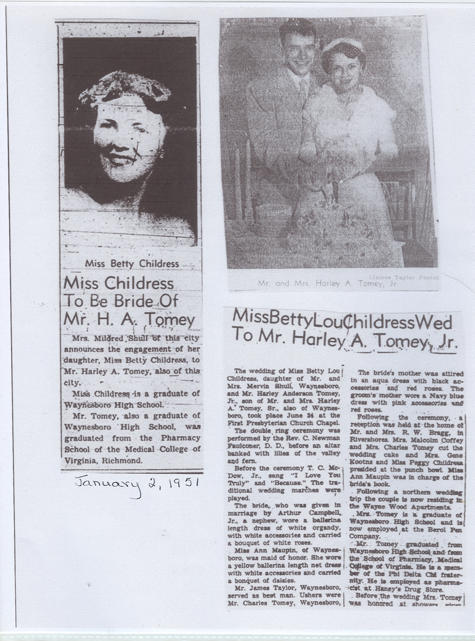 482. Newspaper Marriage Announcement, Betty Lou Childress & Harley A. Tomey, Jr.