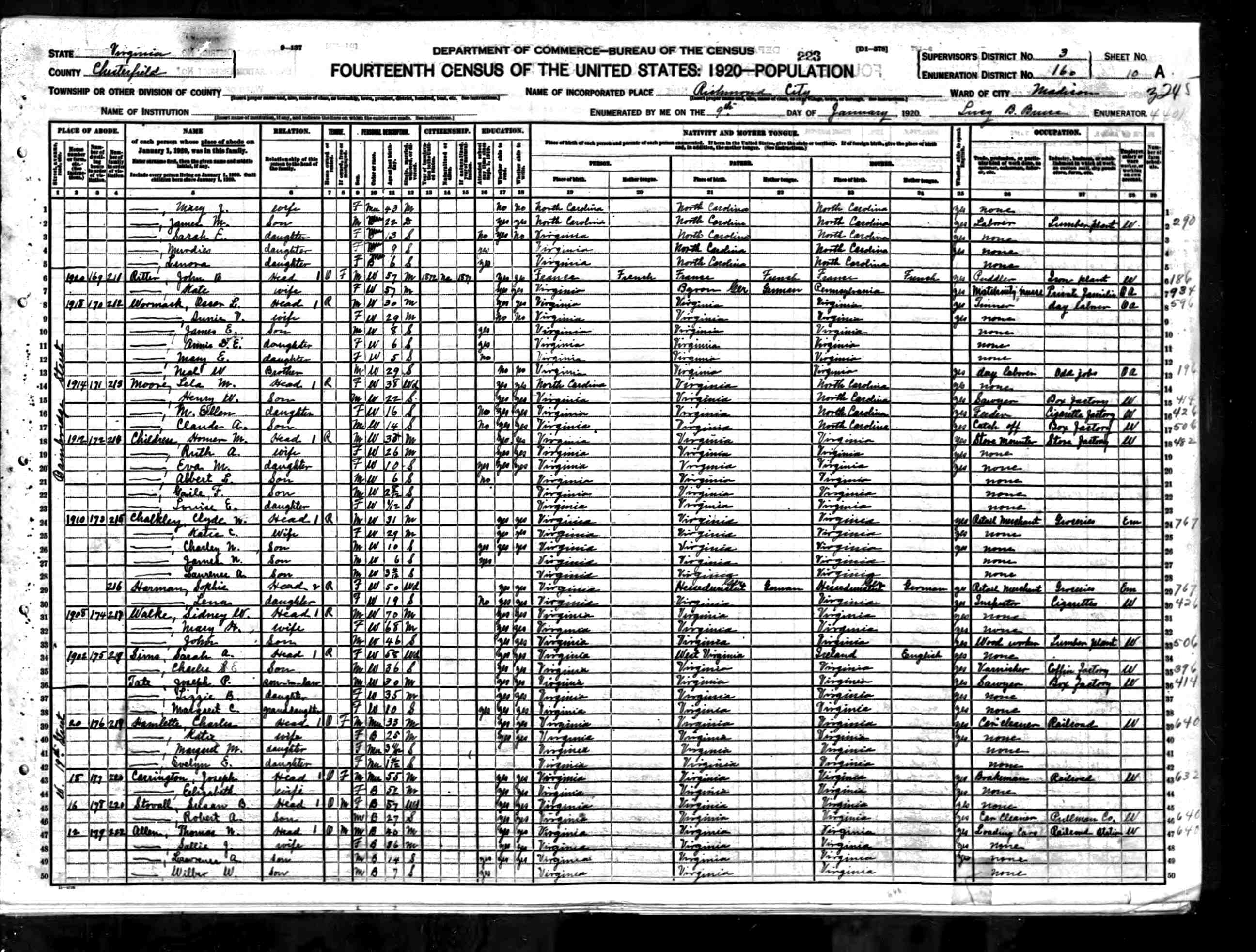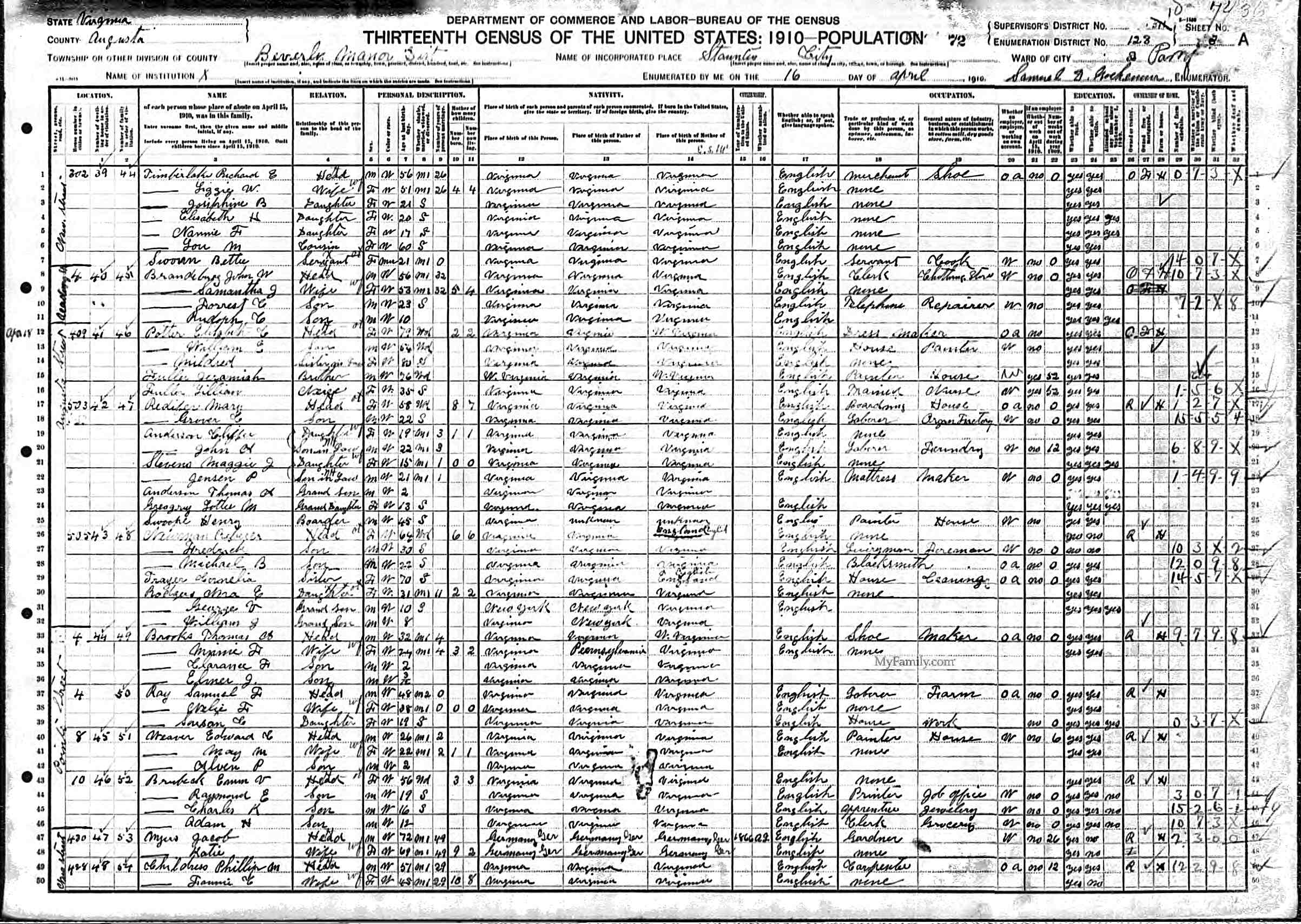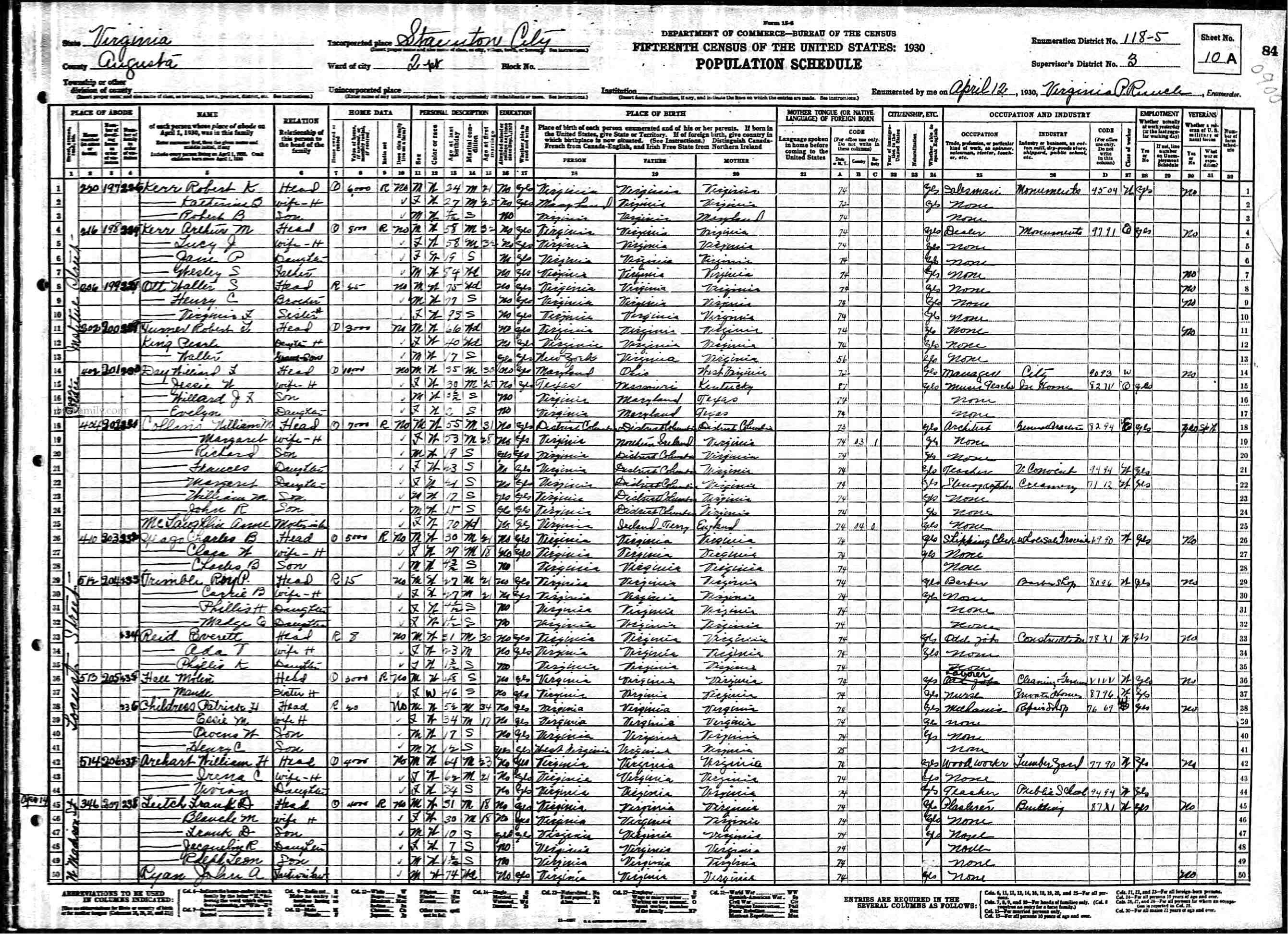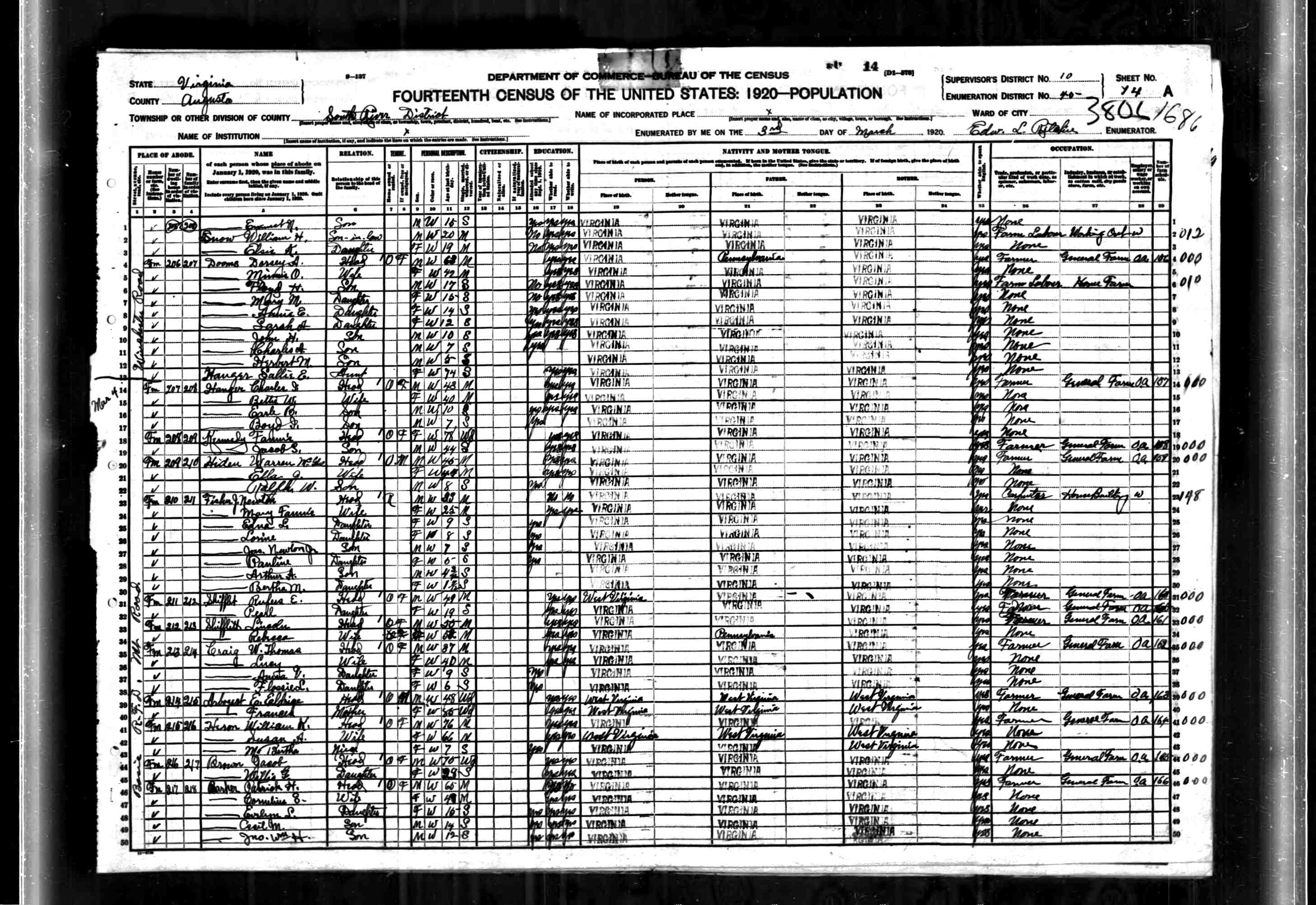 449. 1920 Virginia Census, Augusta, Beverly Manor, ED 29, Sht 1B.