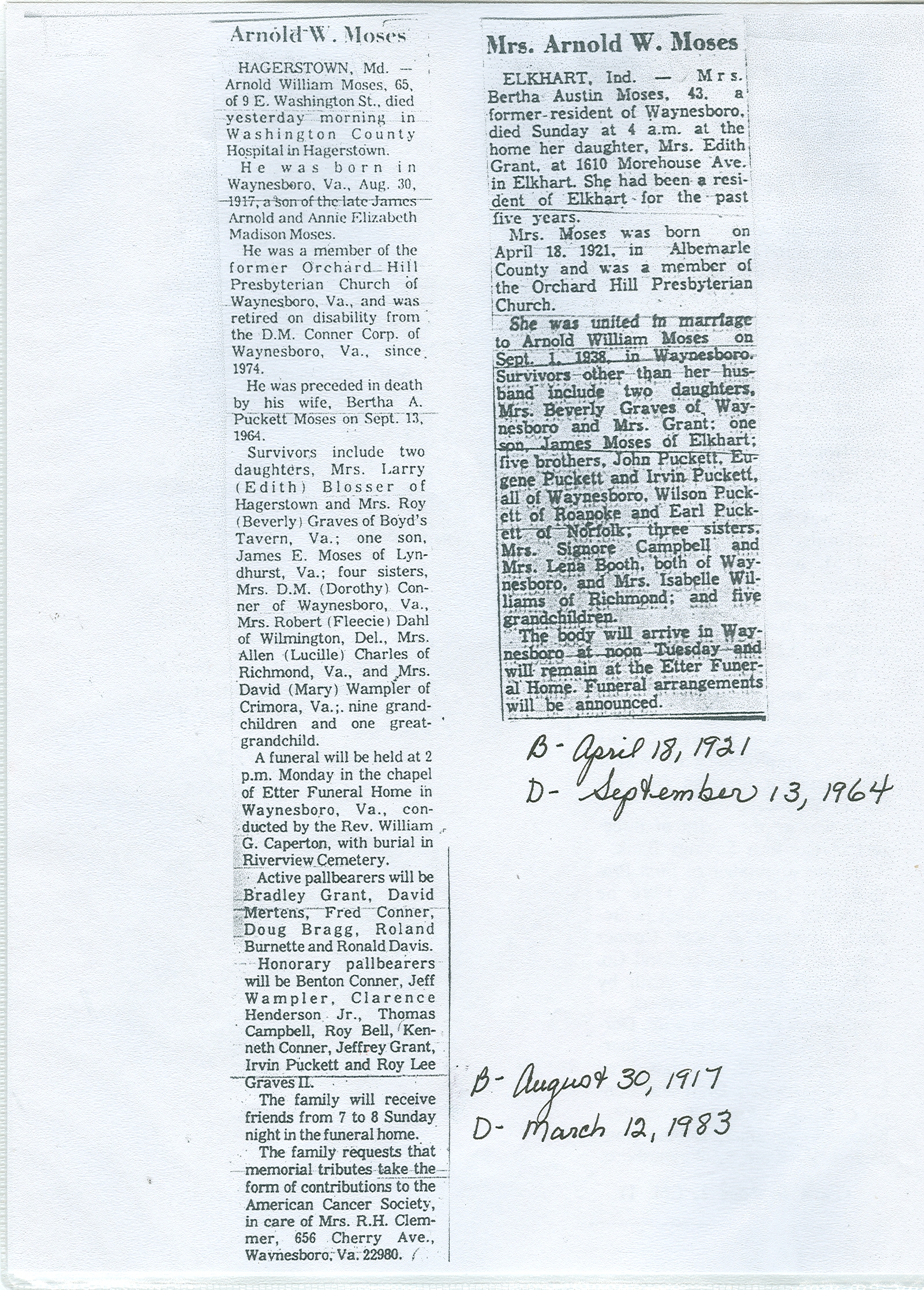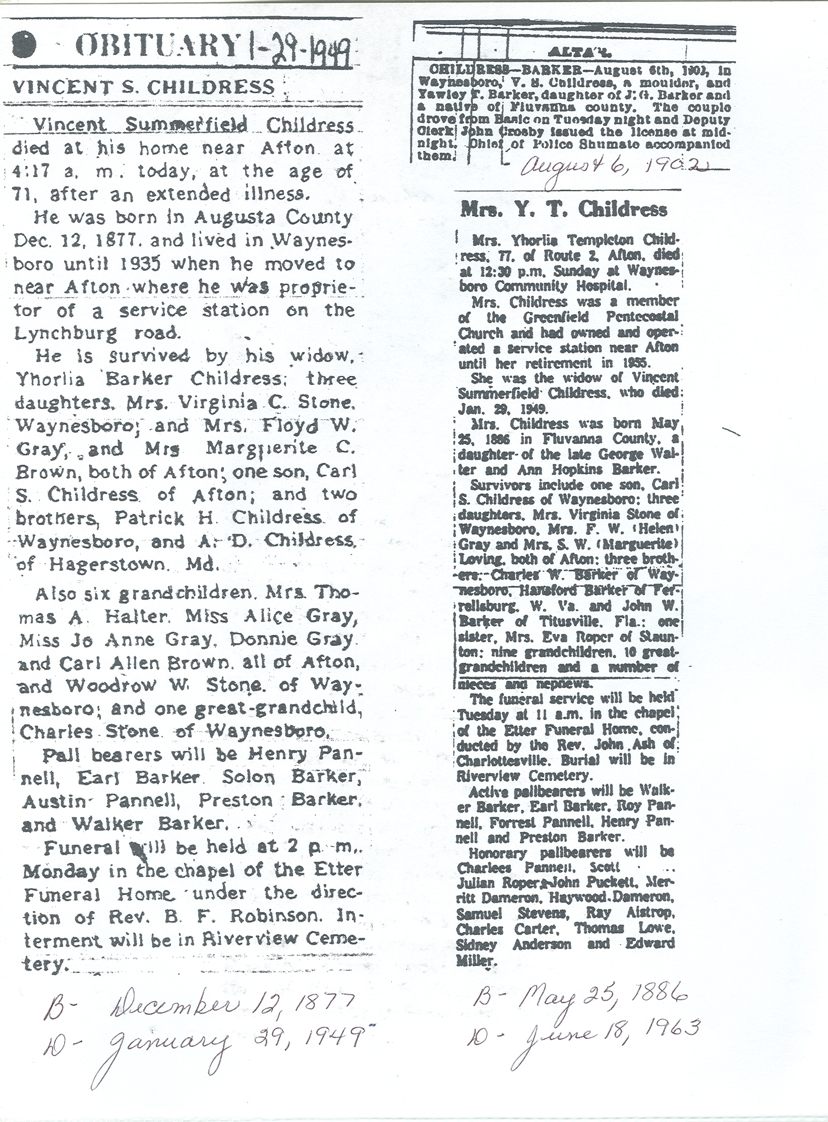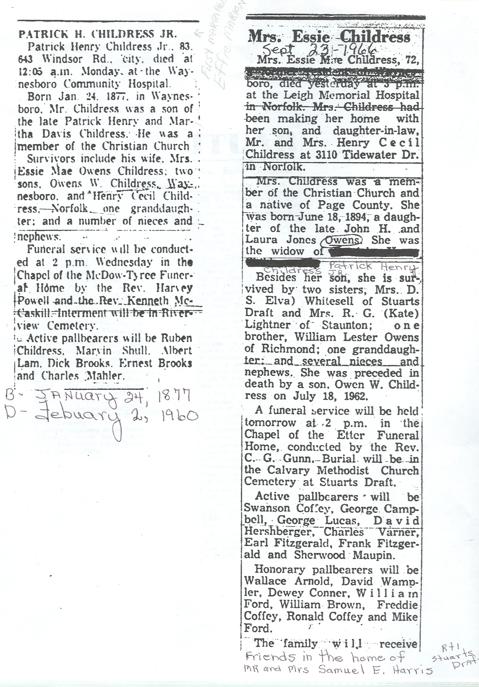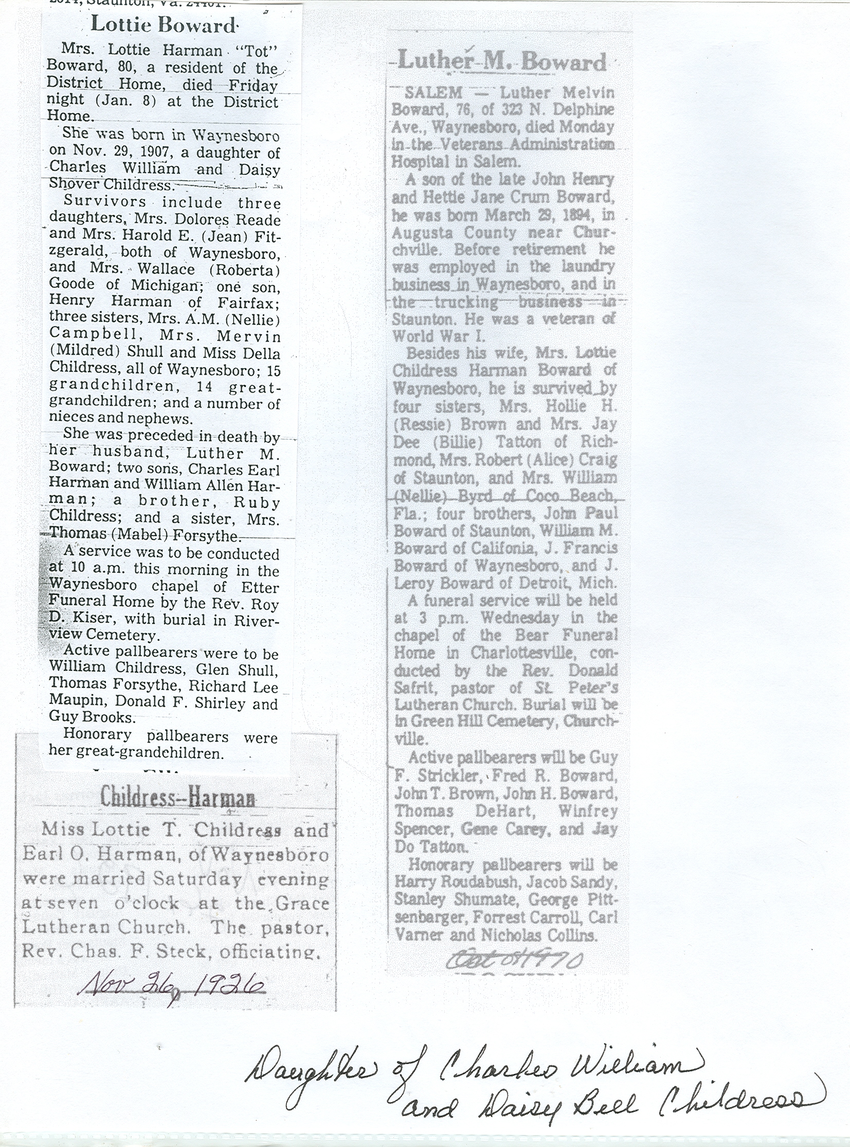 477. Obituary from Waynesboro, VA Newspaper, Dorothy Virginia Monroe Childress.