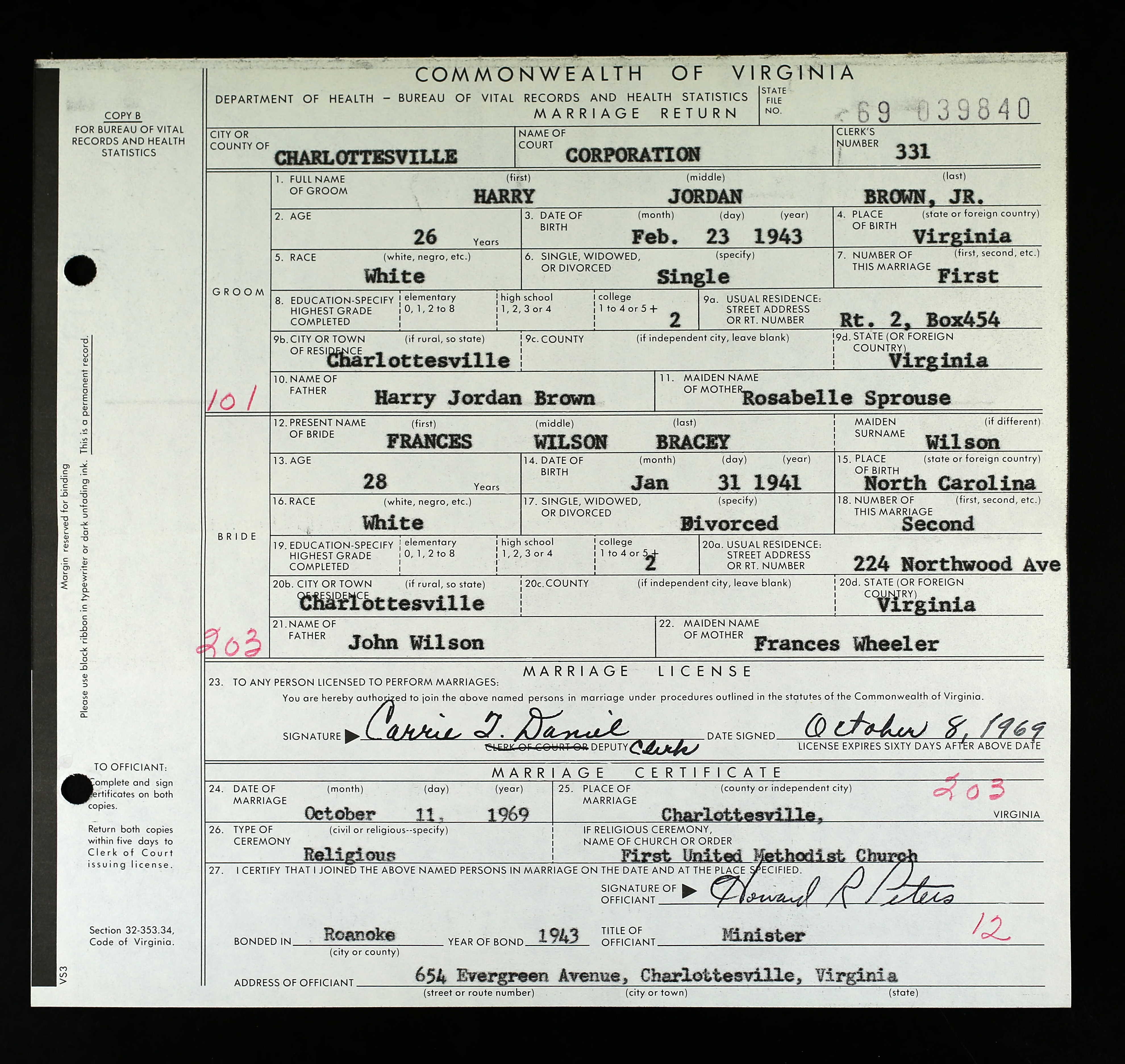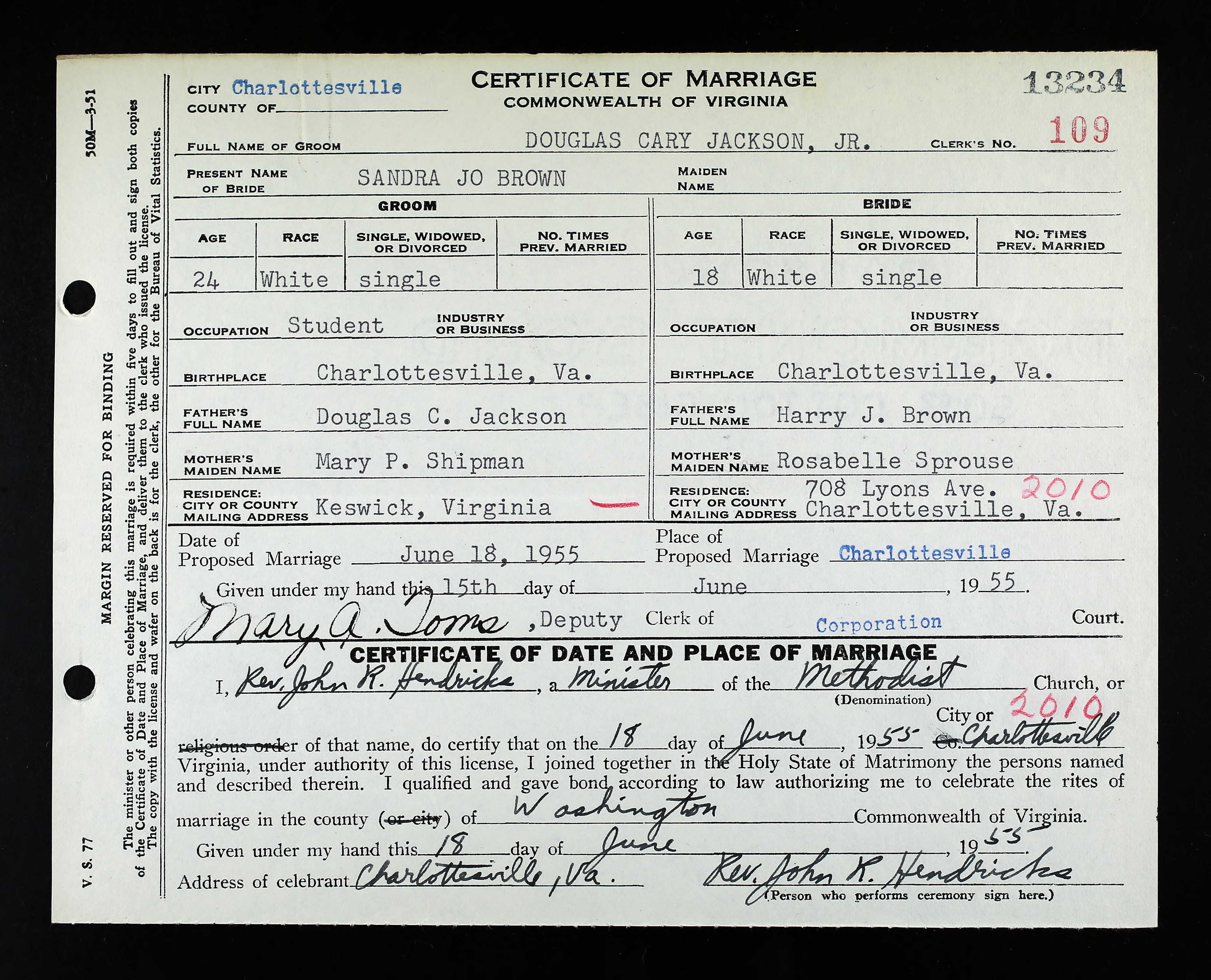 471. Charlottesville, VA Marriage Records, Marriage Certificate.