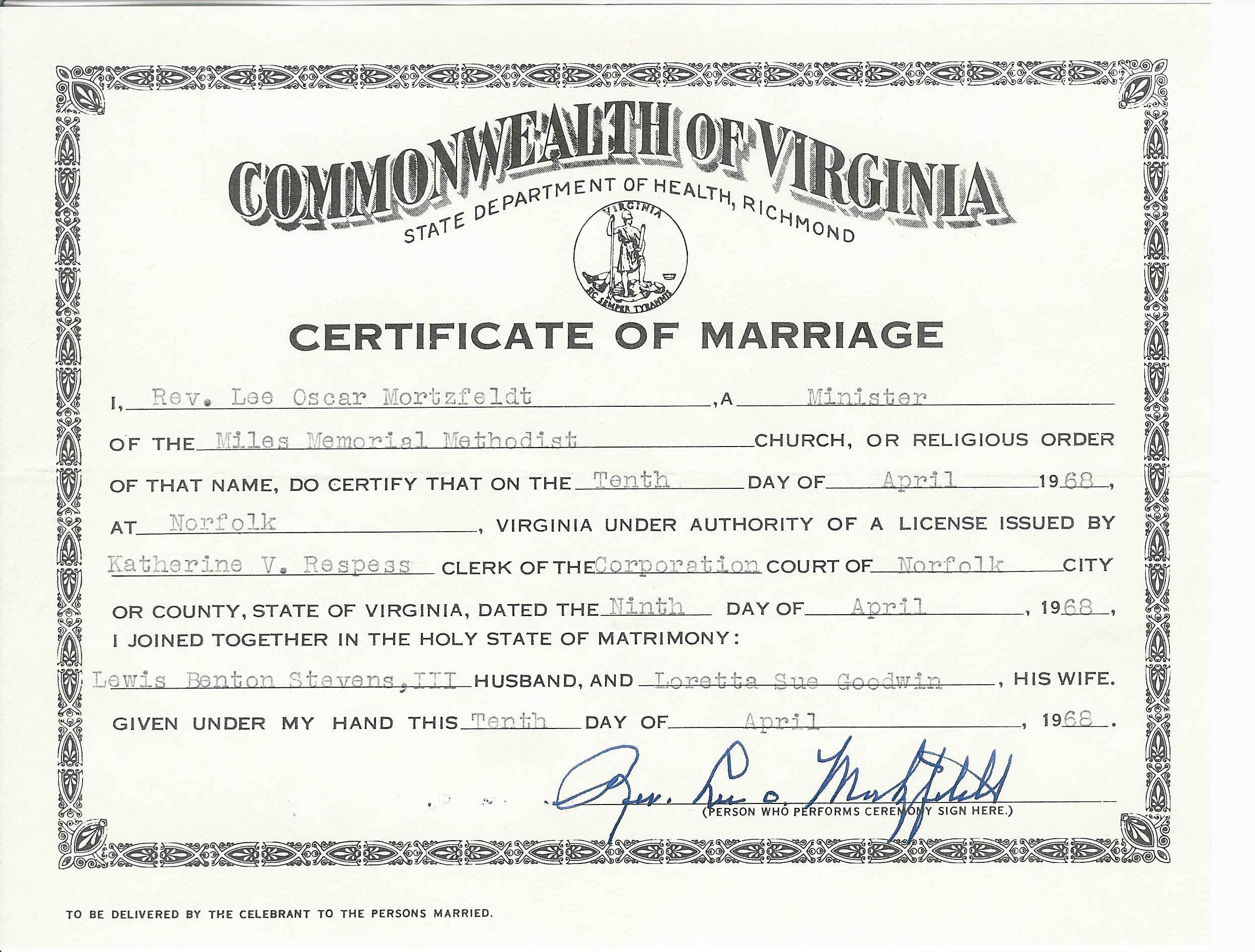 468. Augusta County Clerk of Court, Lewis Benton Stevens III & Loretta Sue Goodwin. Rev. Lee Oscar Mortzfeldt Miles Memorial Methodist Church. Wet night. In attendance were: