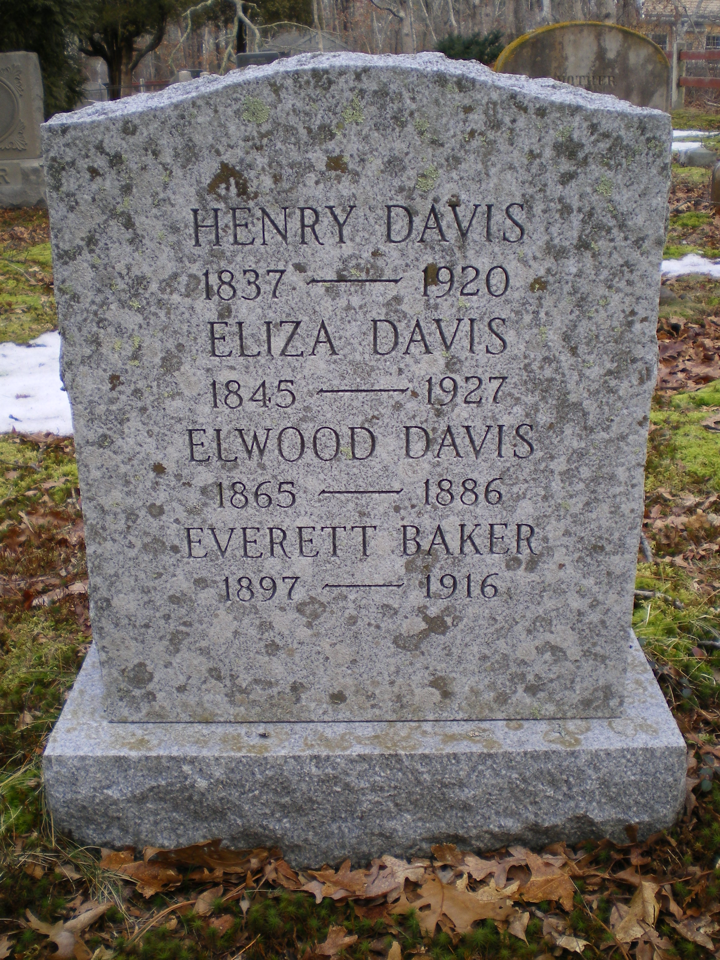 Eliza married Henry O. Davis, son of Joseph Davis and Desire [Mnu], on 1 Jan 1865 in Falmouth, Barnstable County, Massachusetts, USA.97 Henry was born in 1837, died in 1920, at age 83, and was buried in Davisville Cemetery, Davisville, Barnstable County, Massachusettes, USA.