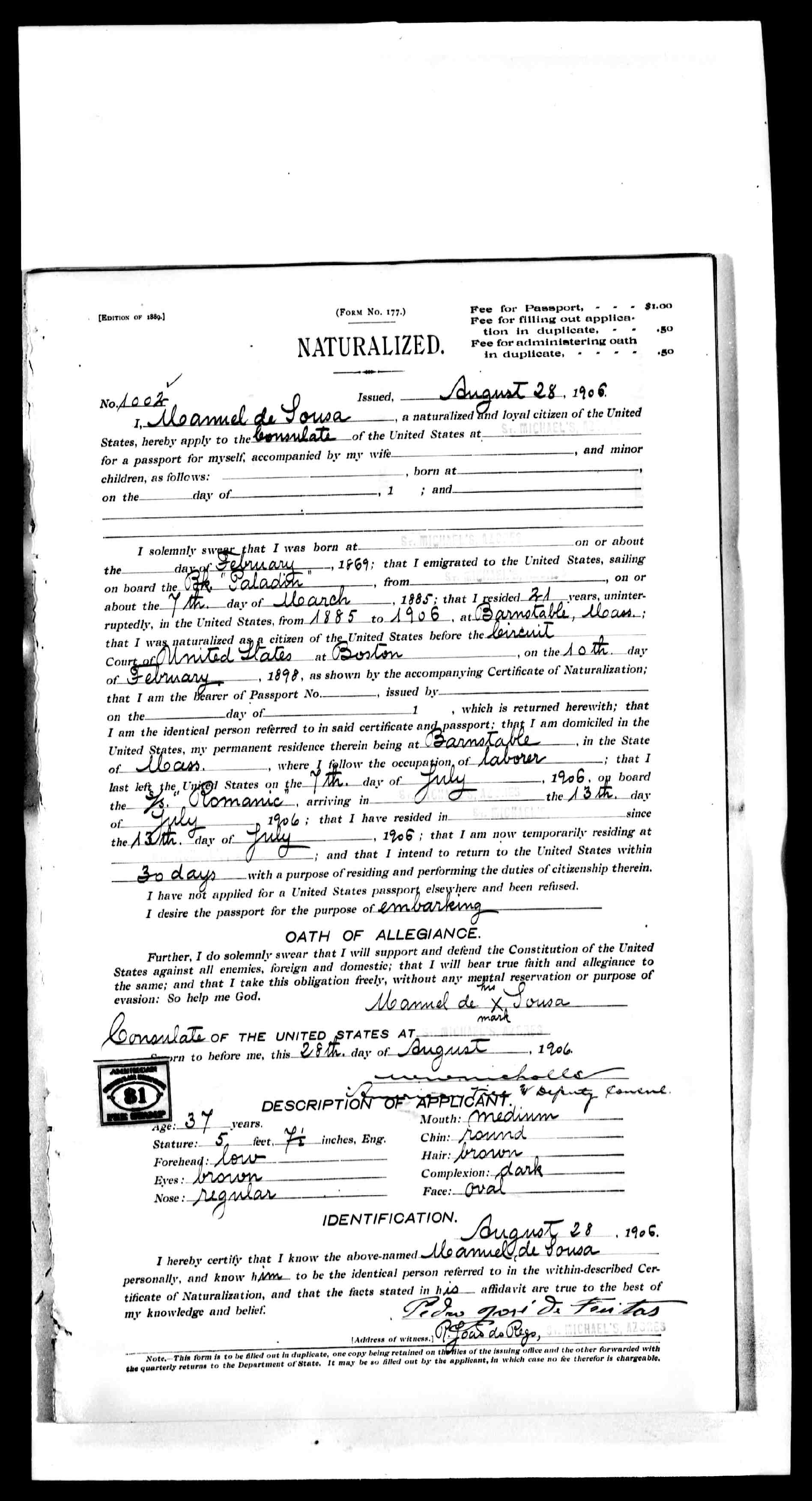 closest match Manoel de Souza, country of birth or allegiance Portugal, birth 28 Feb 1868, date of naturalization 5 Nov 1897 (conflict with 1920 Census