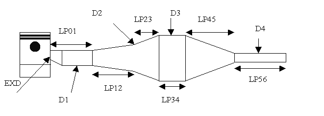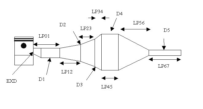 A diagram of a typical two-stage diffuser expansion chamber is shown above. Note that the length of the header pipe section LP01 includes the length of the exhaust port, i.e. LP01 is measured from the piston face.