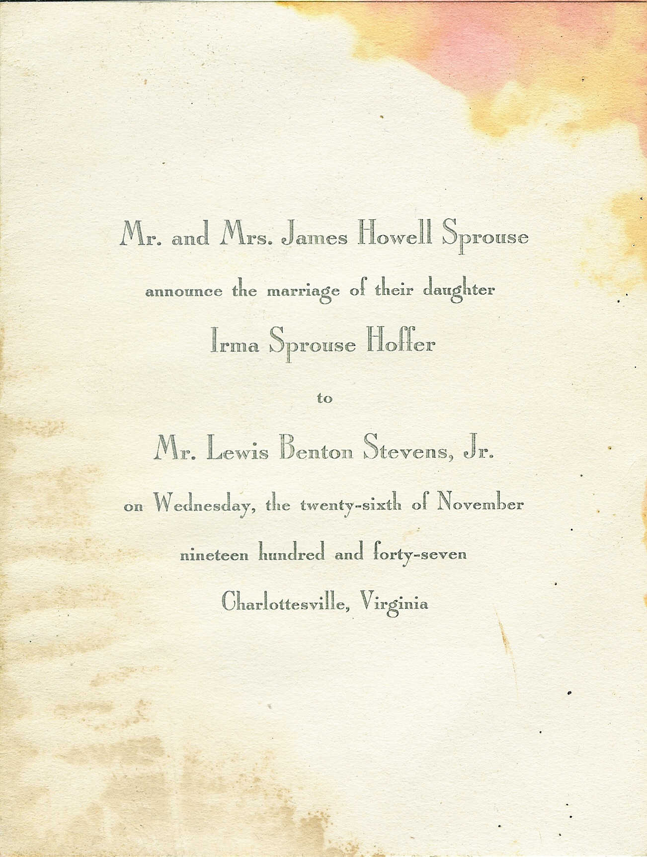 214. Marriage Announcement, Lewis B. Stevens Jr. & Irma Ruth Sprouse.