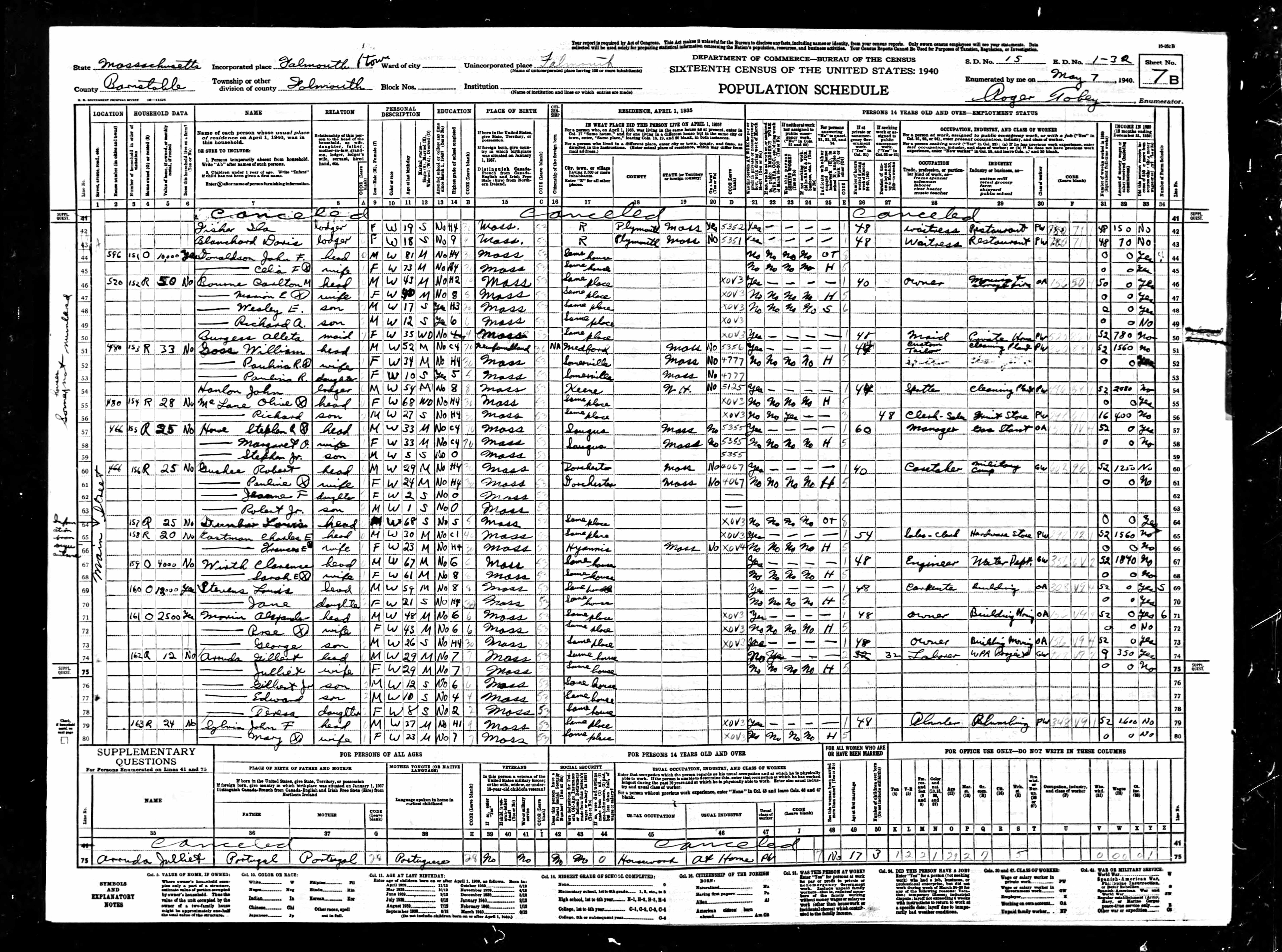 231. 1940 Massachusetts Census, Barnstable, Falmouth, ED 1-33, Sht 12B, Image 24 Roll T627.