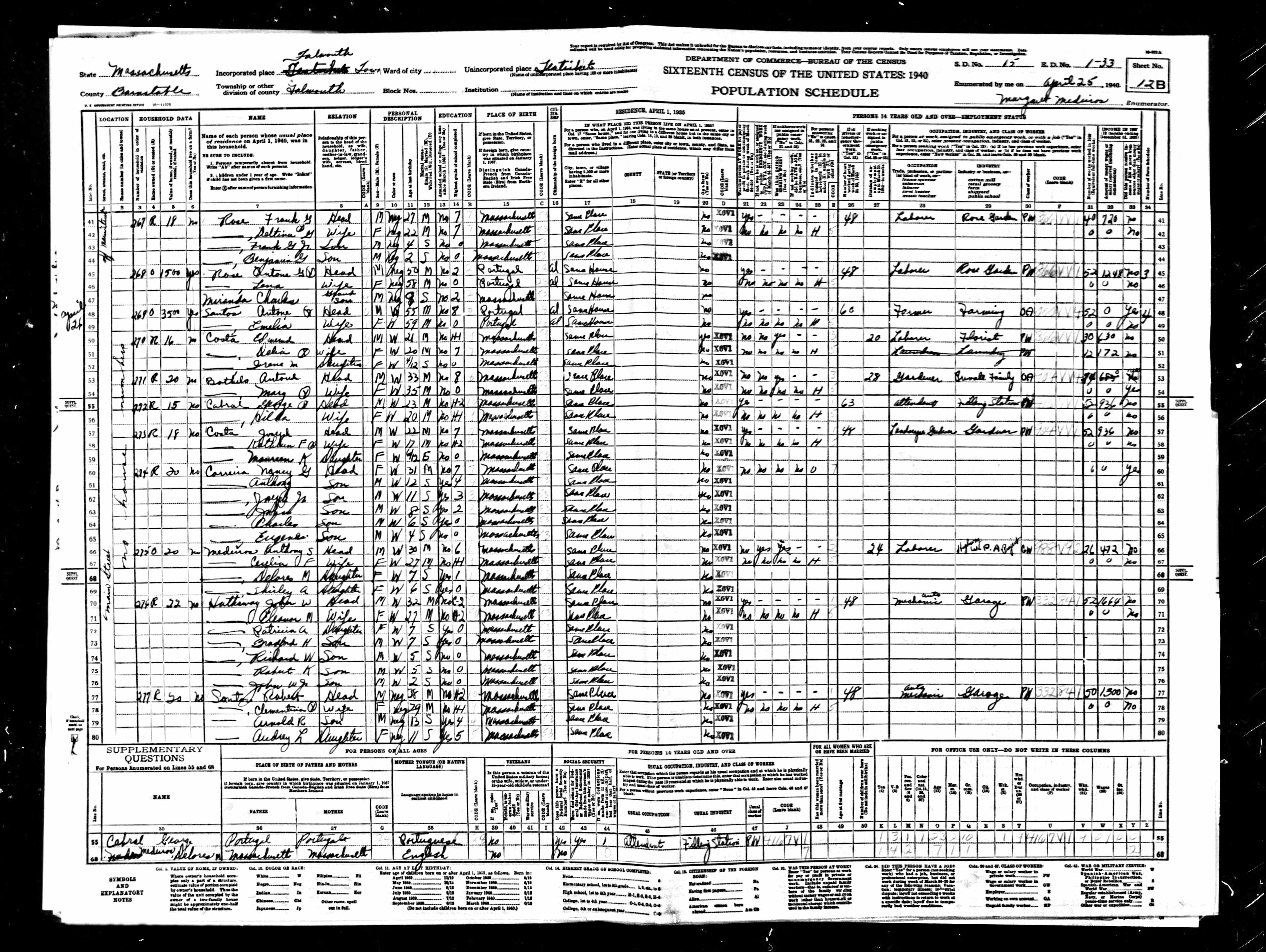 231. 1940 Massachusetts Census, Barnstable, Falmouth, ED 1-33, Sht 12B, Image 24 Roll T627.