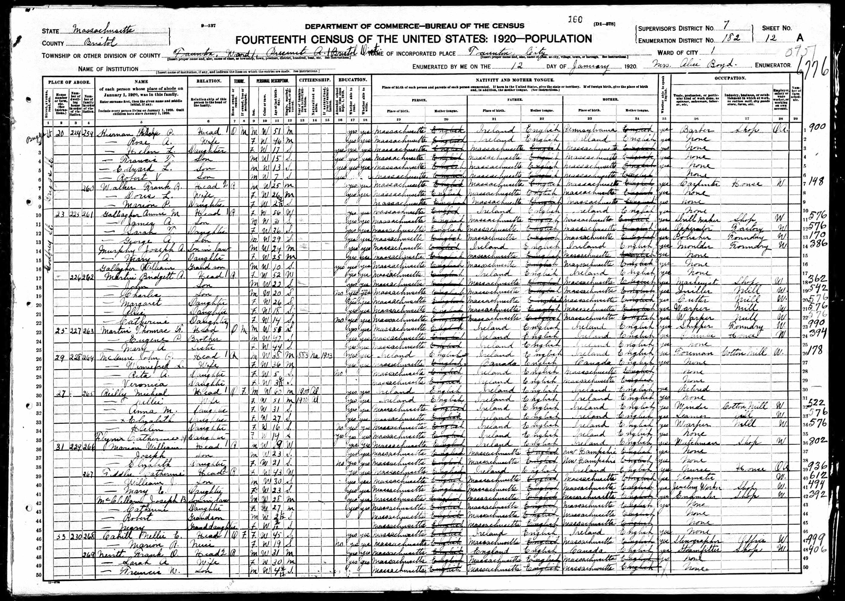 205. 1920 Massachusetts Census, Bristol, Taunton Ward 1, ED 182, Sht 12A, Image 23.