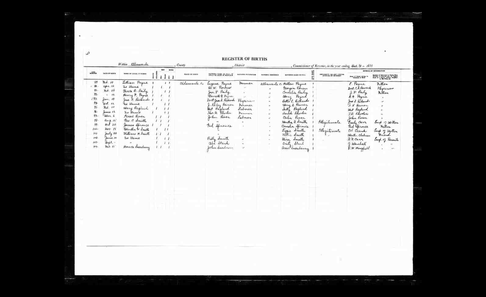 13. Albemarle County, Virginia Death Register, John Sprouse. Microfilm "Virginia State Archives" Death Records of Albemarle County 1857, Line 115.