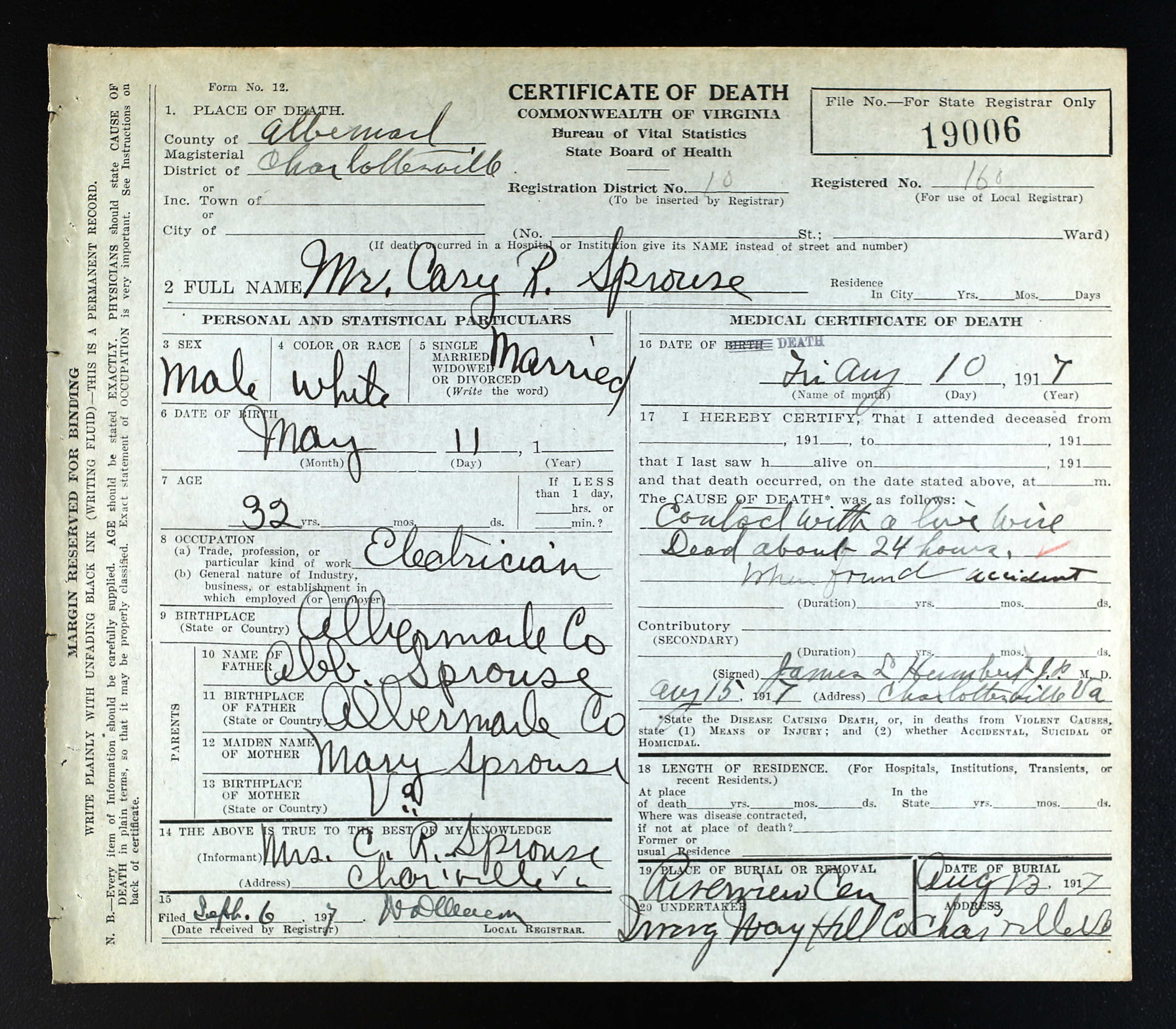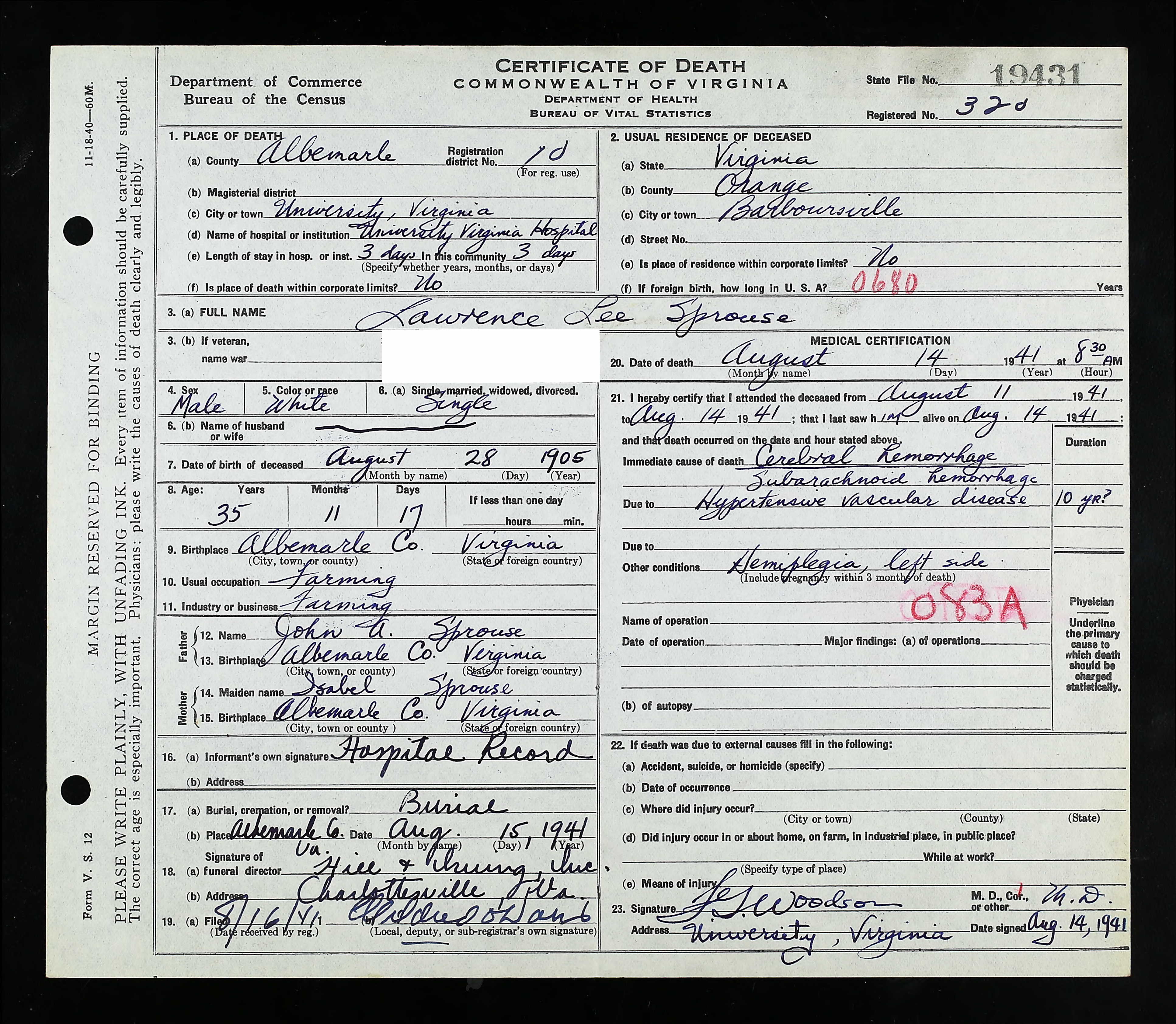 14. (Virginia Deaths and Burials Database Family Search Index entries derived from digital copies of originals housed in various repositories throughout Virginia.), John Sprouse. Name Jno. Sprouce