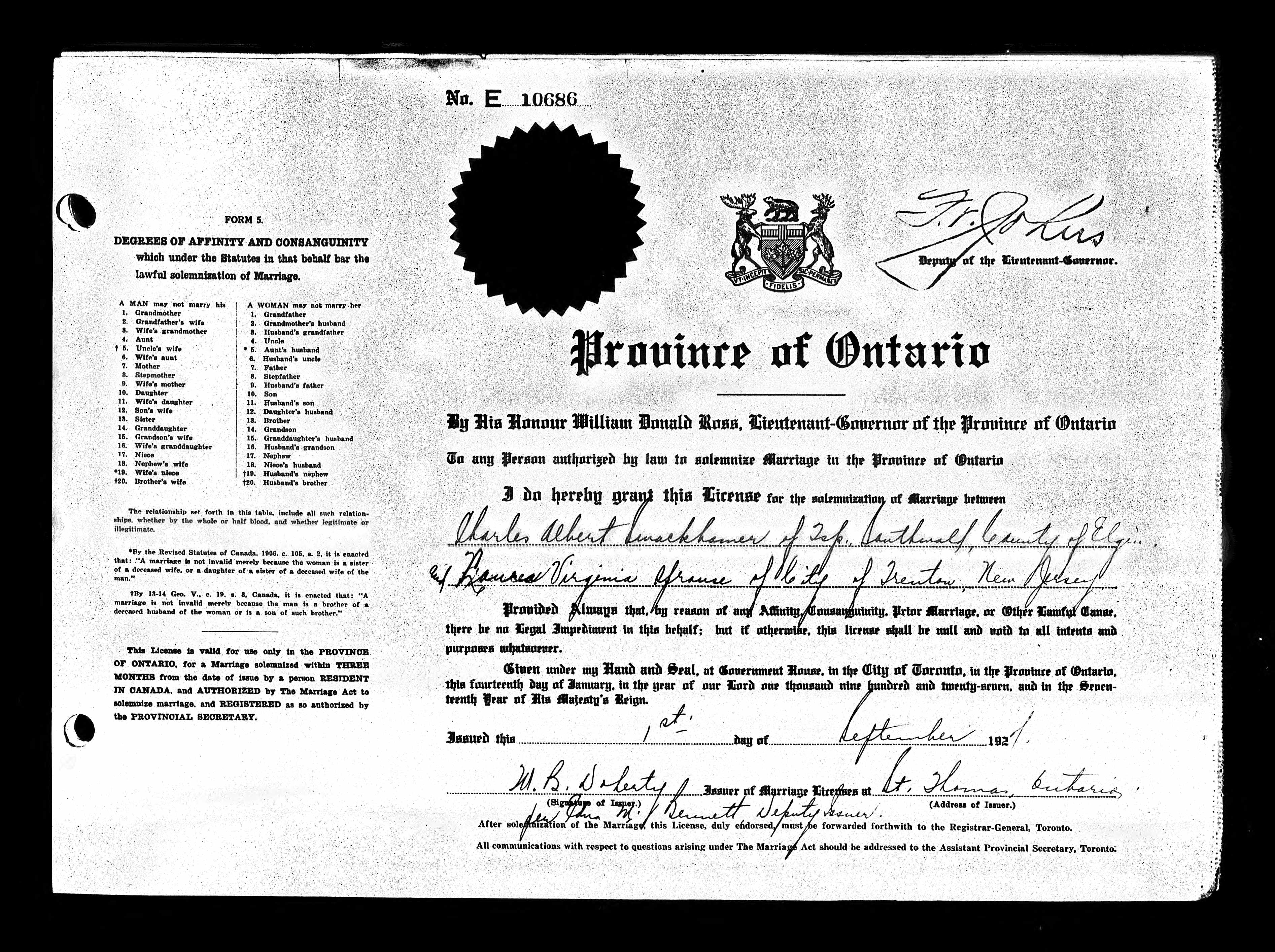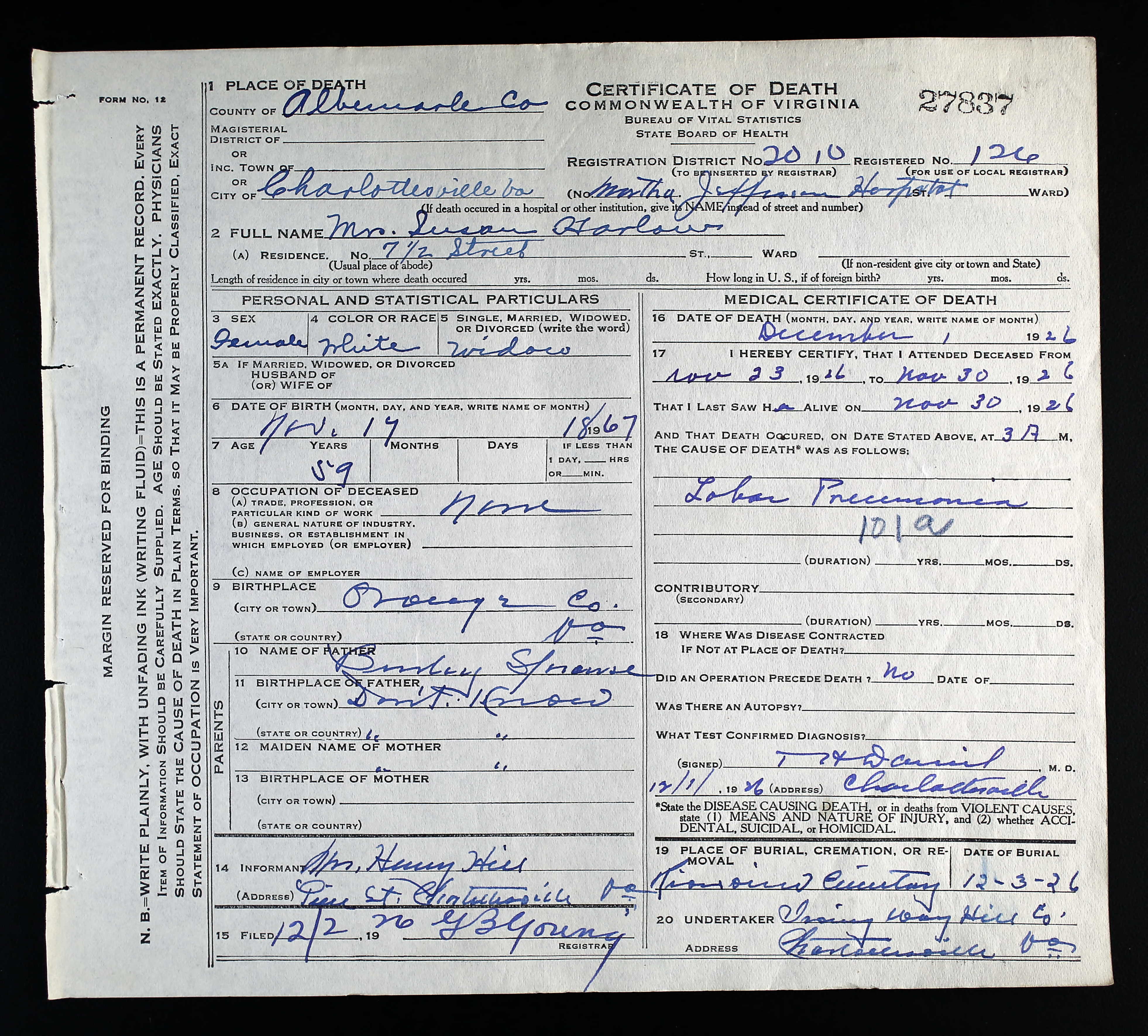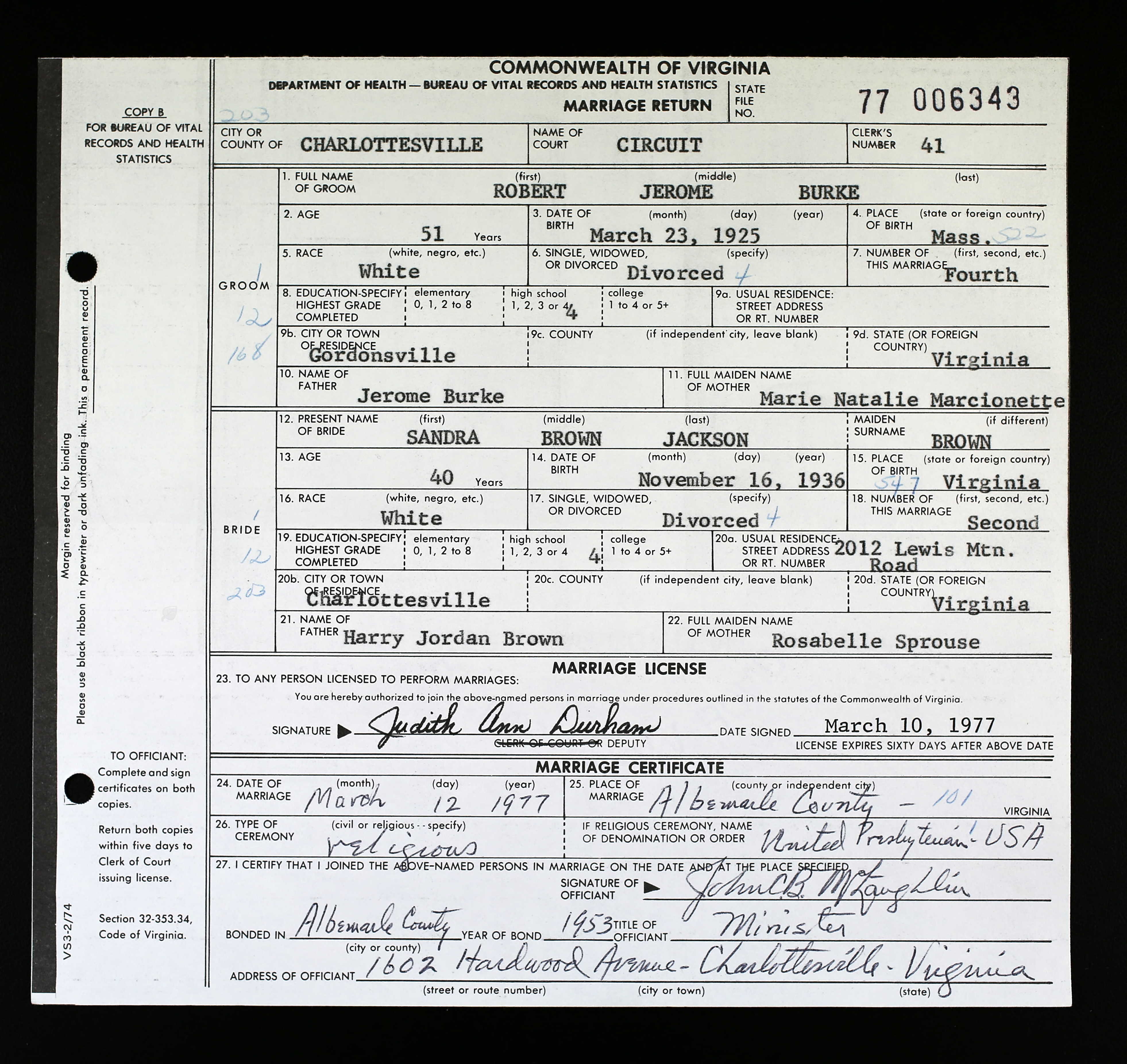 1087. Charlottesville, VA Marriage Records, Marriage Certificate.