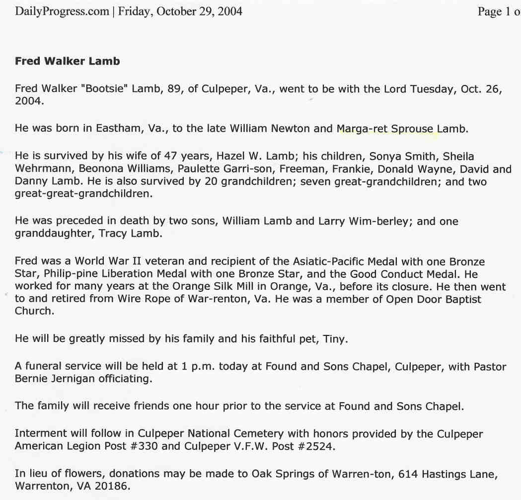 1068. Obituary, William Eugene Dabney Obituary, Charlottesville Daily Progress. Died November 7, 1978 Posted in "The Daily Progress", Charlottesville, Virginia on November 9, 1978 William Eugene Dabney William Eugene Dabney, 13, of Route 1, Keswick, died in a Charlottesville hospital Monday. A seventh grade student at Burley Middle School, he was born in Charlottesville on March 15, 1965, son of Douglas E. and Joyce Ann Marshall Dabney. Other survivors include his paternal grandmother, Carrie Dabney of Keswick; maternal grandfather, Clyde Marshall of Charlottesville; three brothers, Marty Dabney of Keswick, Donnie and Randy Dabney both of Charlottesville; one stepbrother, Rocky Lane Dabney of Keswick. Funeral services will be held at 4 p.m. Friday at Beaver Dam Baptist Church. Rev. Robert H. Bailey officiating, with burial in the church cemetery. The family will receive friends from 7-8 tonight at Joseph W. Teague Funeral Home.