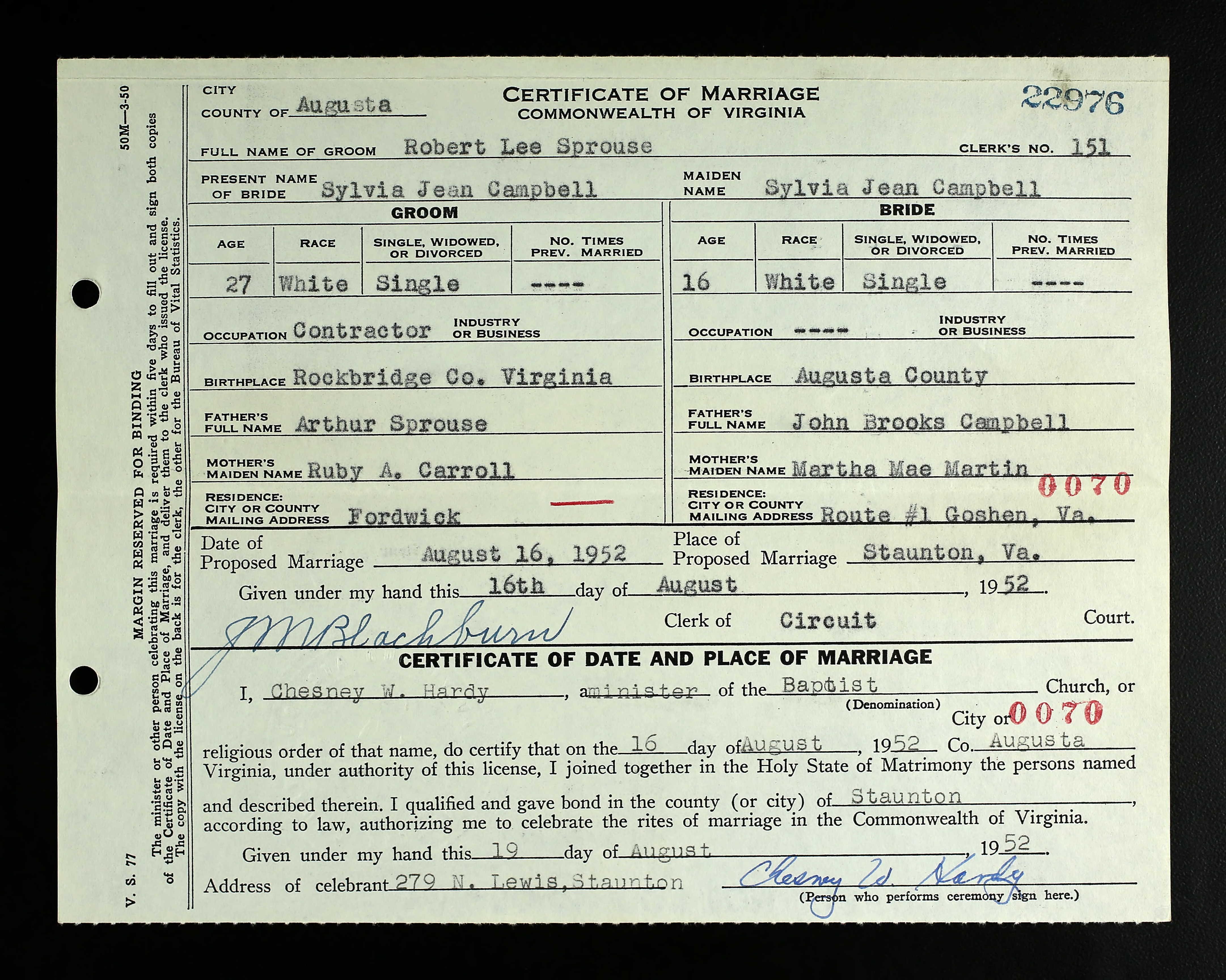 1067. Augusta County Clerk of Court, Virginia, Marriage Records, 1936-2014, 24698-24949.