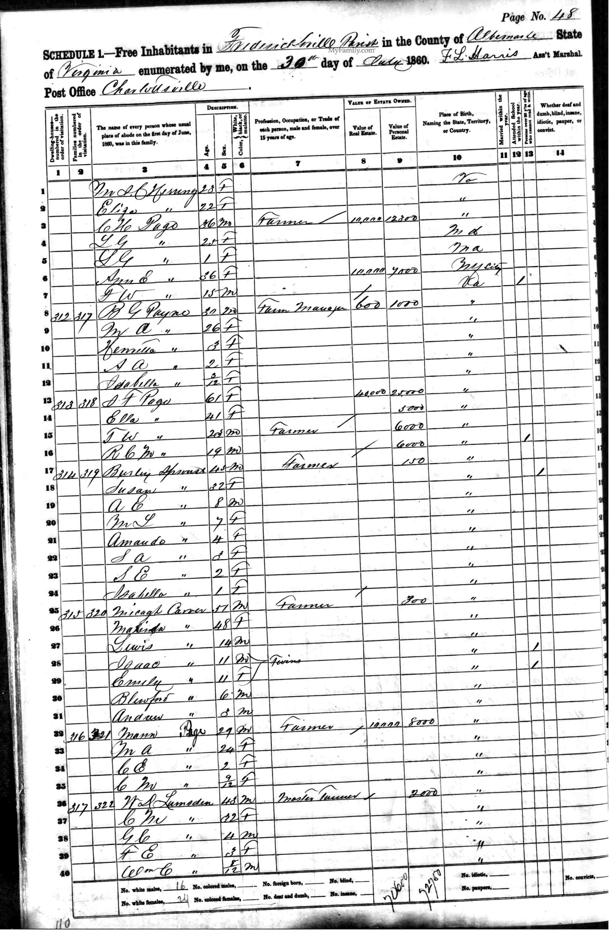 5. Census: John Carver and family, 2 Aug 1860, Fredericksville Parish, Albemarle County, Virginia, USA. 66