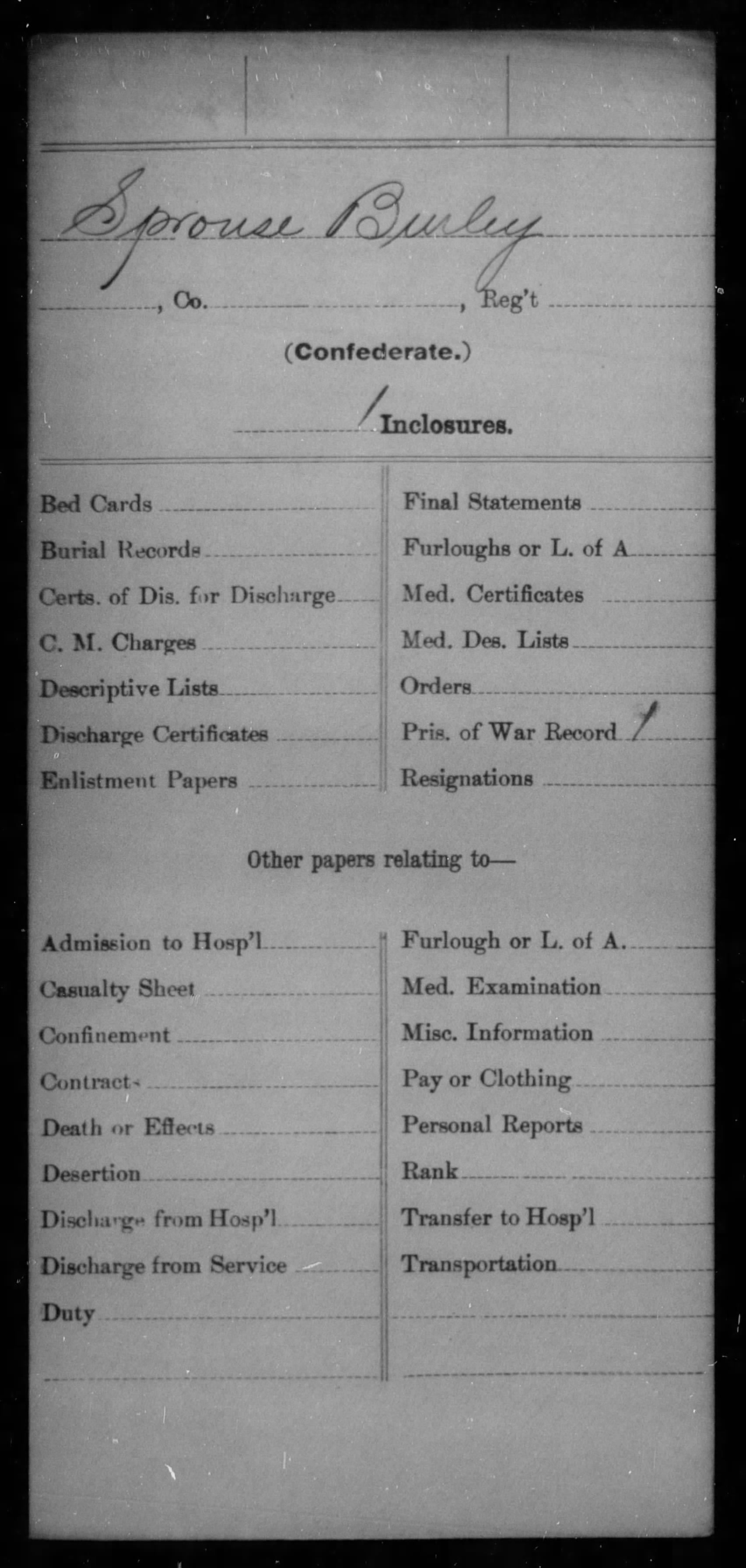 11. Military Service: received clothing general hospital, 15 Sep 1864, Charlottesville, Albemarle County, Virginia, USA.
