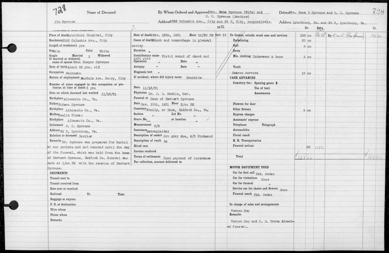 857. Hill's Lynchburg (Campbell County, VA) City Directory, p. 503, Sprouse.