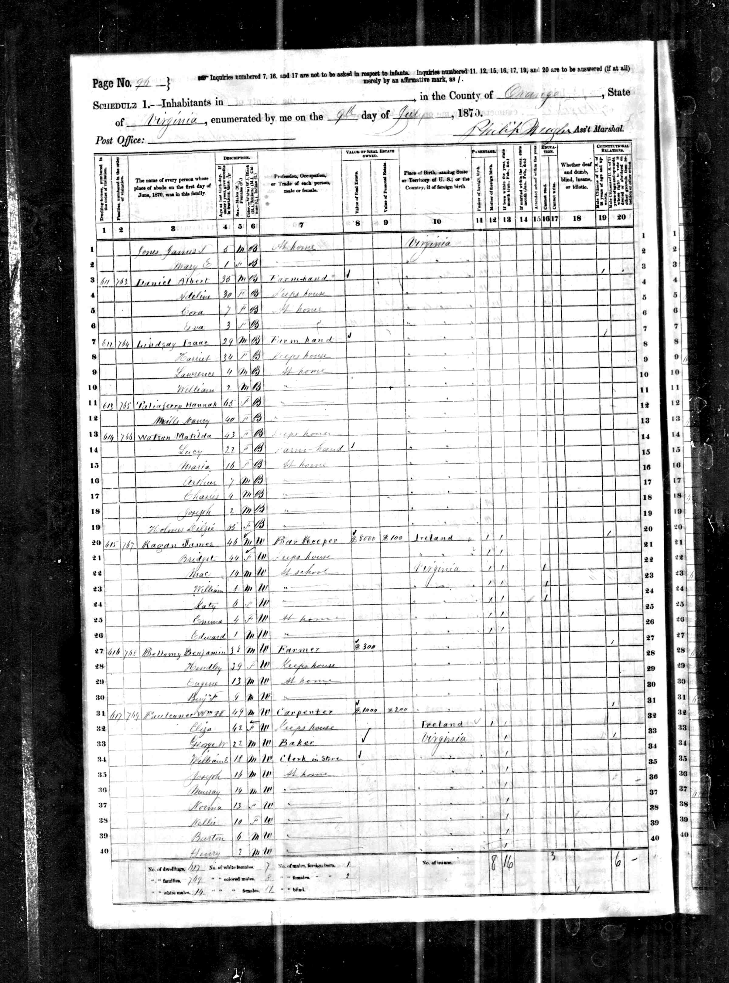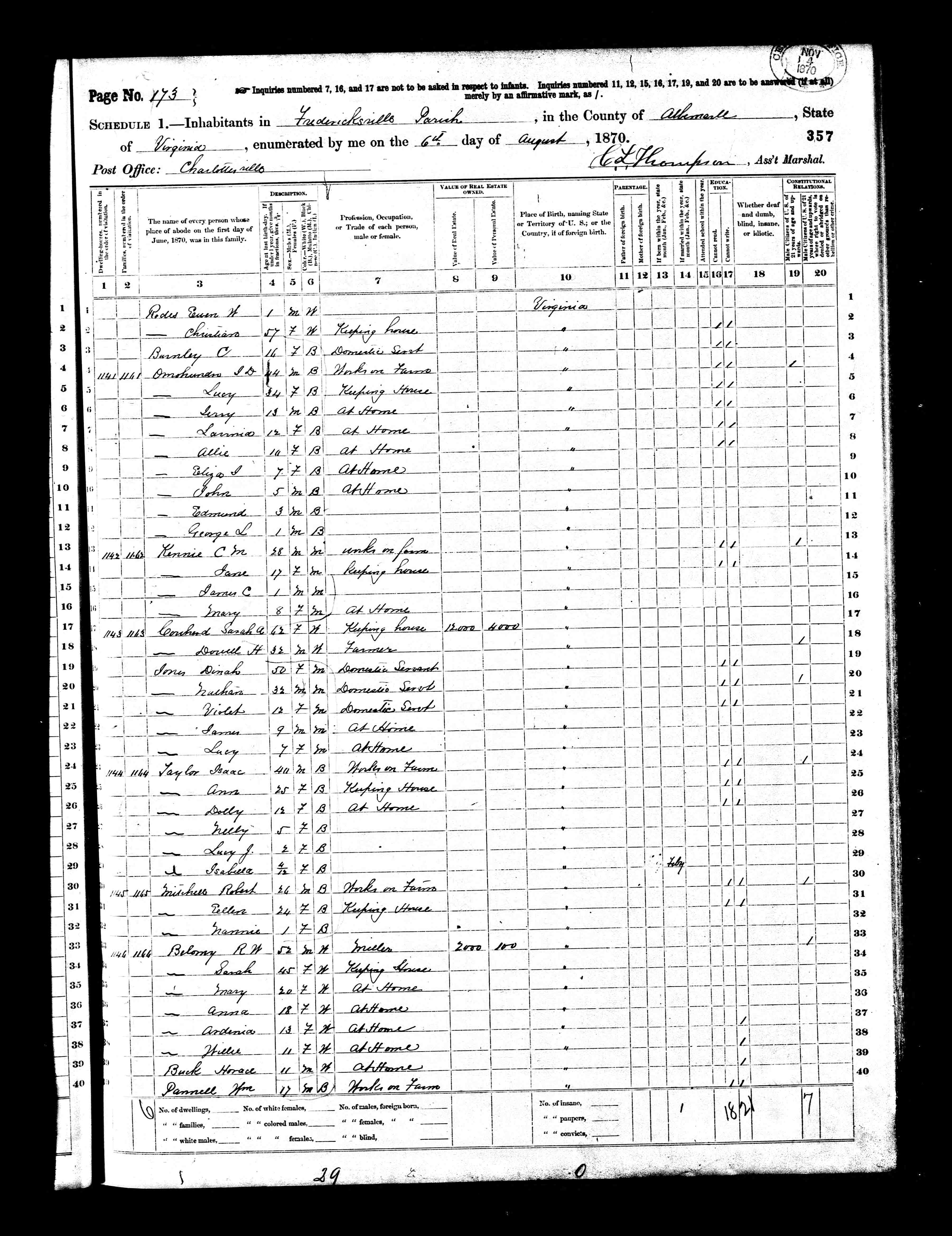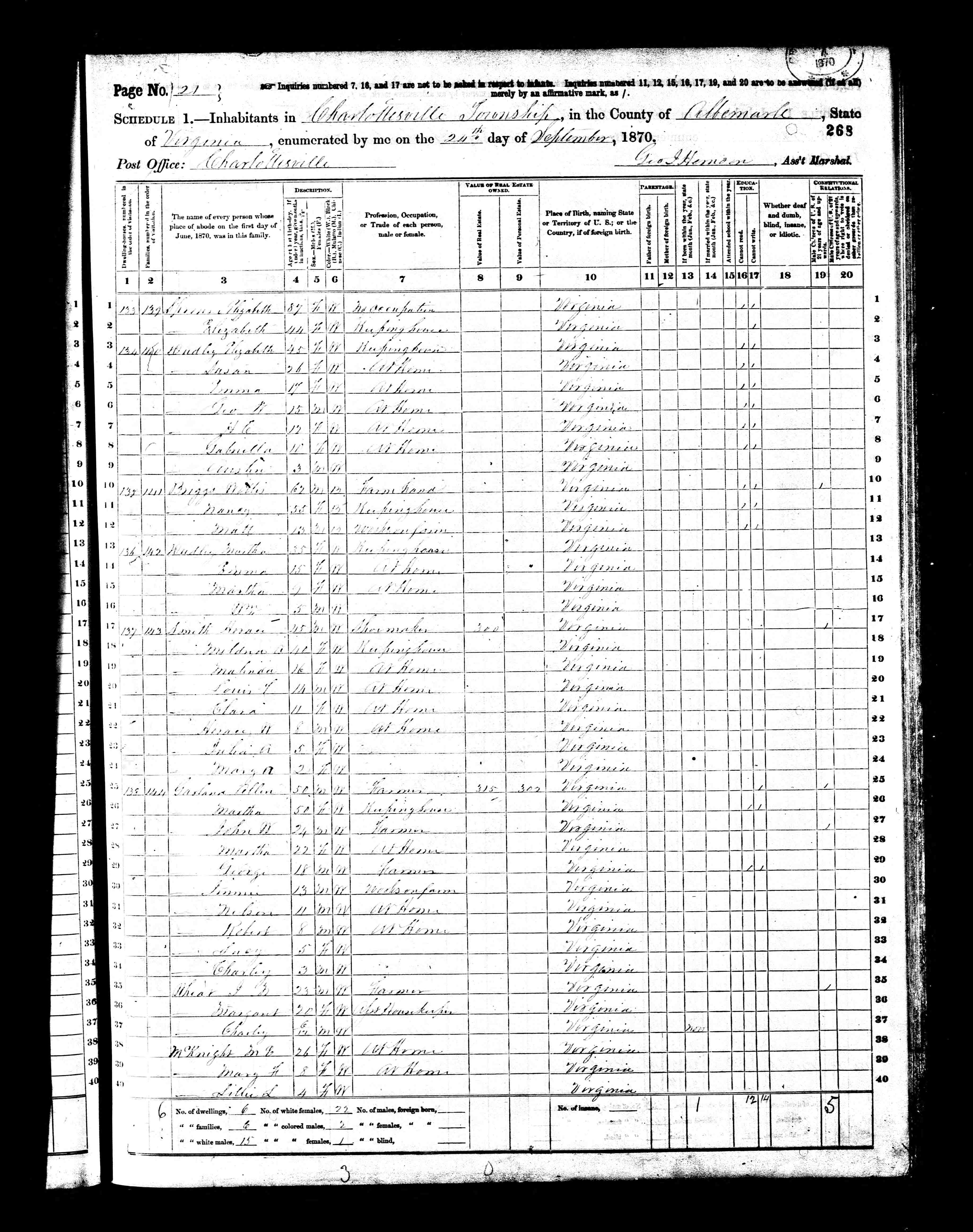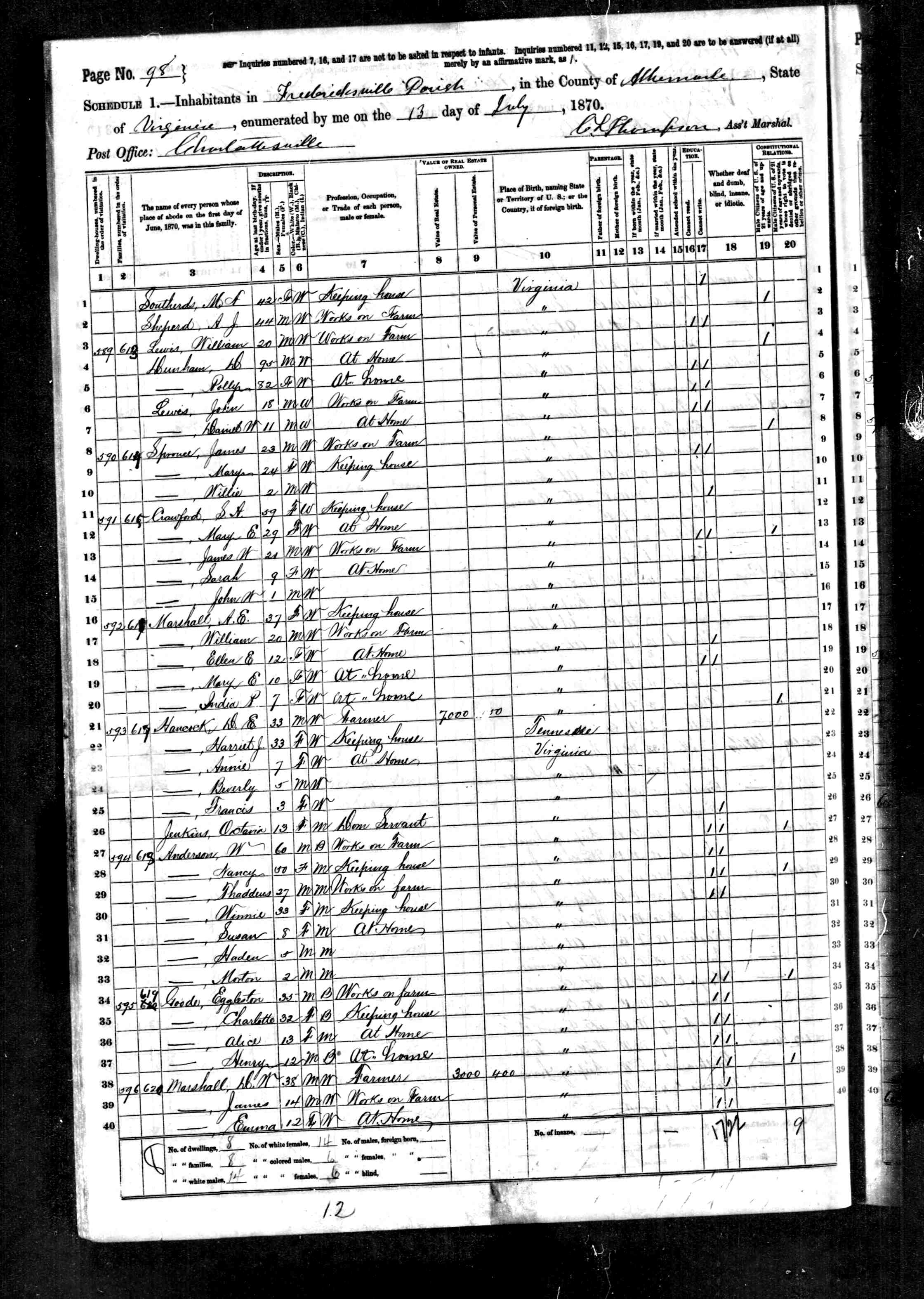 1. Census: James H. Sprouse and family, 13 Jul 1870, Fredericksville Parish, Albemarle County, Virginia, USA. 221