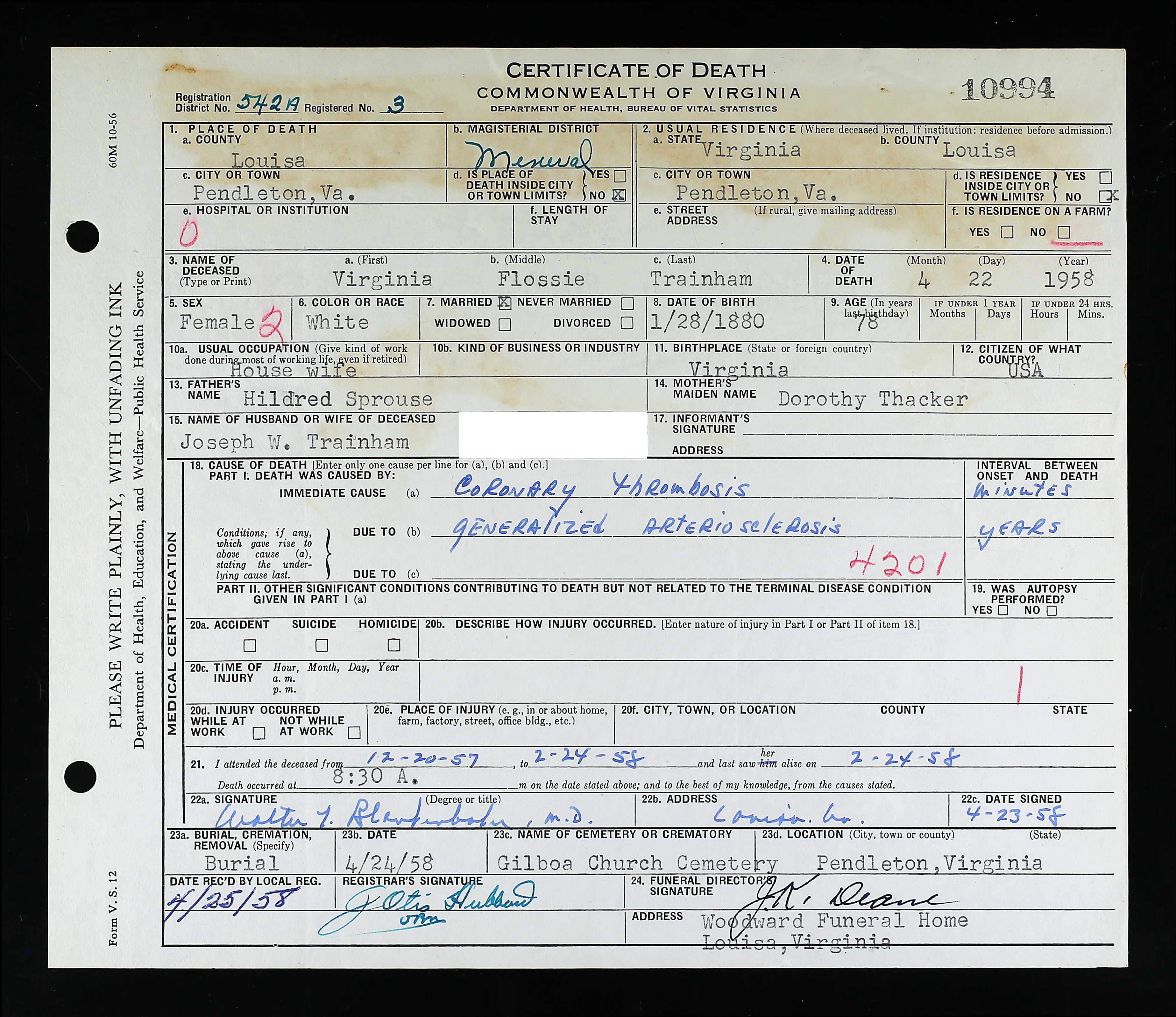 Deceased Name: Louisa -- Mrs. Annie Sprouse Thomas