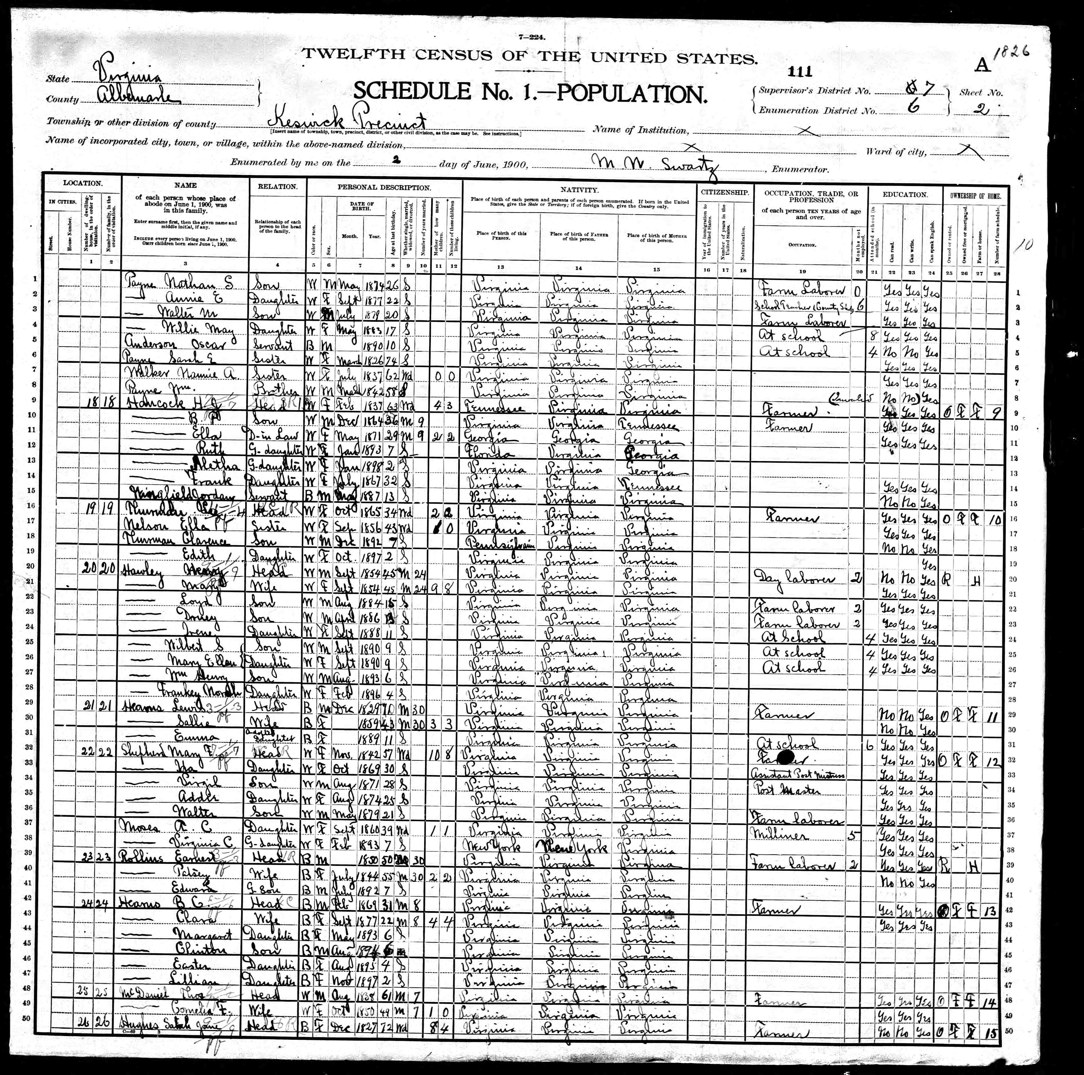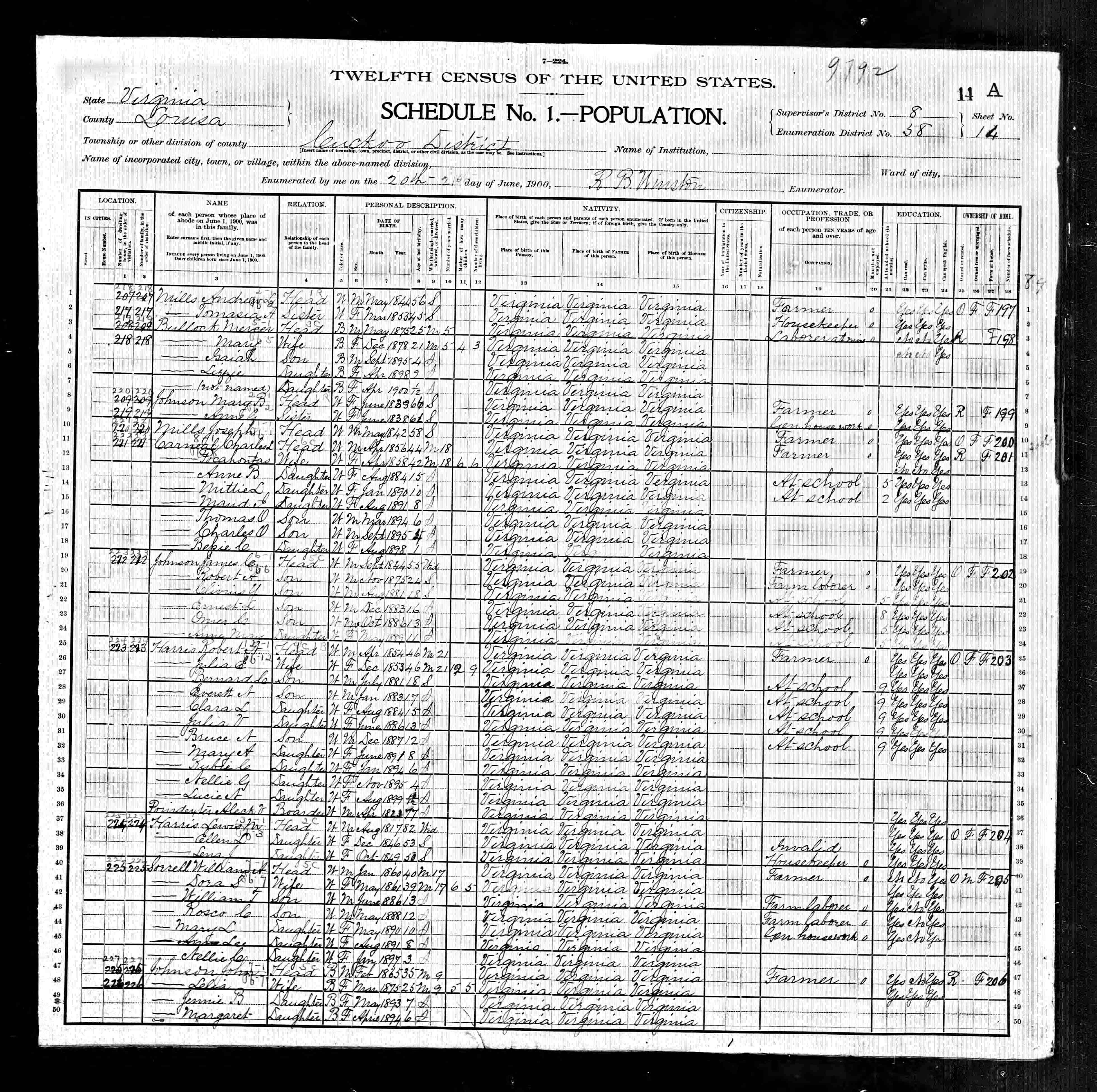 2. Census: Willie Sprouse and family, 20 Jun 1900, Cuckoo, Louisa County, Virginia, USA. 222