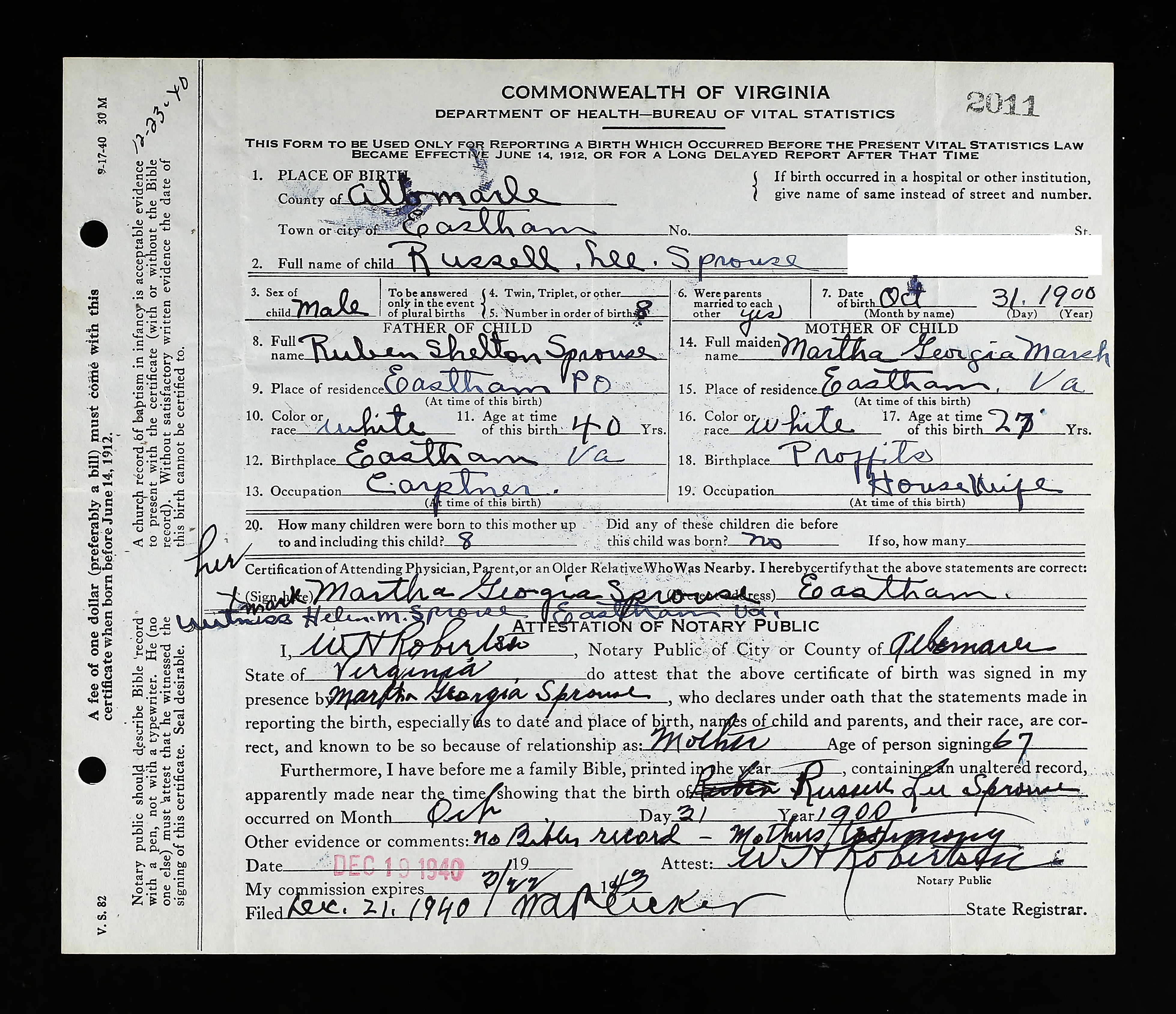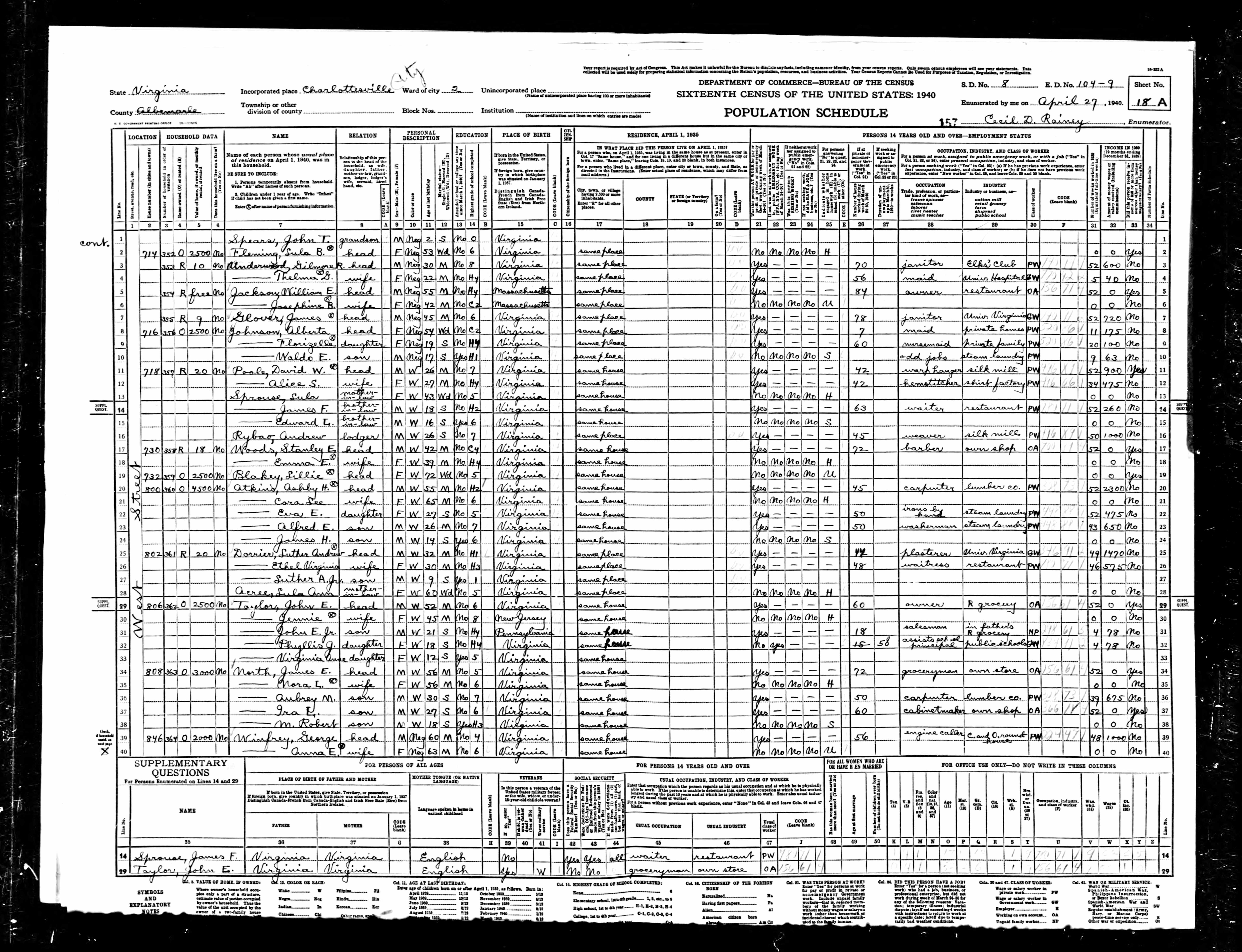 878. 1940 Virginia Census, Albemarle, Rivanna, ED 2-6, Sht 8A, Image 35 Roll T627.
