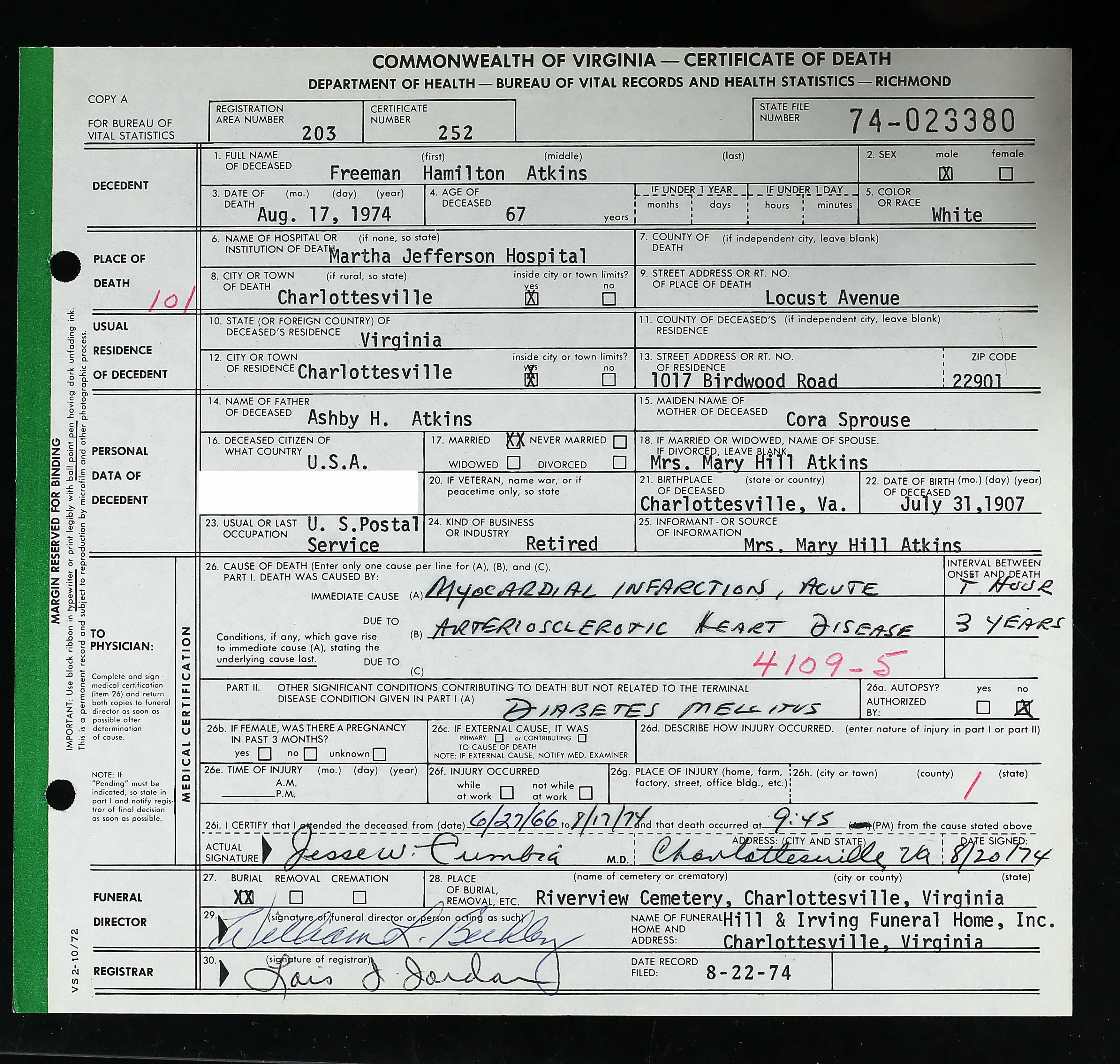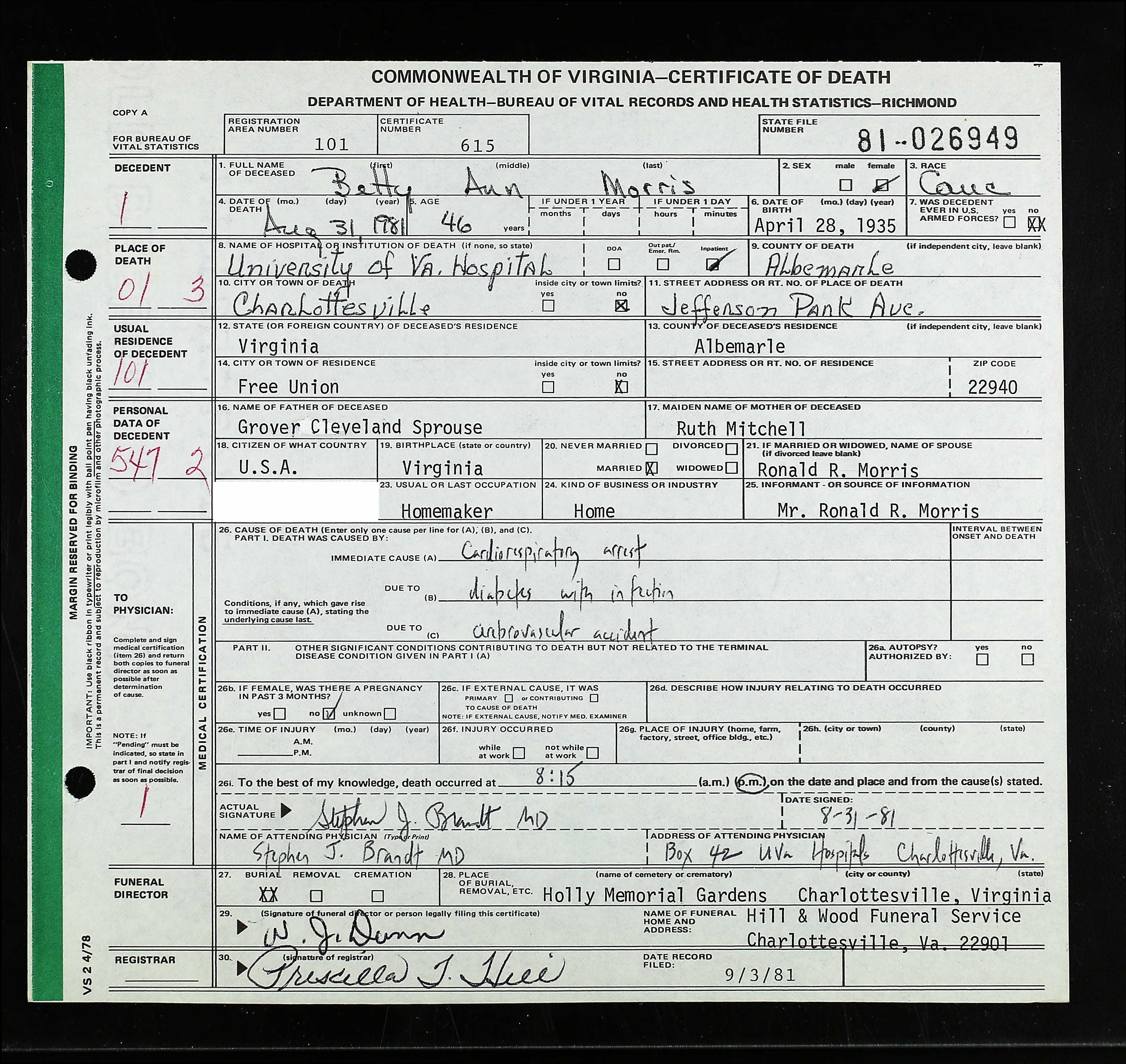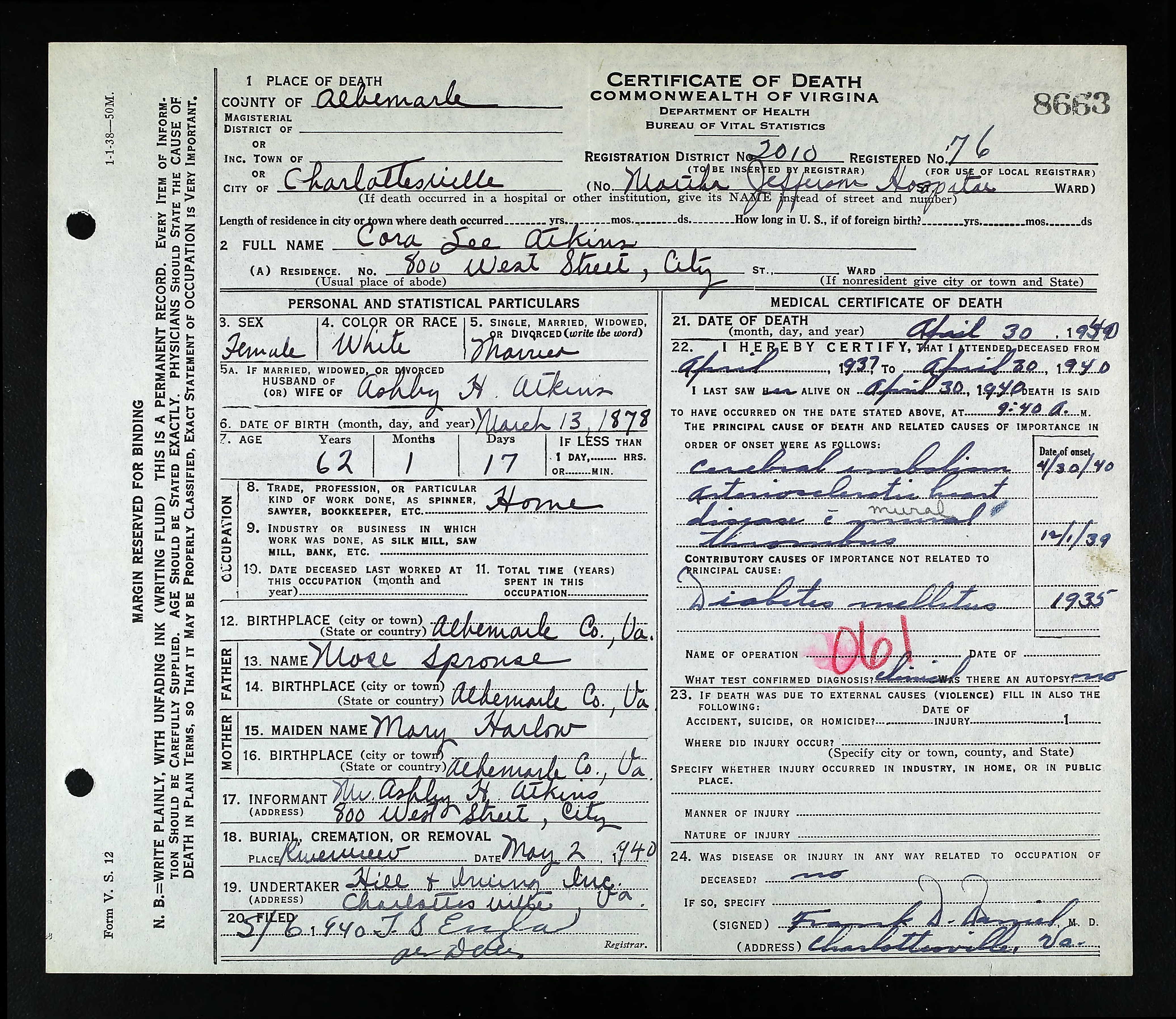 860. Death Certificate, Diuguid Funeral Home Burial Record.