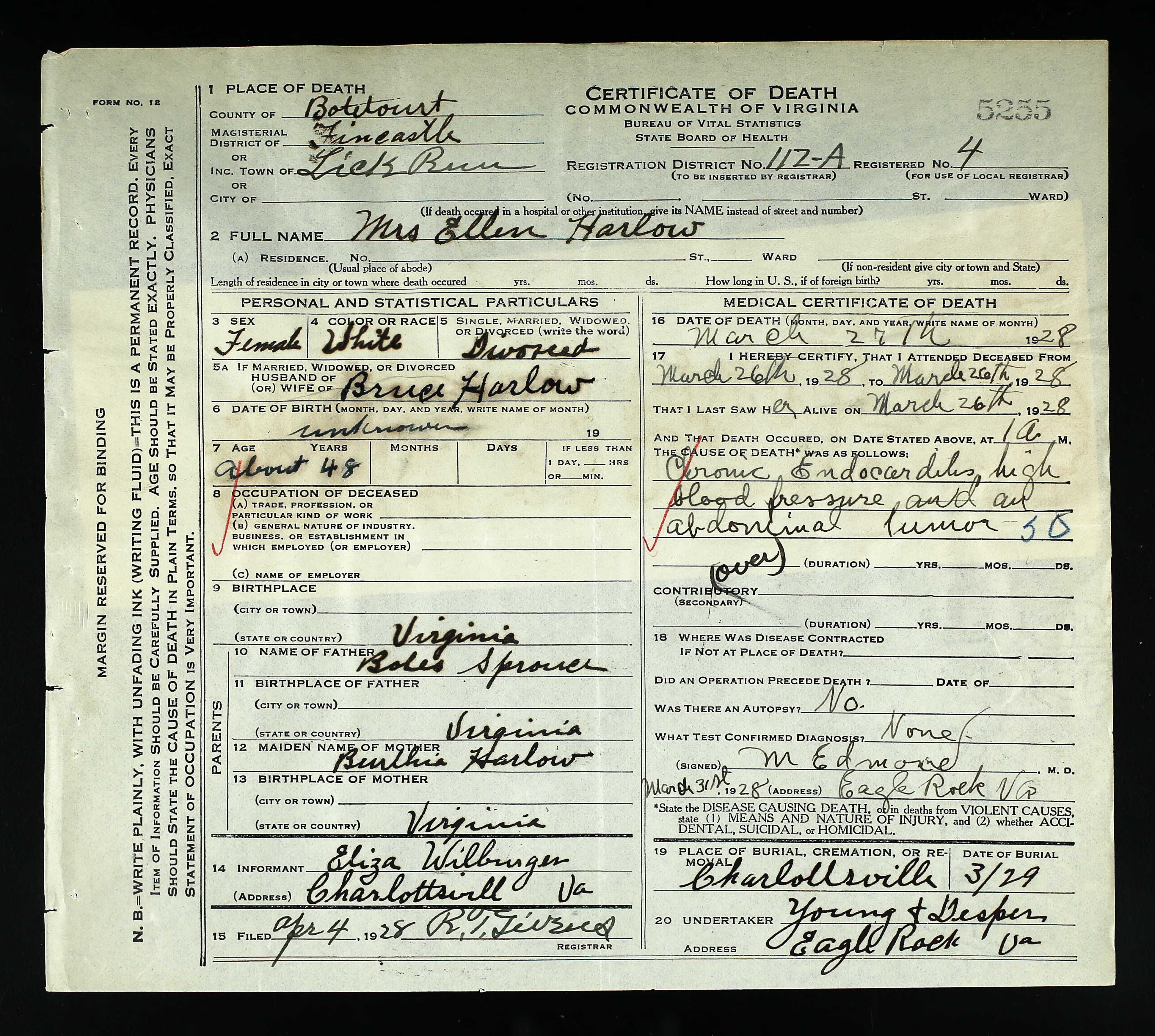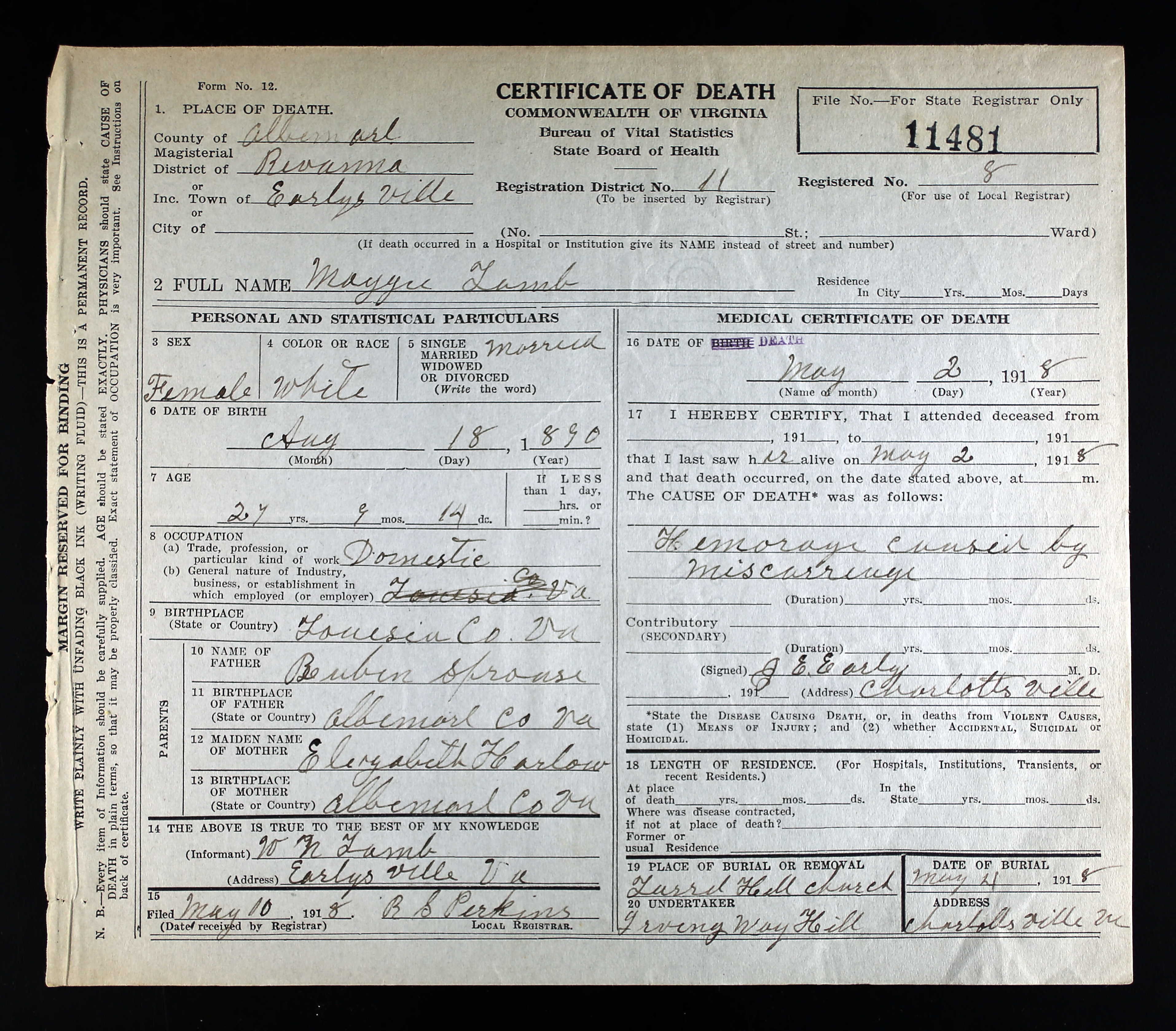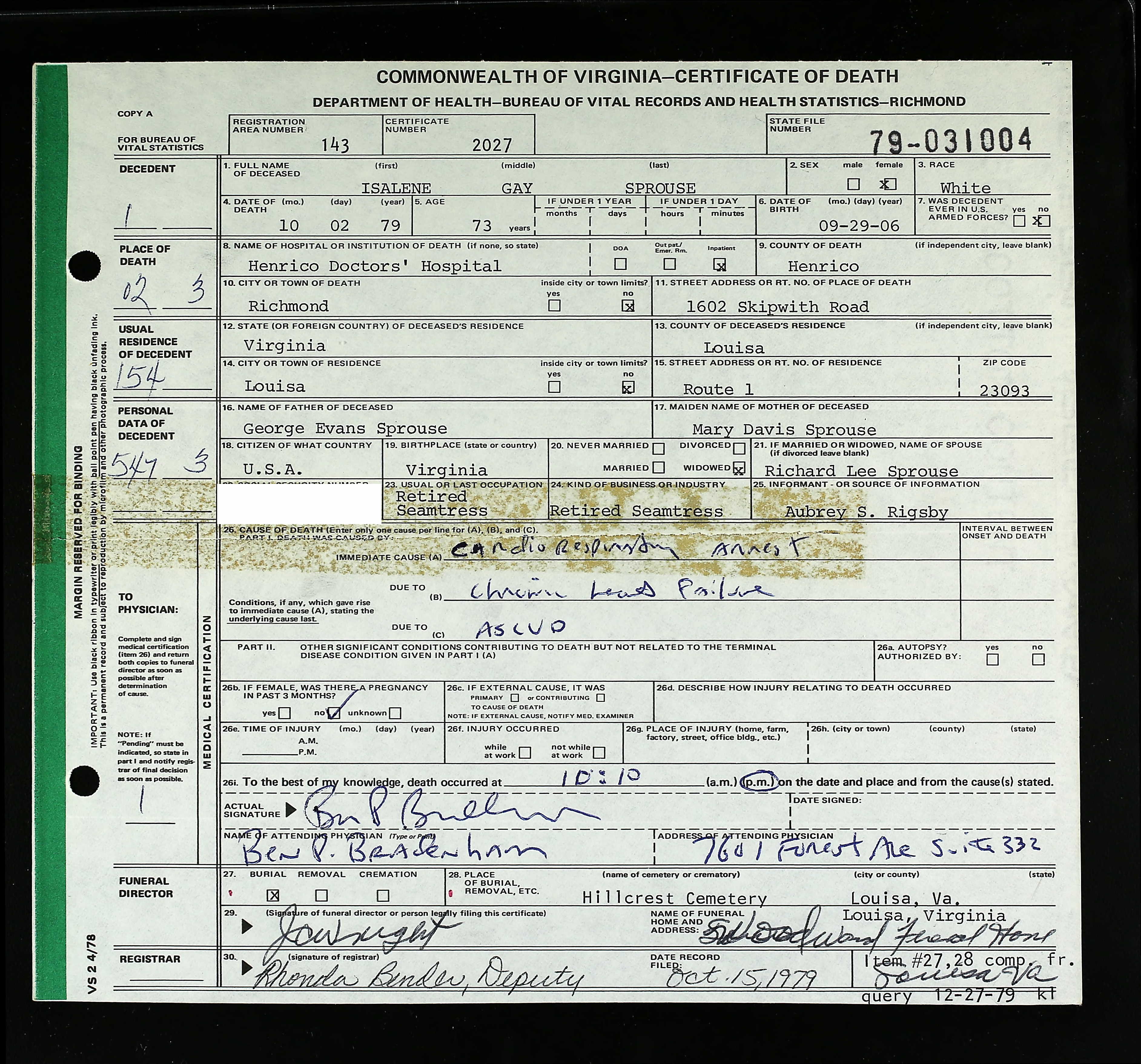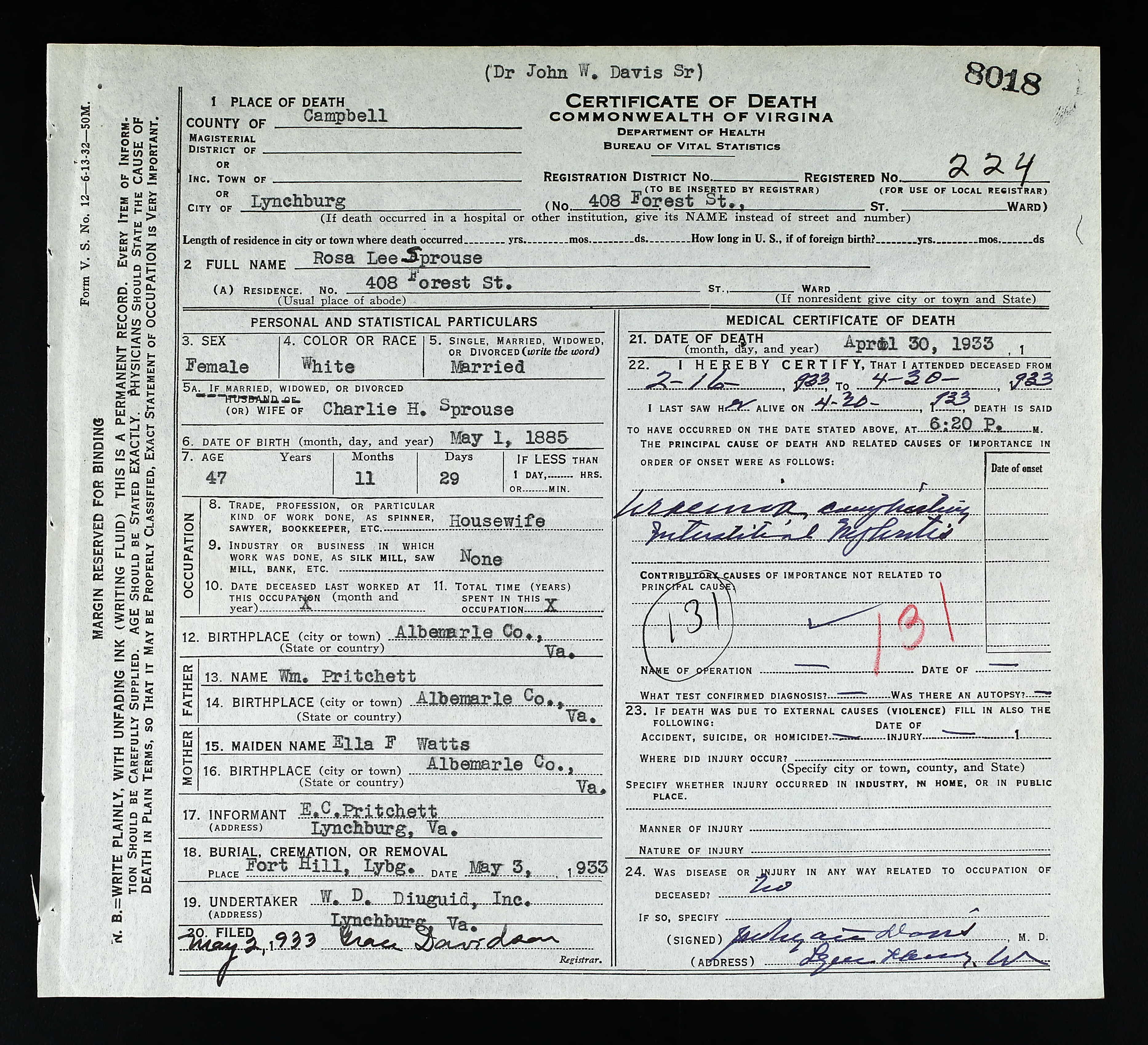 869. Death Certificate, Etta Louise Sprouse.