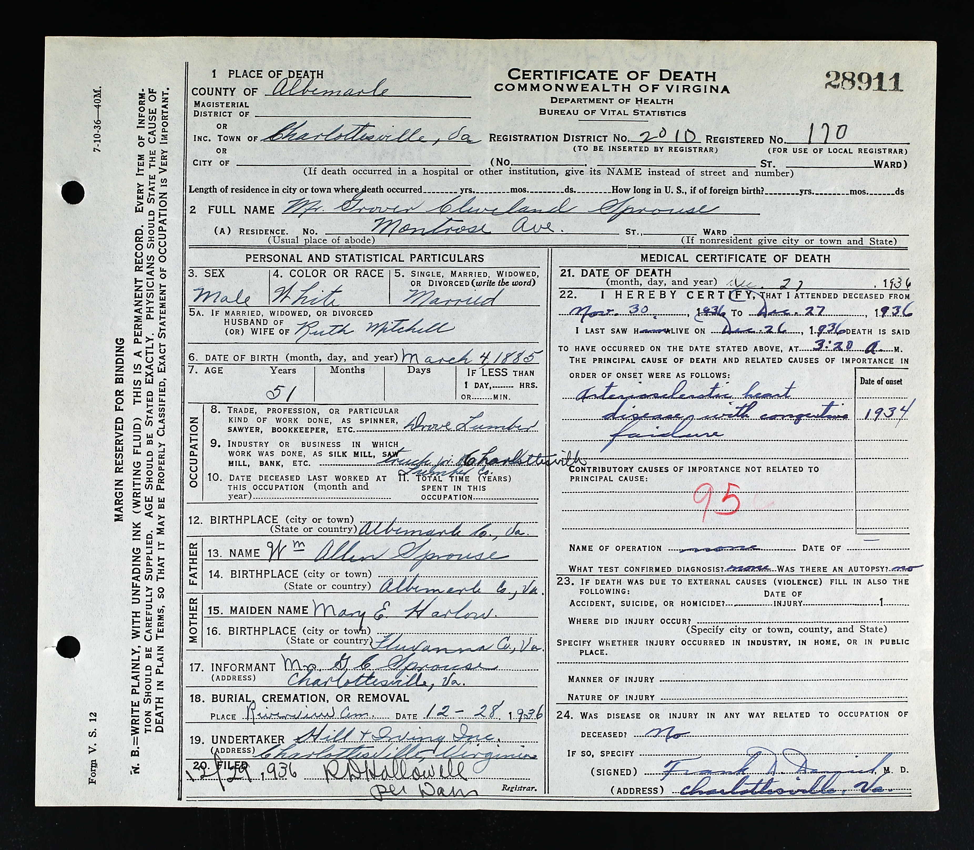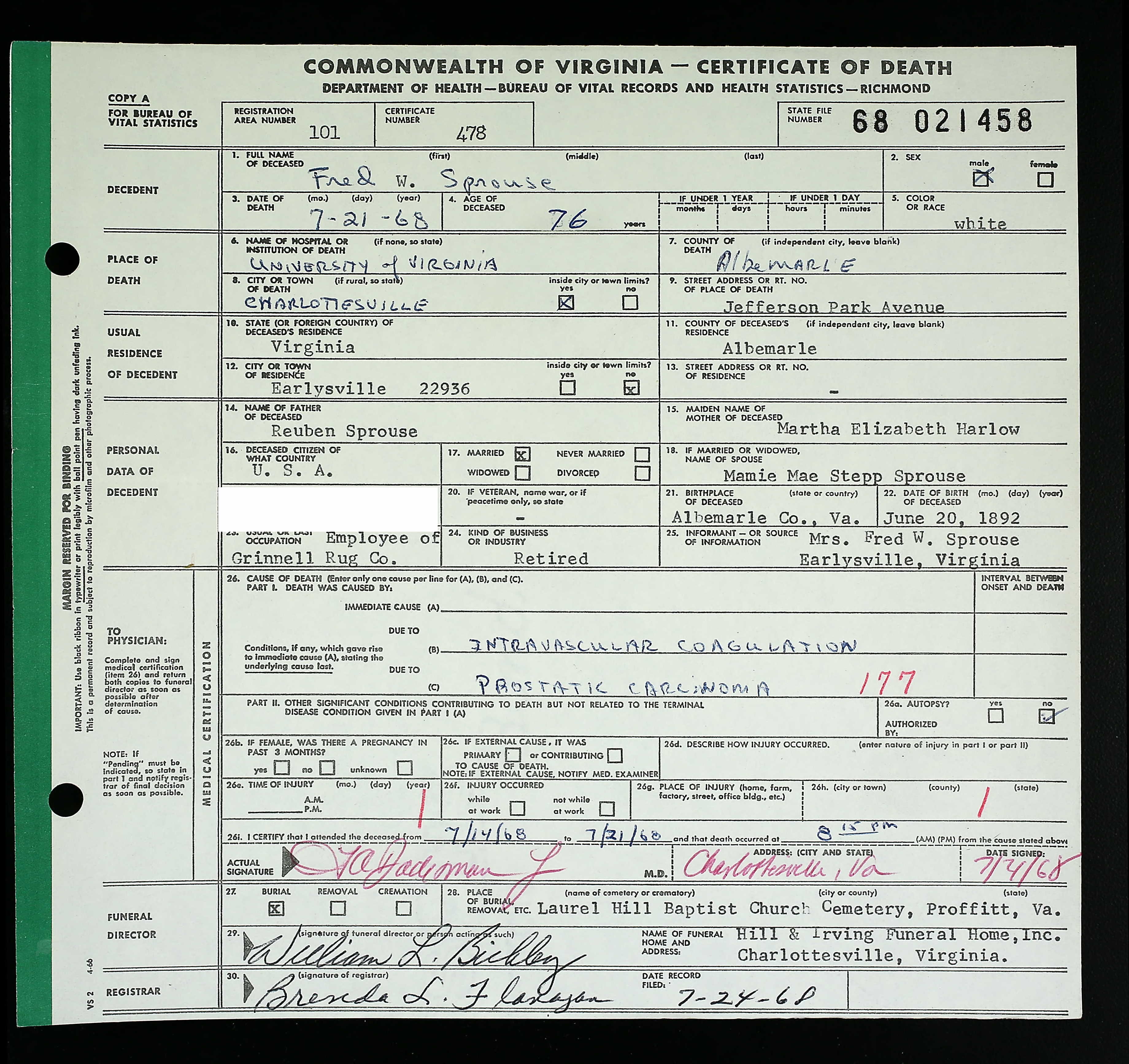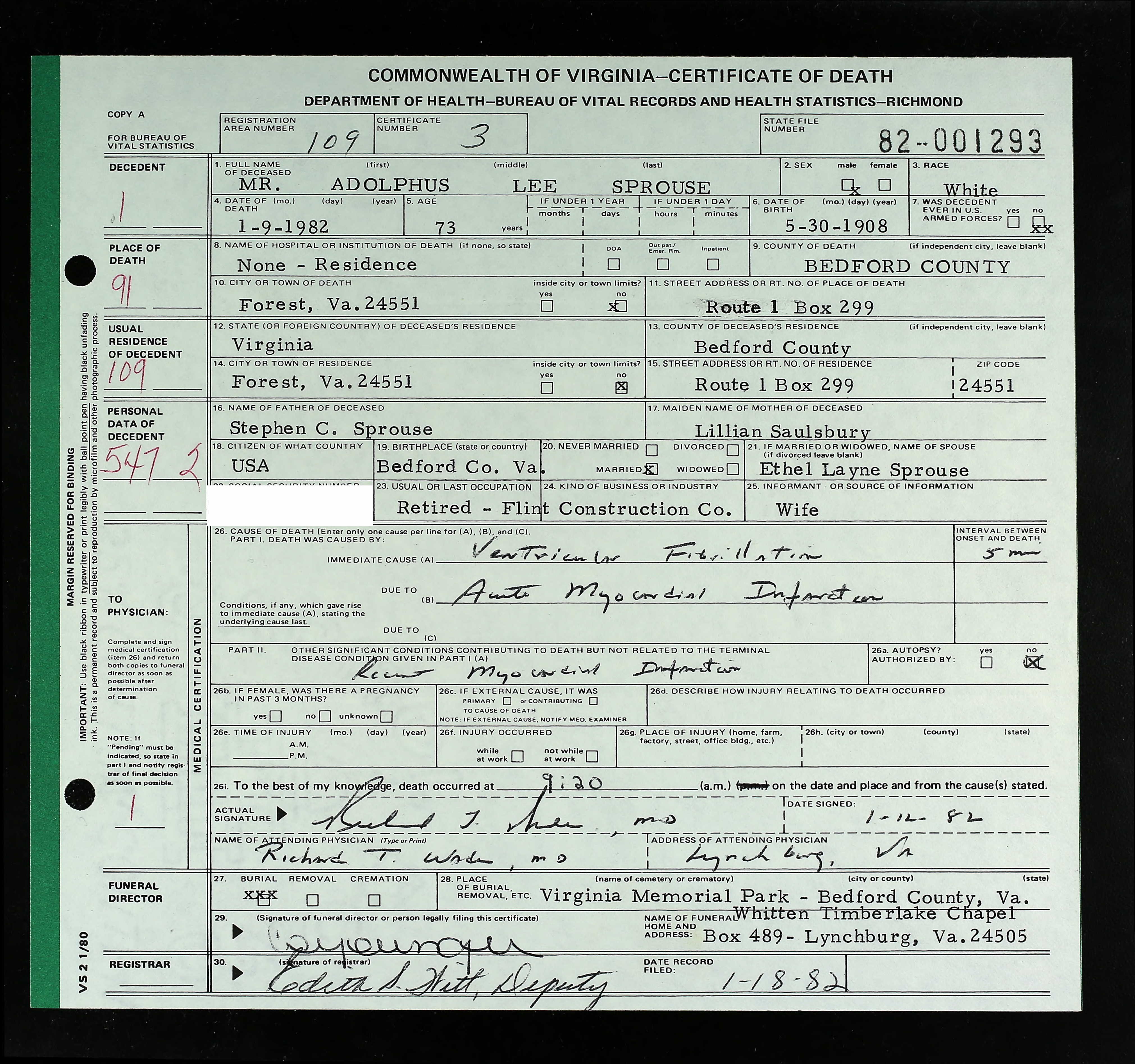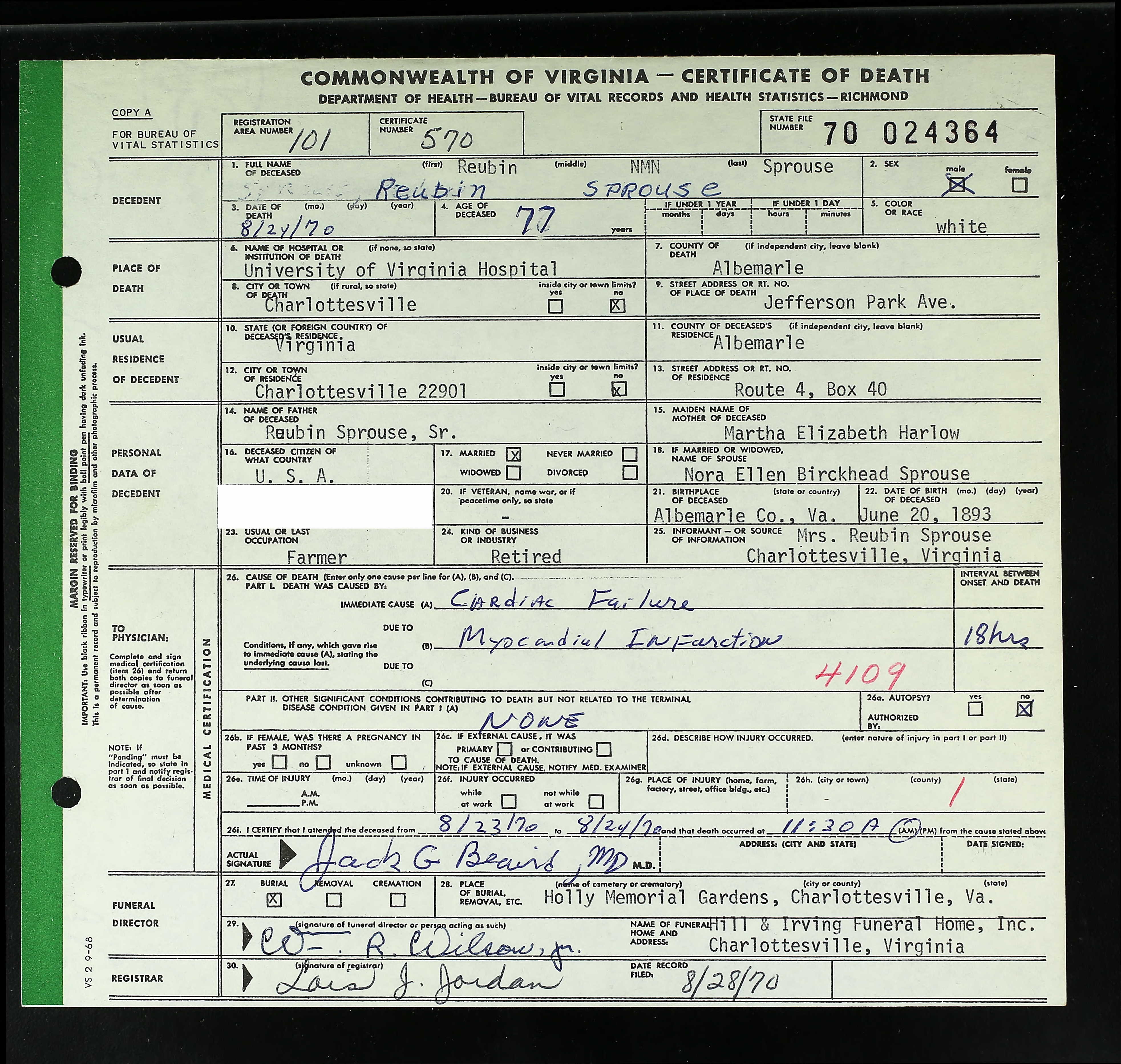 853. Death Certificate, Robert Sydnor Sprouse.