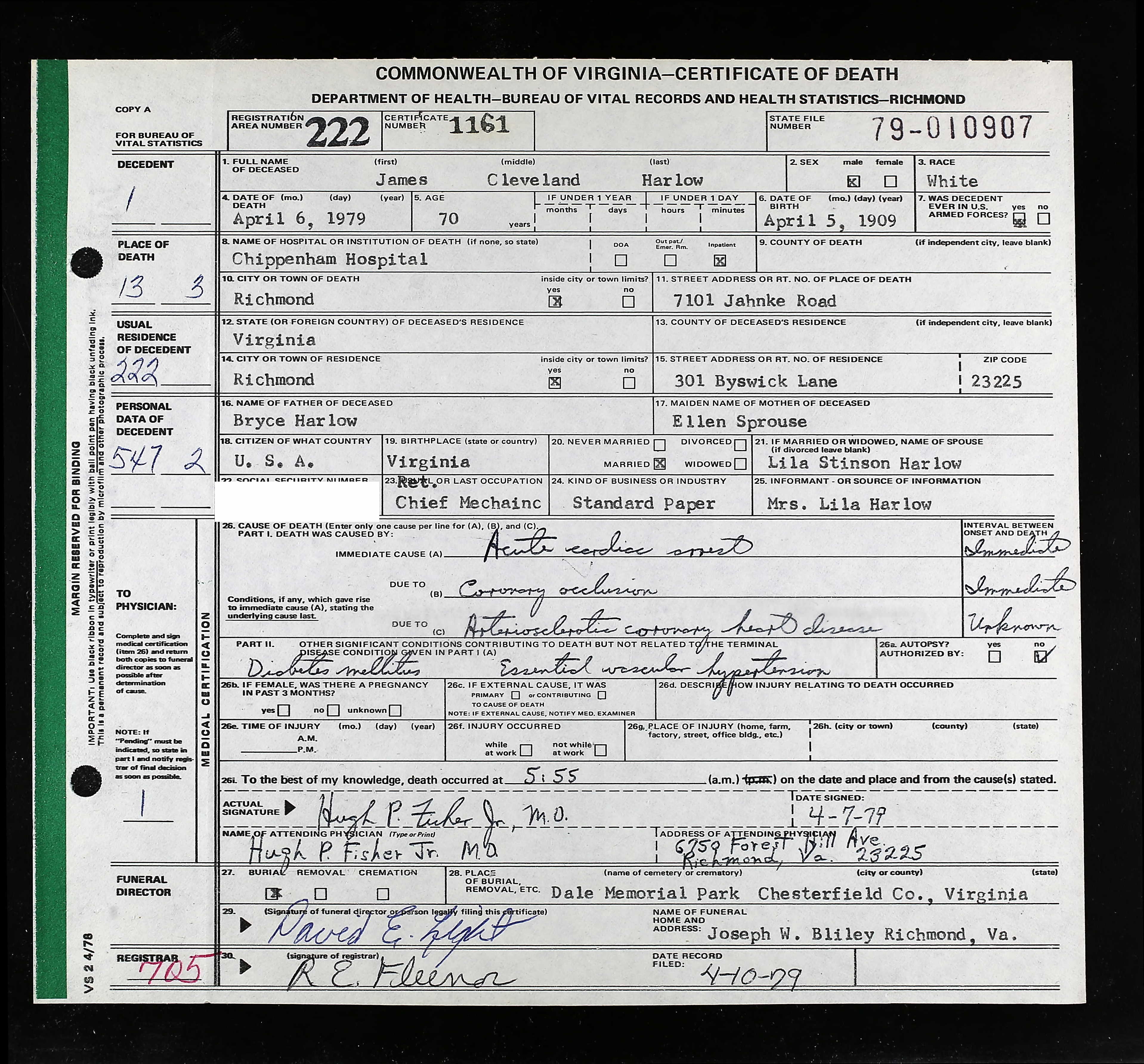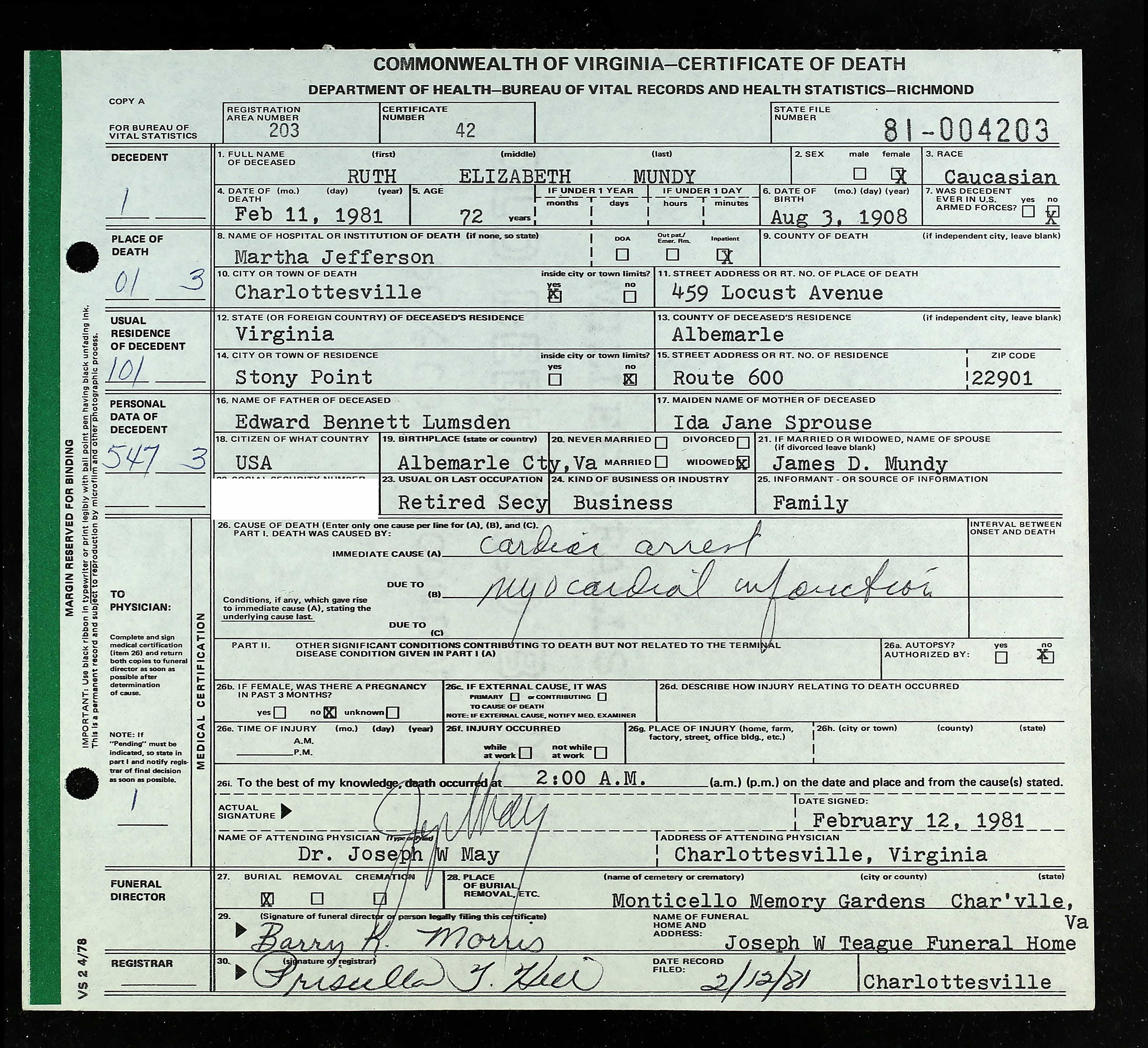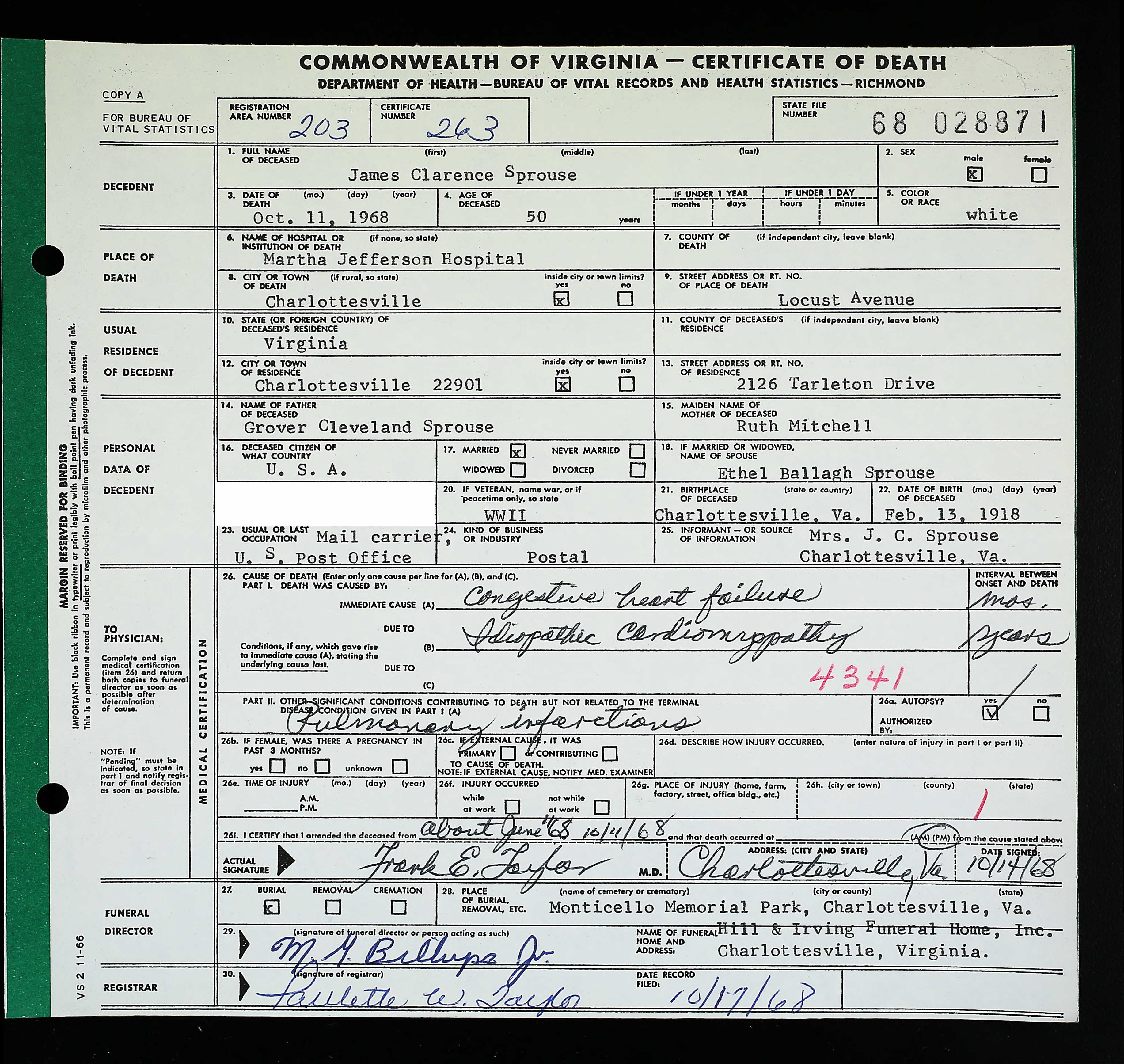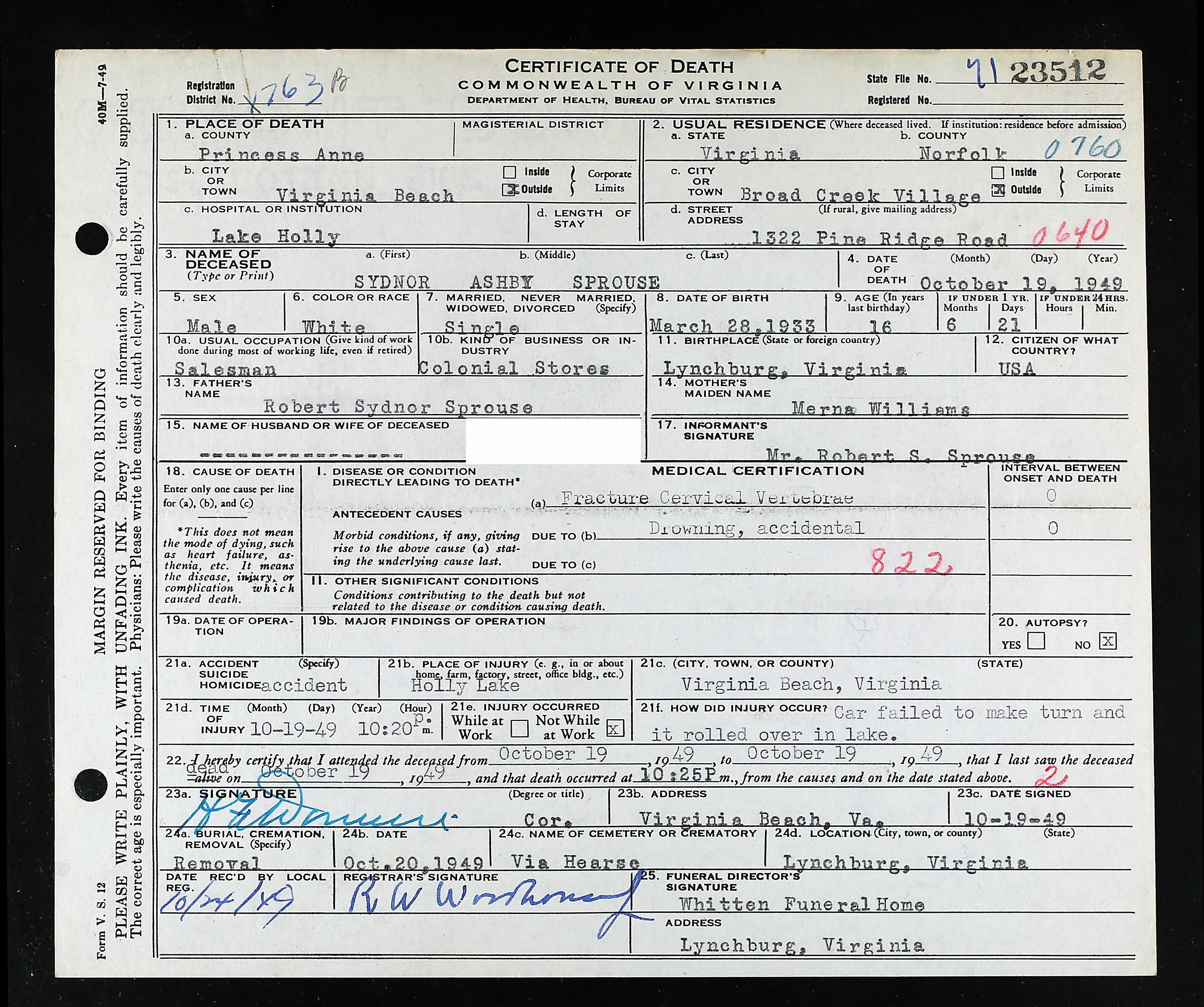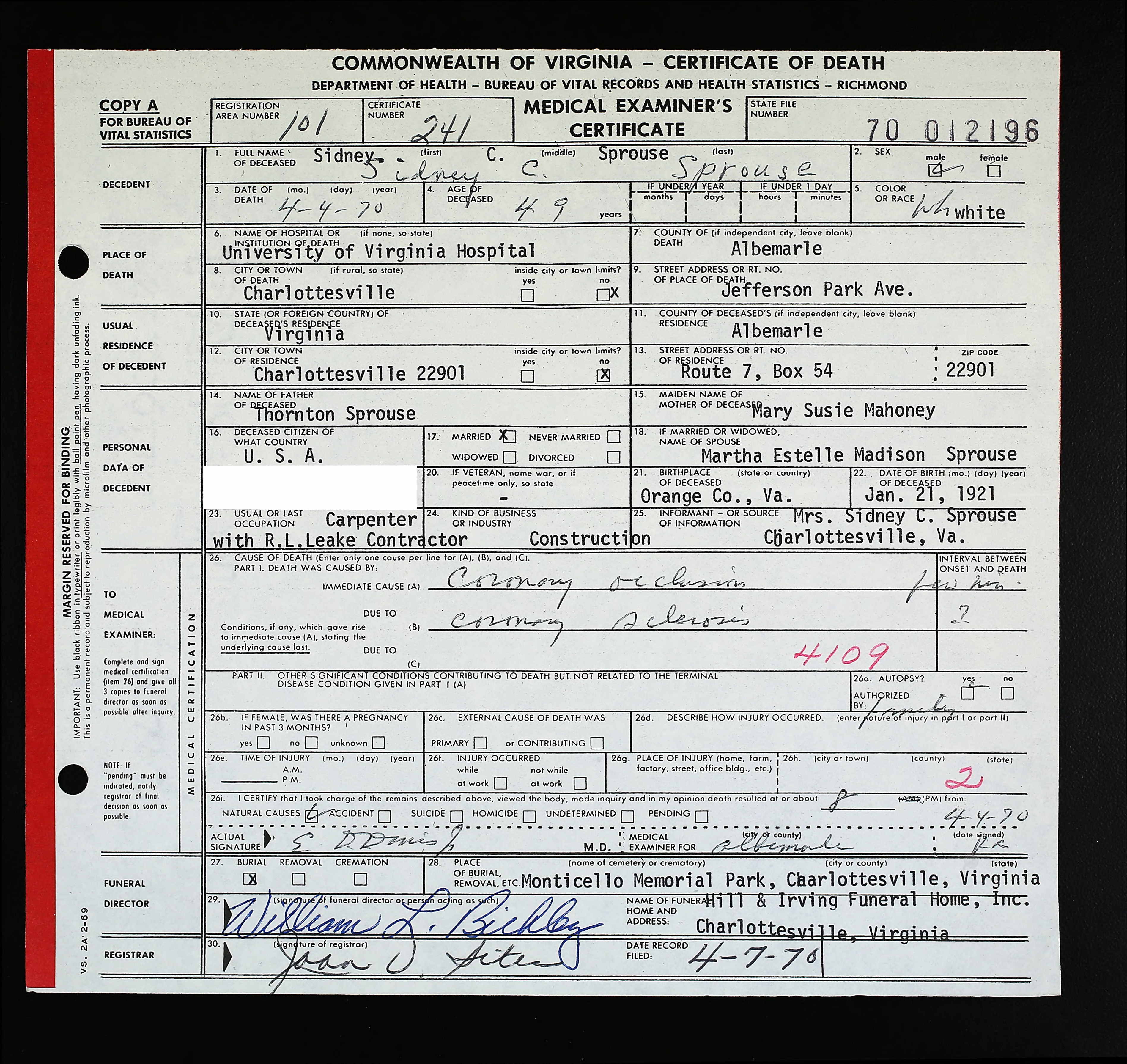 853. Death Certificate, Robert Sydnor Sprouse.