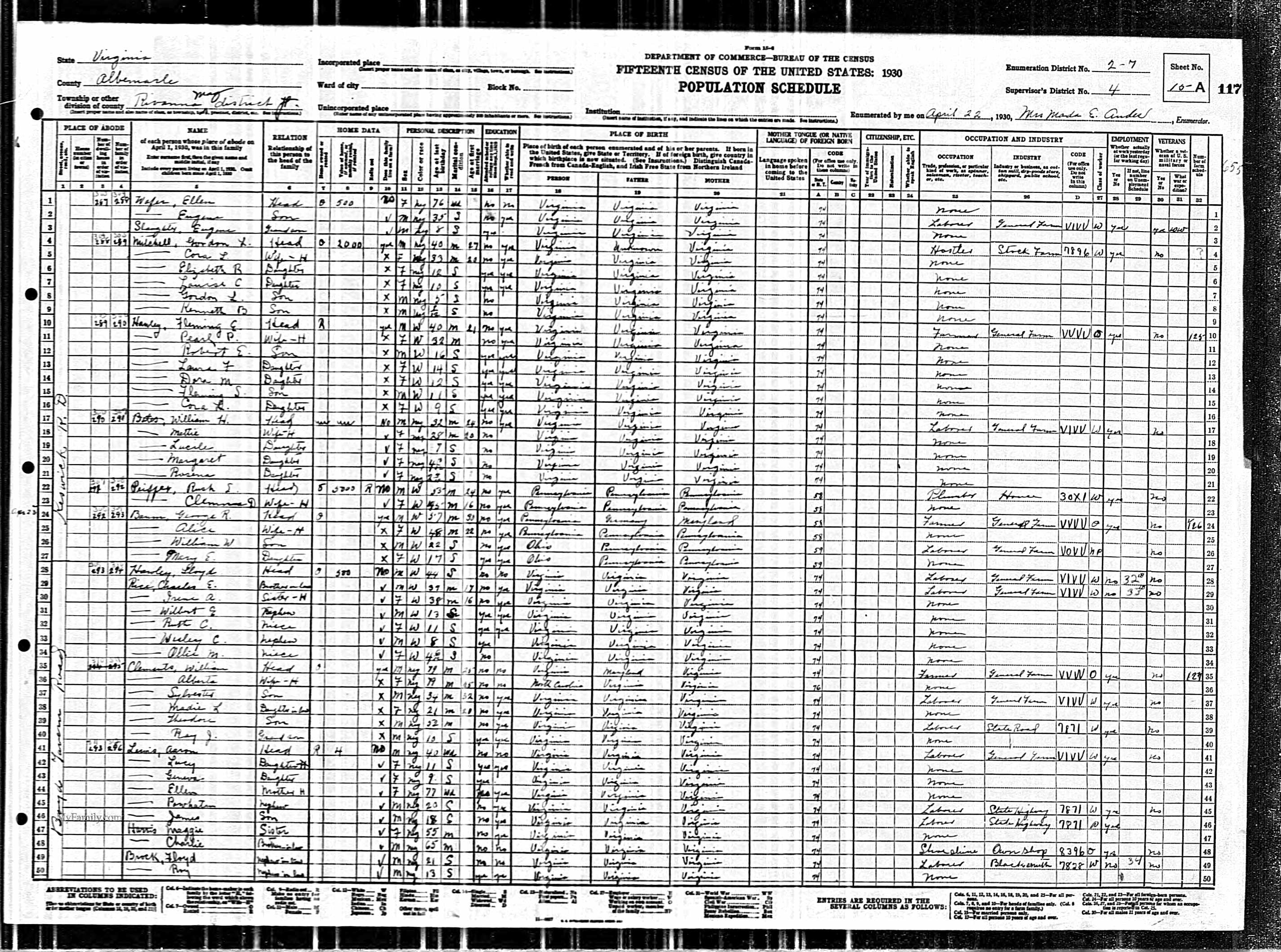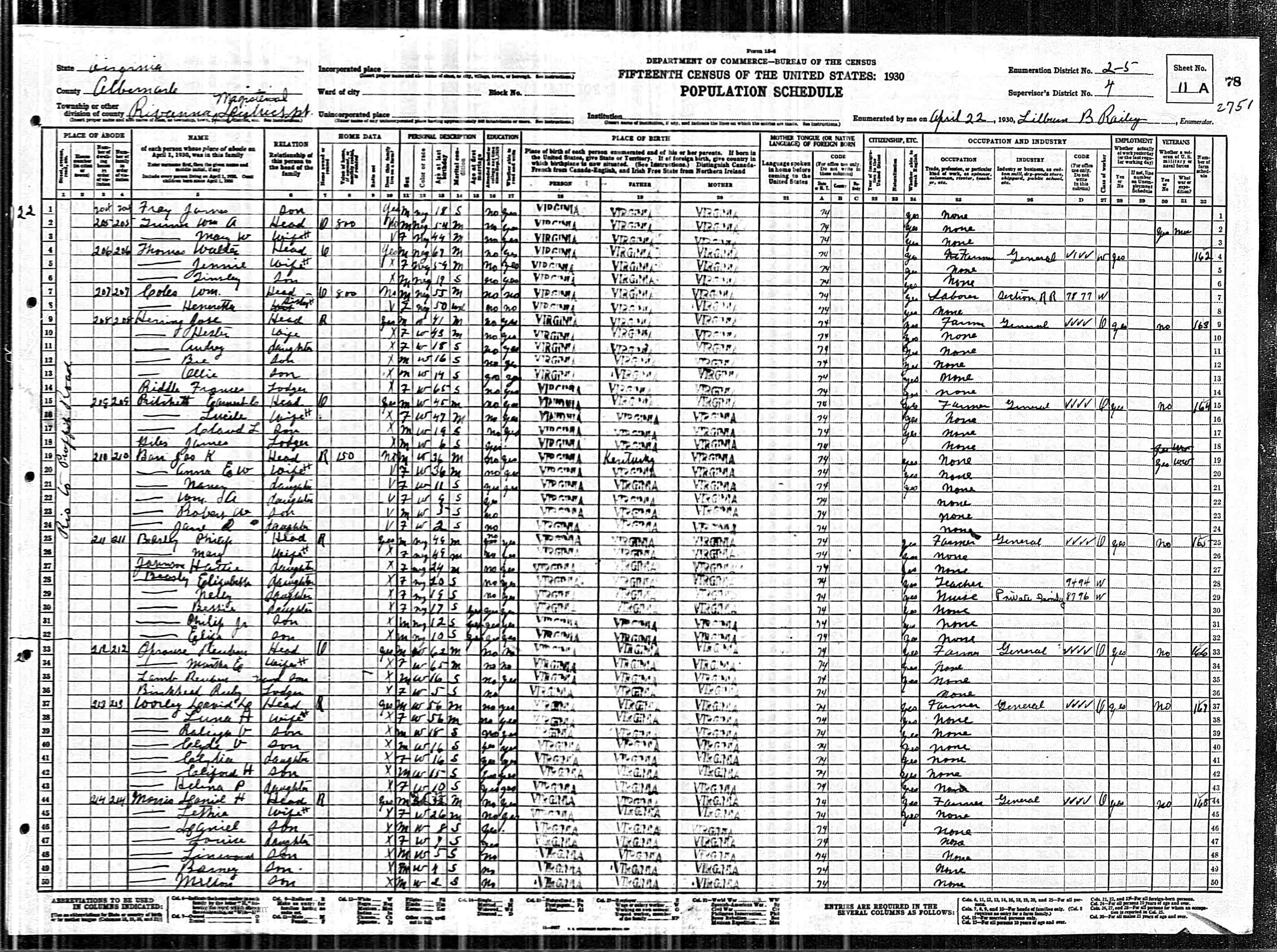 877. 1930 Virginia Census, Albemarle, Rivanna, ED 6, Sht 4B.
