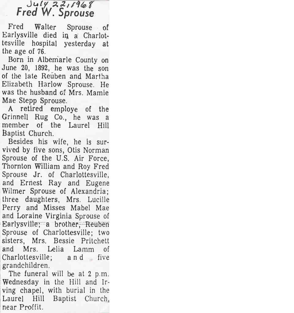 + 343 vi. Curtis N. Sprouse was born about 1908 in Mineral, Louisa County, Virginia, USA and was buried in Hillcrest Cemetery, Louisa, Louisa County, Virginia, USA.
