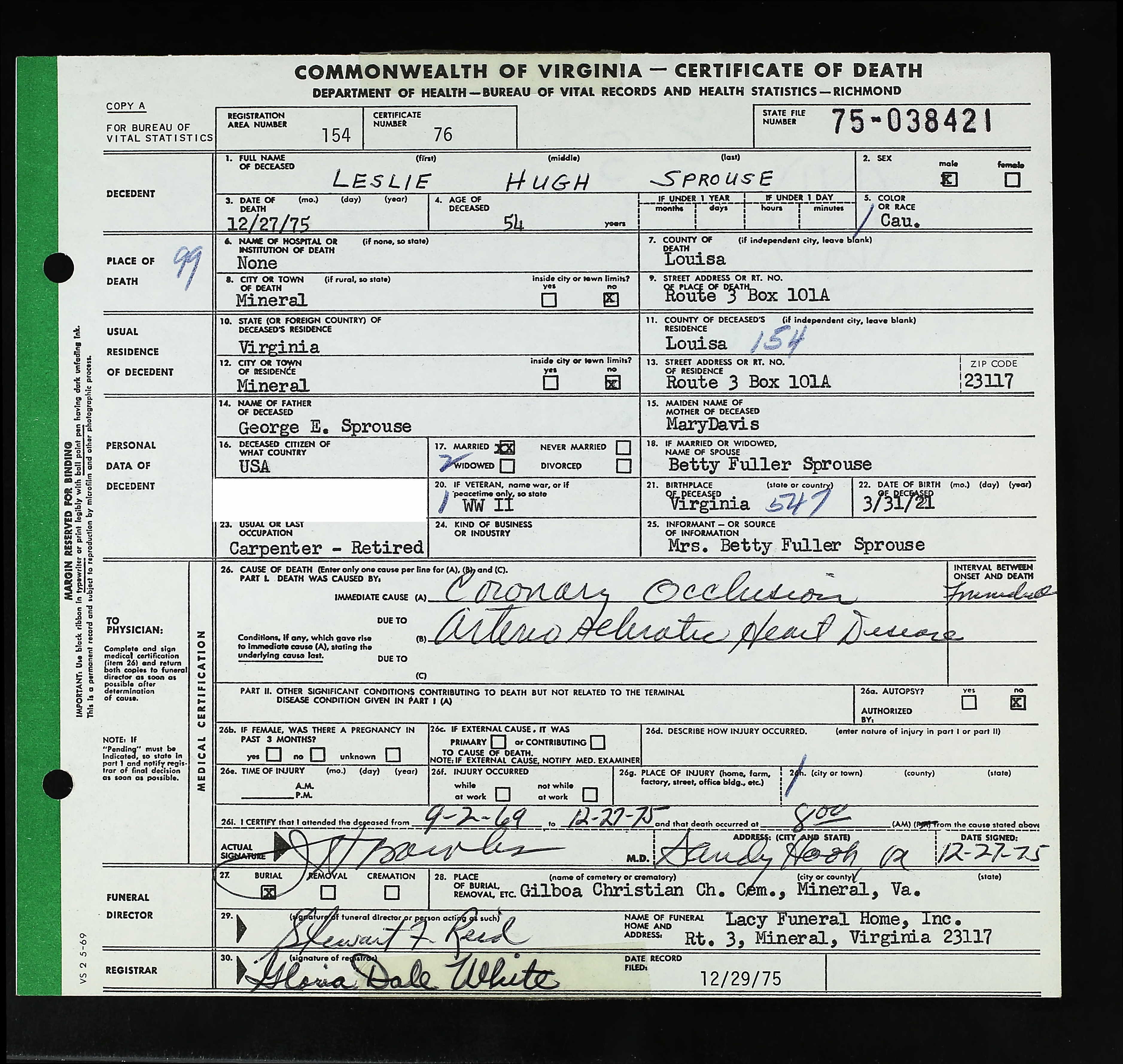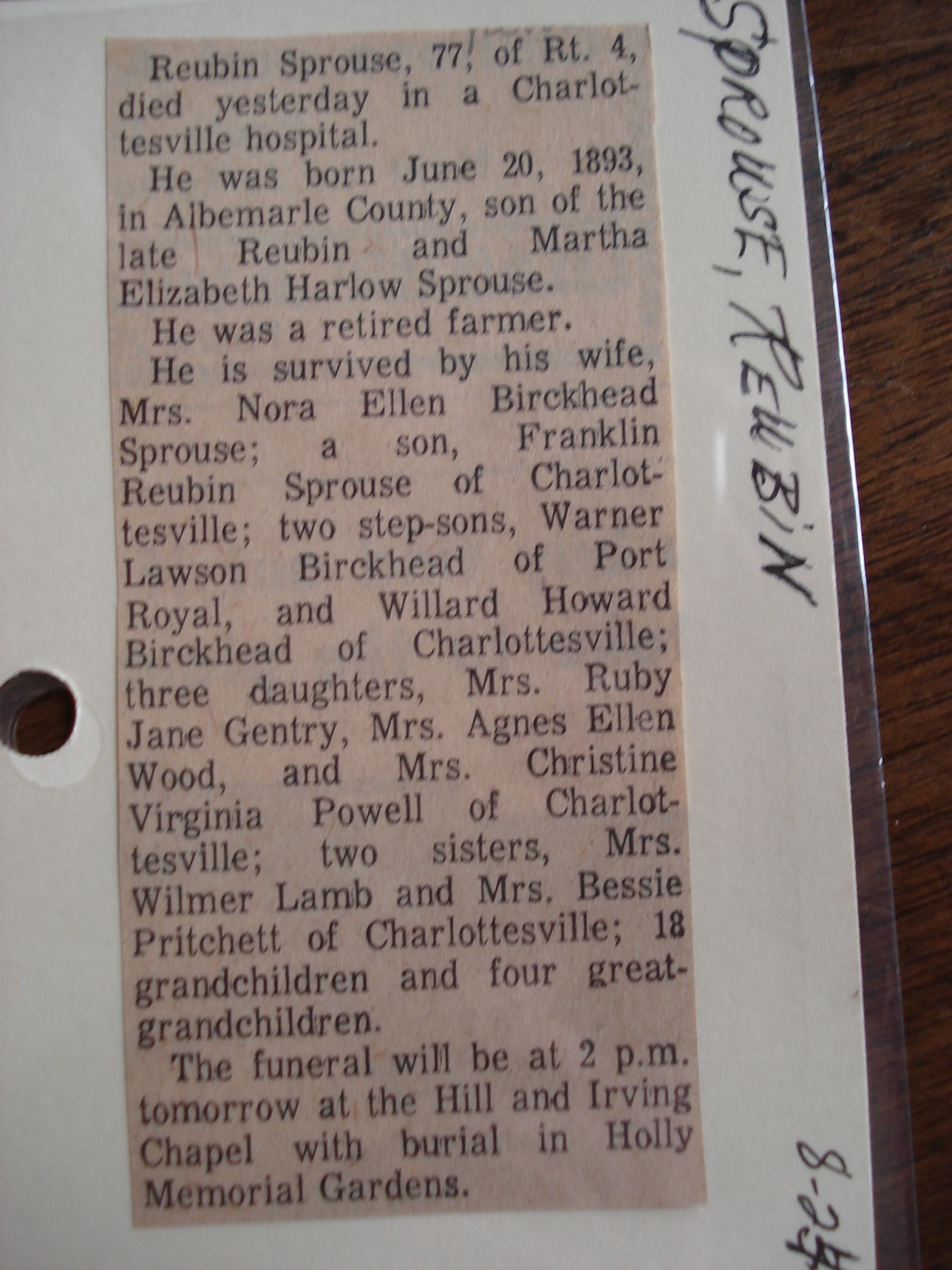 + 341 iv. Clyde Owens Sprouse was born on 3 May 1900 in Mineral, Louisa County, Virginia, USA, died on 22 Feb 1961 in Louisa, Louisa County, Virginia, USA,549 at age 60, and was buried on 24 Feb 1961 in Hillcrest Cemetery, Louisa, Louisa County, Virginia, USA.