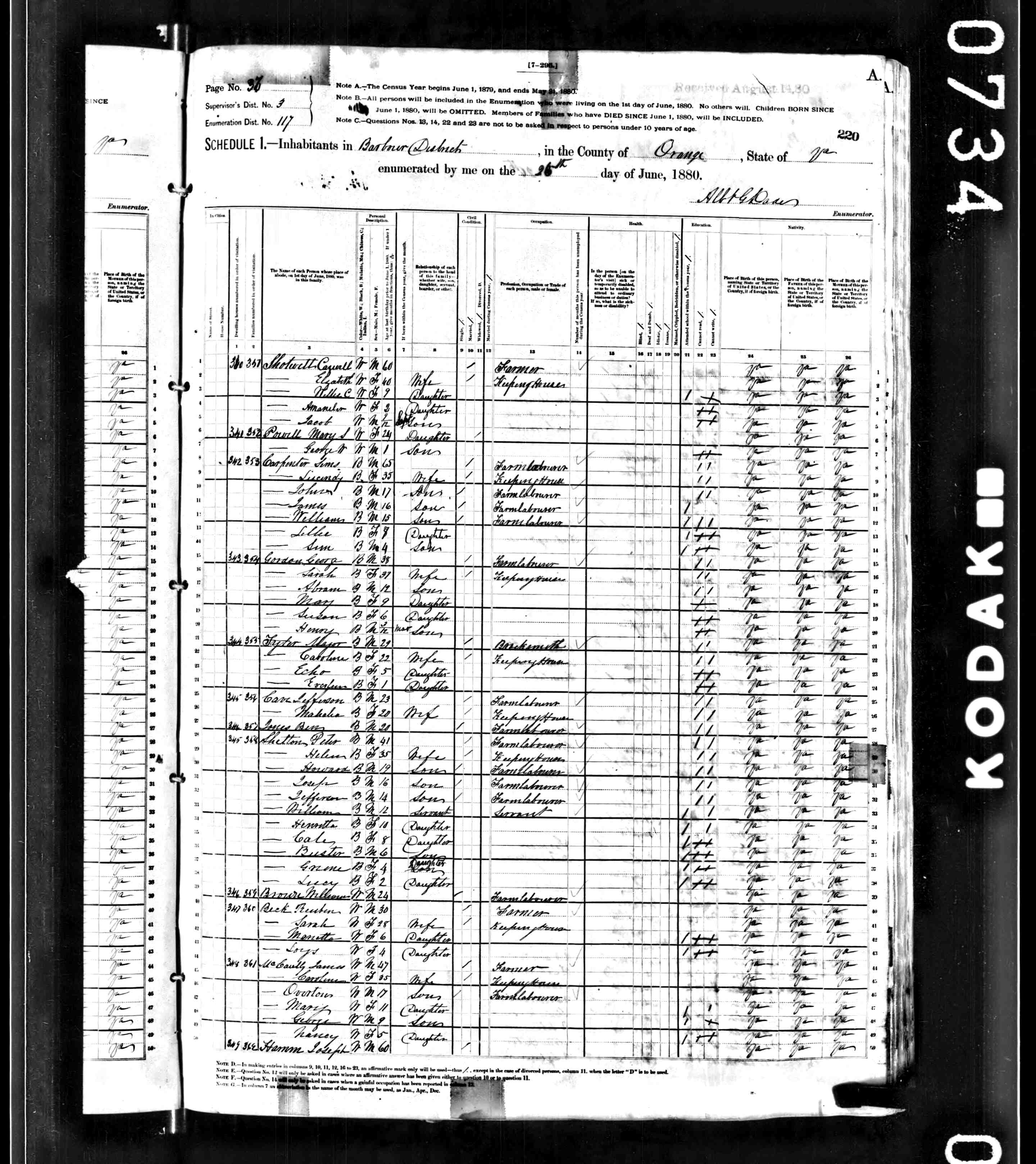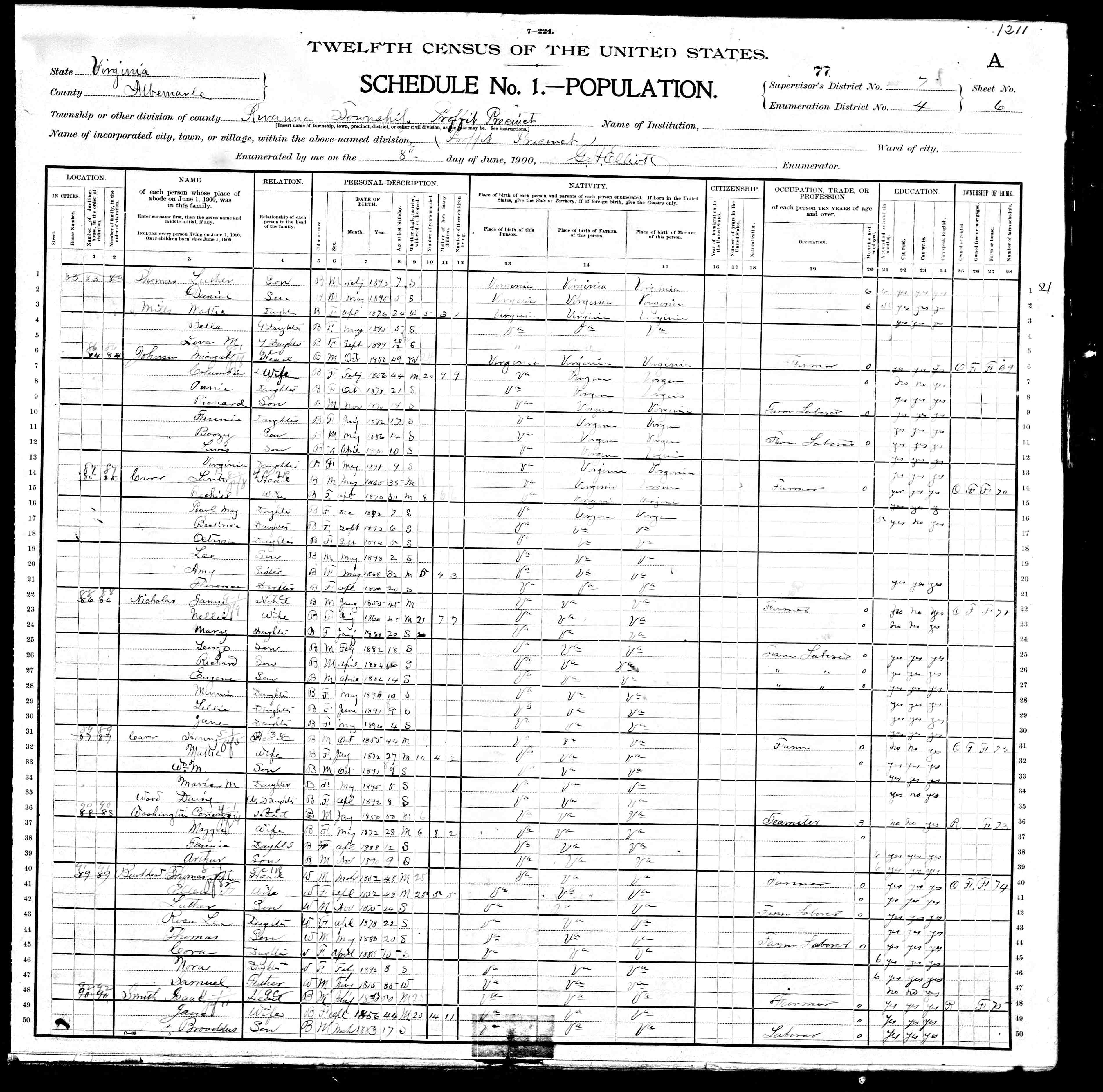 1. Census: Edward D. Carver and family, 11 Jul 1900, Scottsville, Albemarle County, Virginia, USA. 210