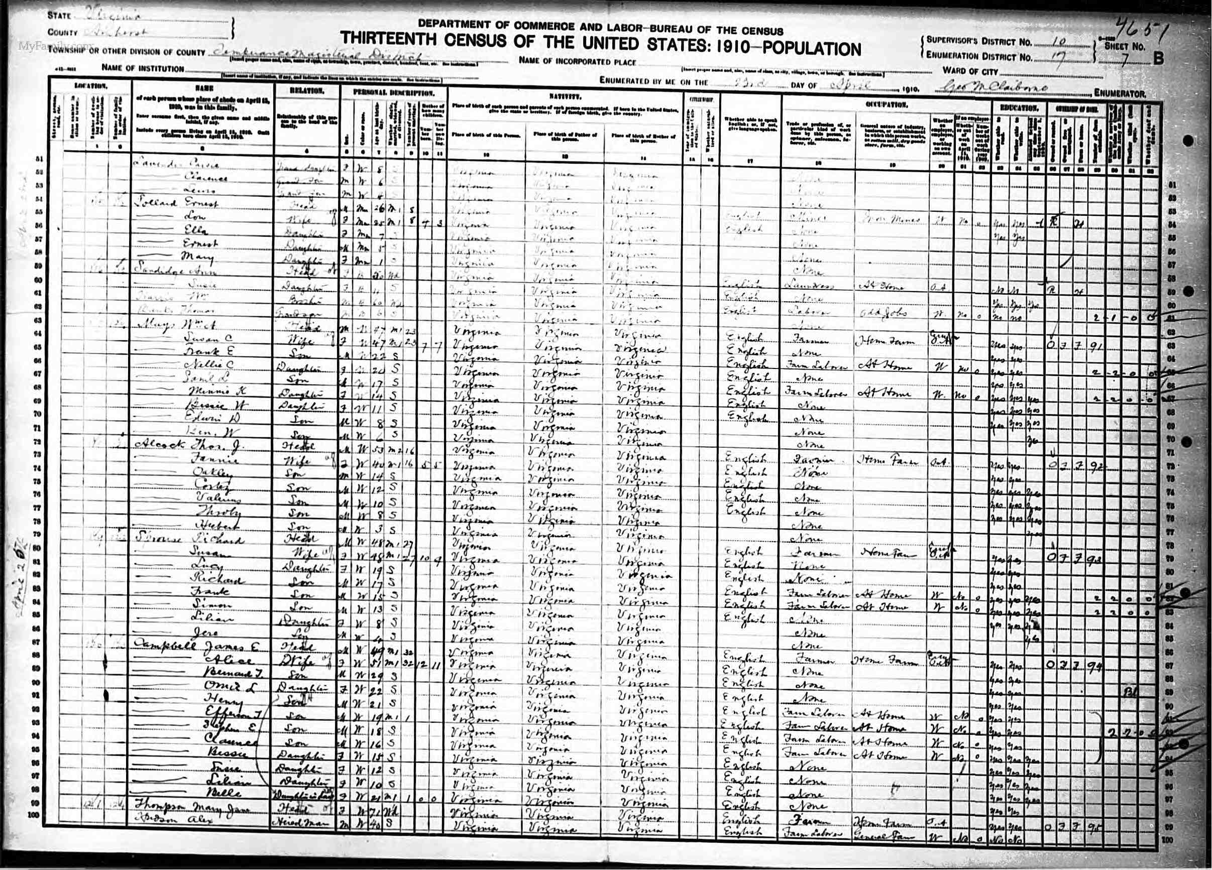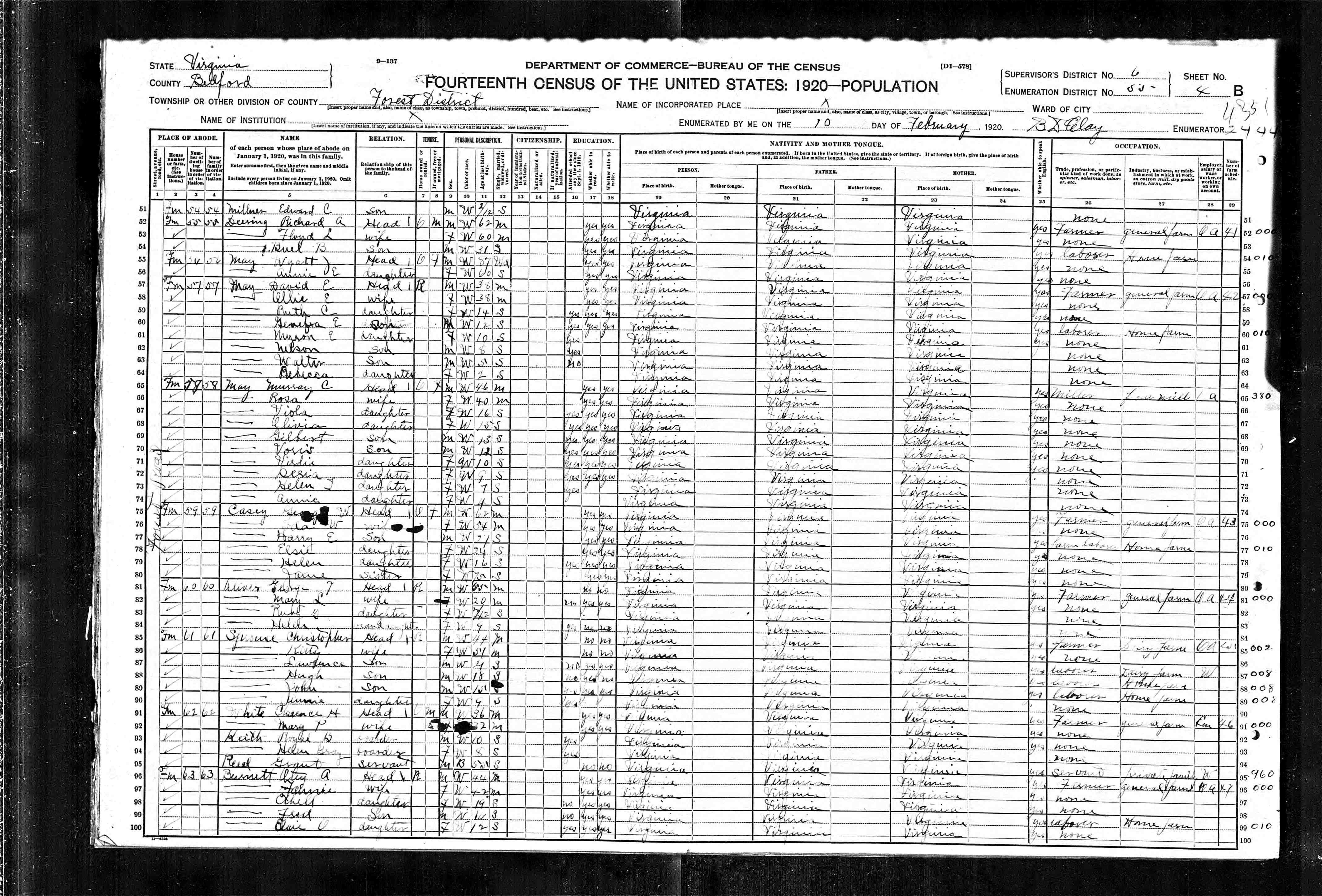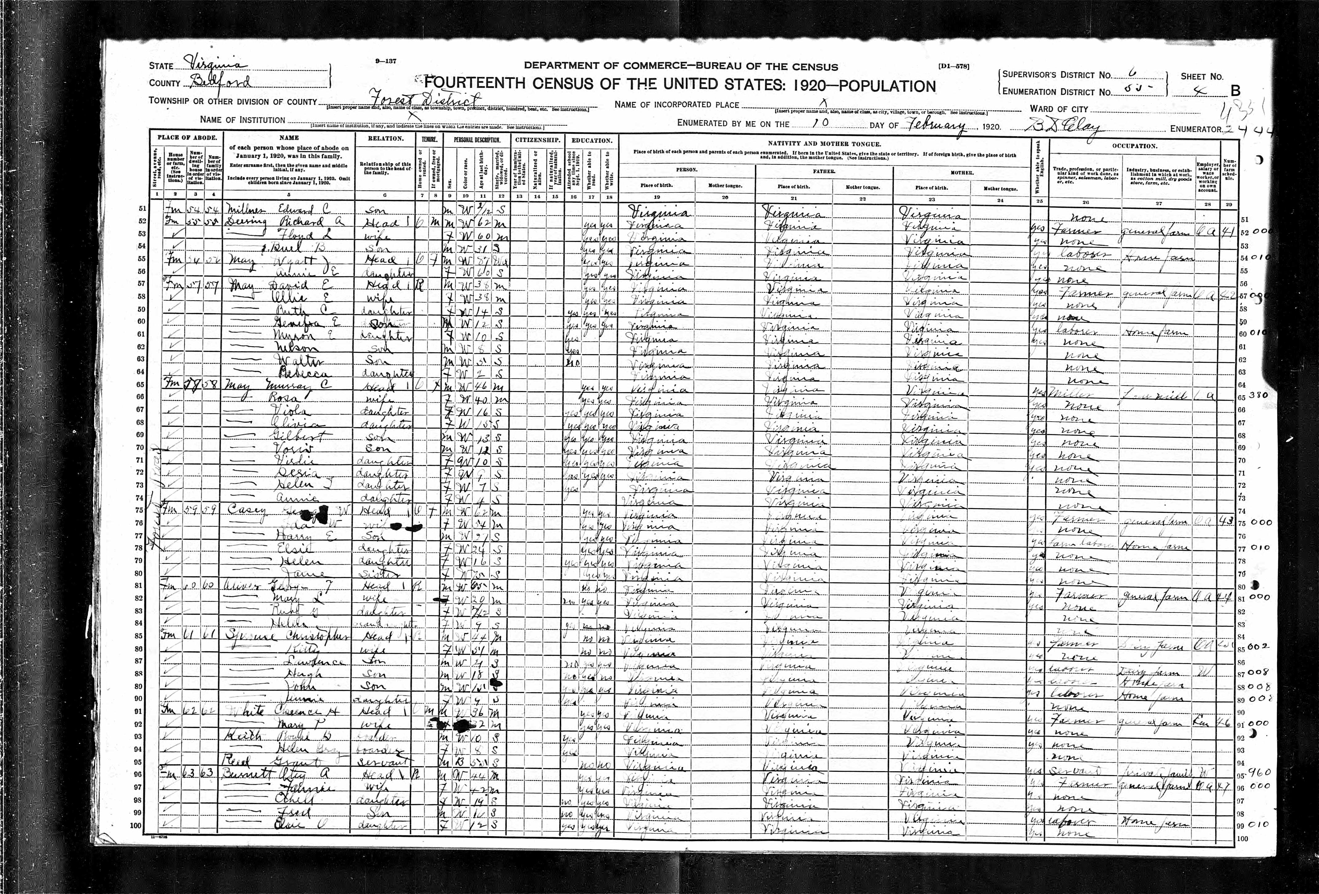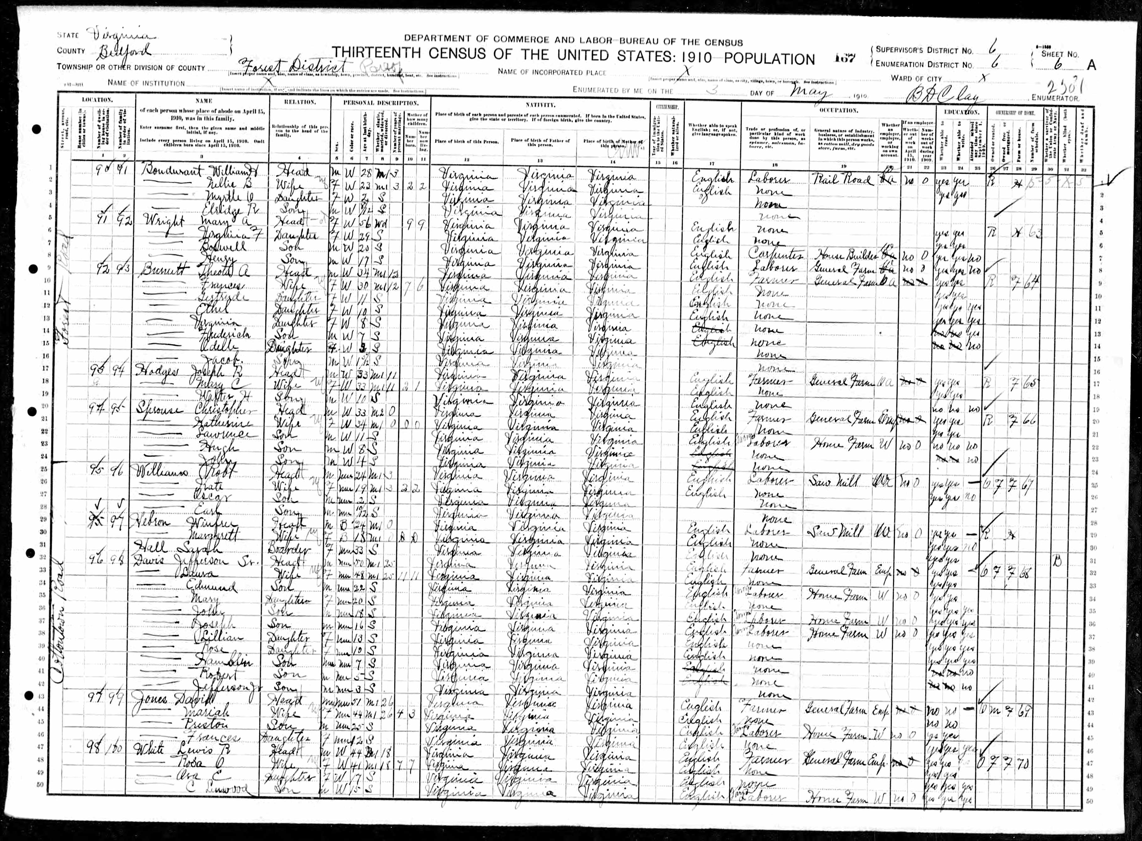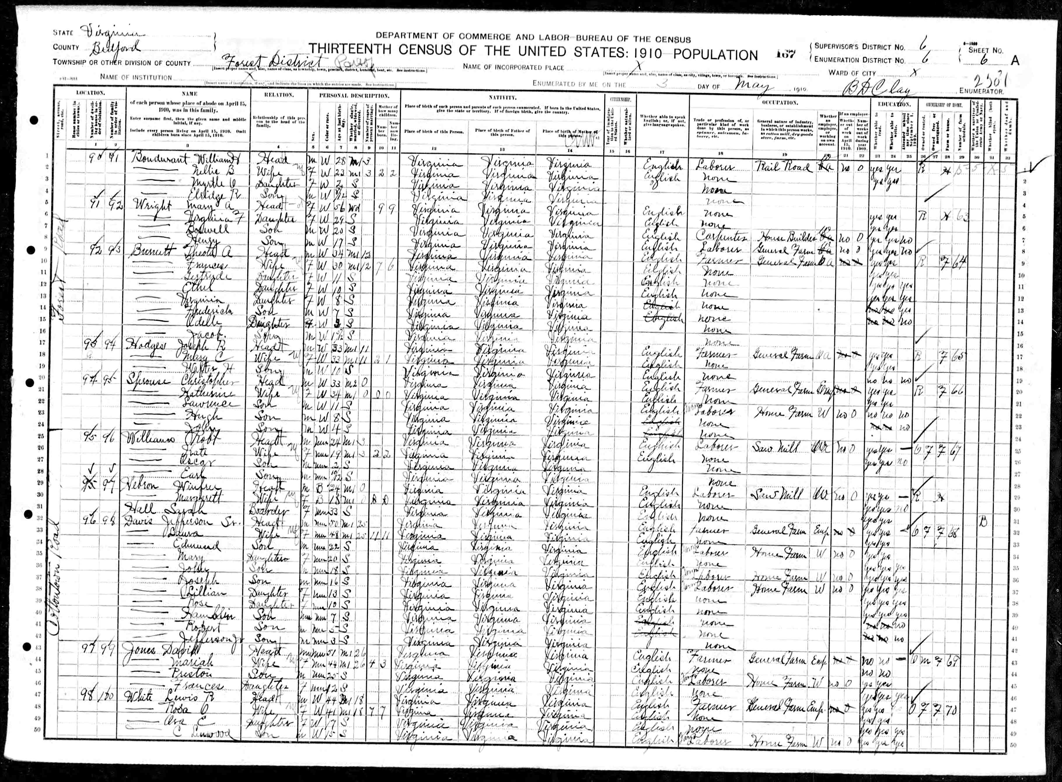 838. 1910 Virginia Census, Bedford, Forest ED 7, Sht 23B.