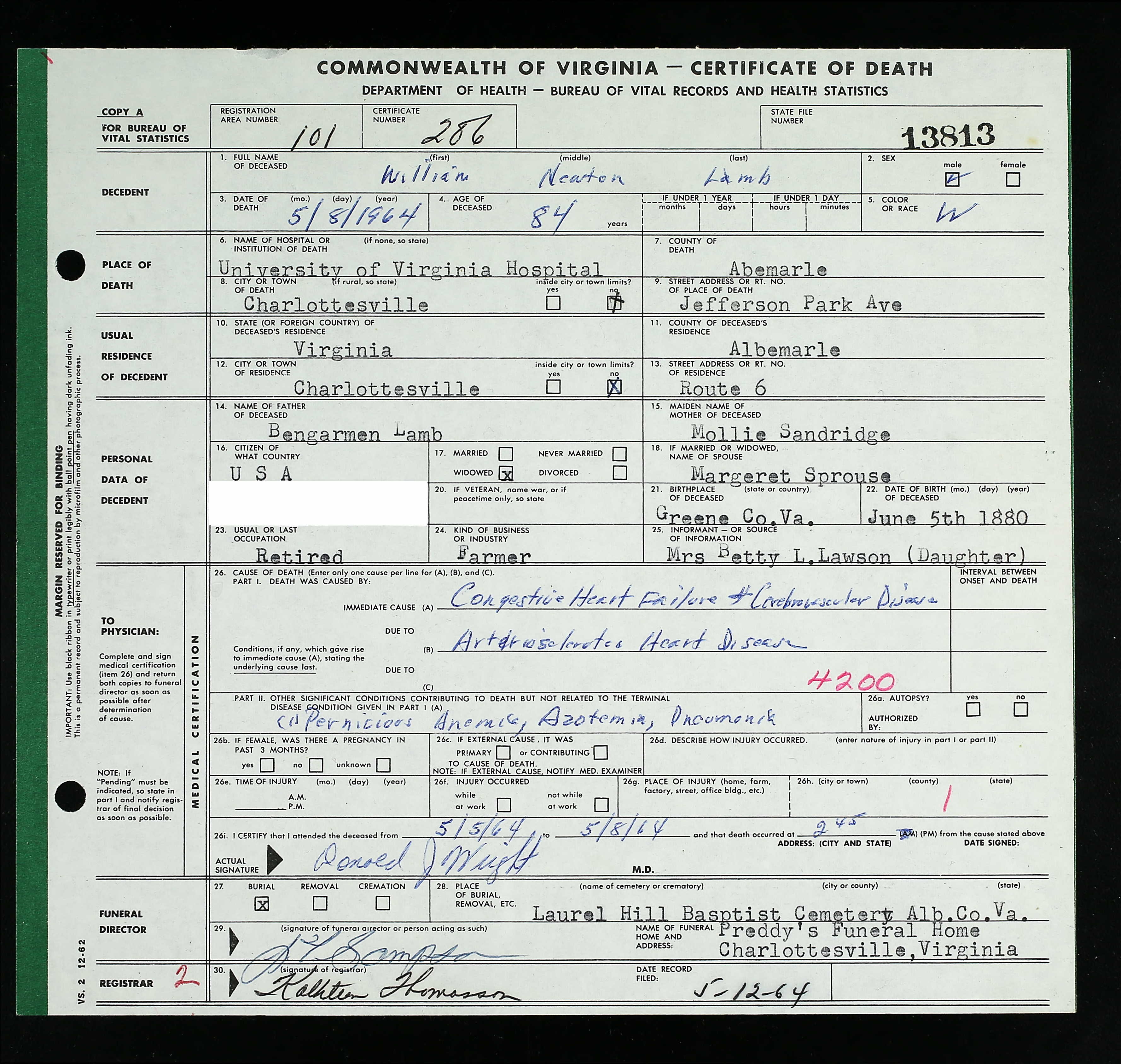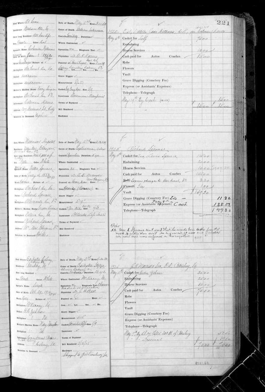121. William S. "Willie" Sprouse was born on 21 Sep 1868 in Louisa County, Virginia, USA, died on 21 Sep 1933 in Louisa County, Virginia, USA,228 at age 65, and was buried on 22 Sep 1933 in Hillcrest Cemetery, Louisa, Louisa County, Virginia, USA.