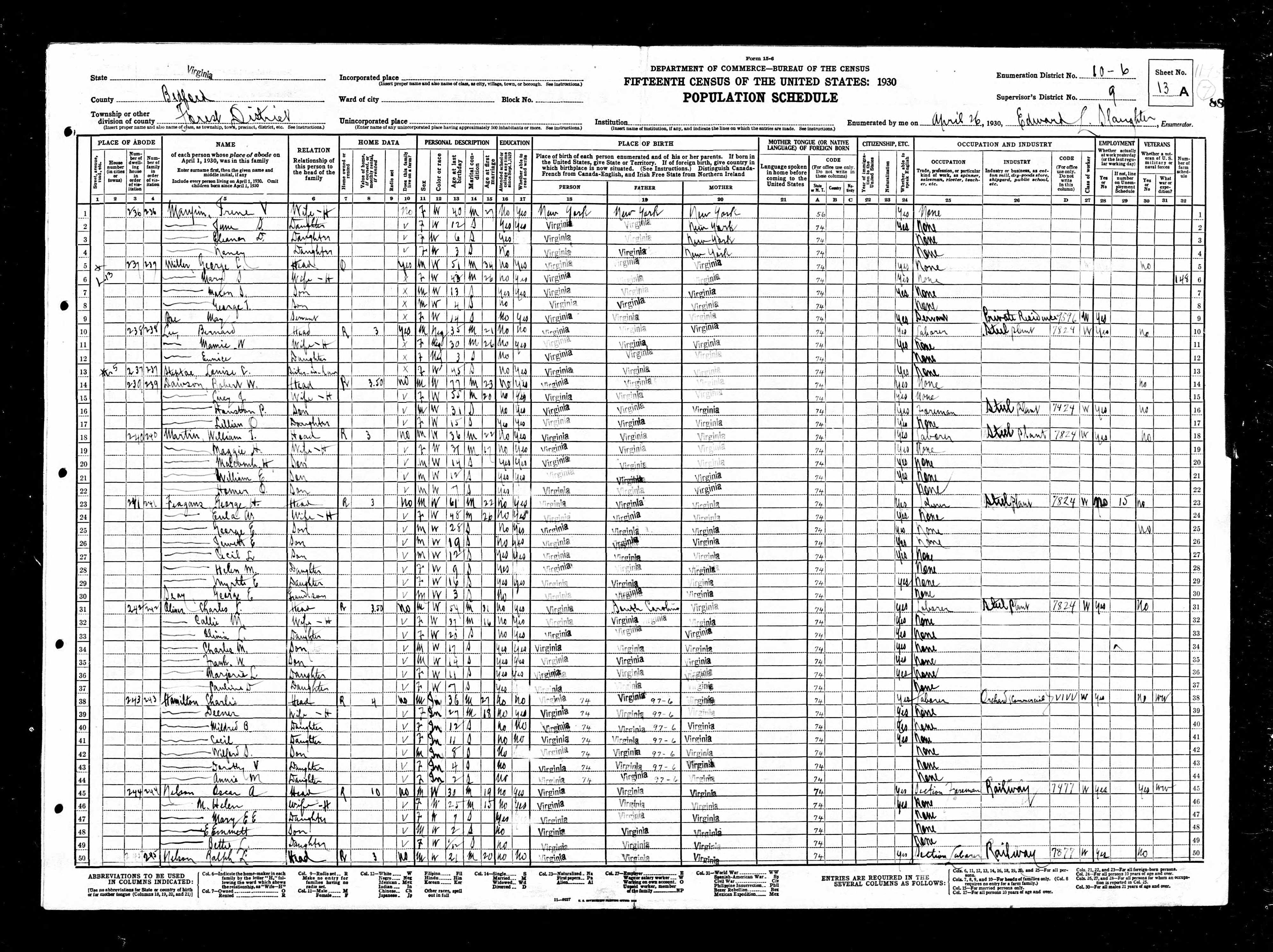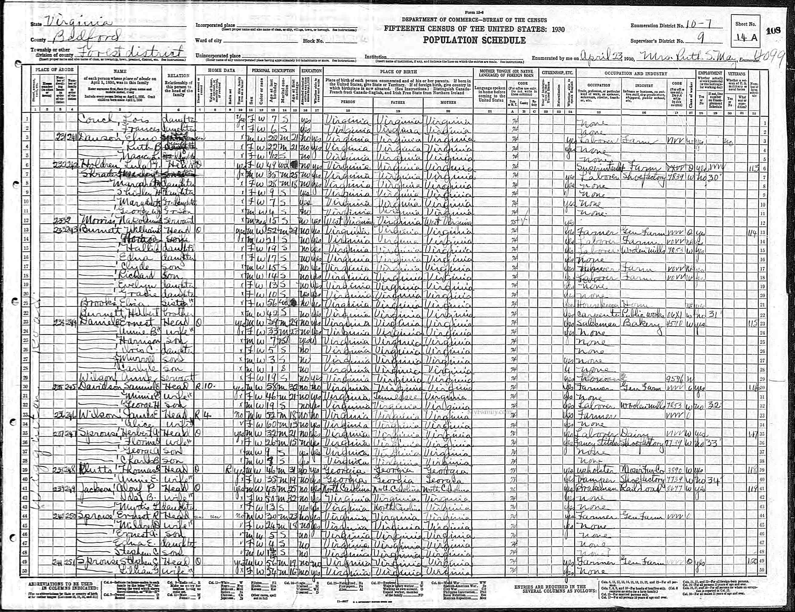 856. 1930 Virginia Census, Lynchburg, Lynchburg (IC), ED 11, Sht 7A.