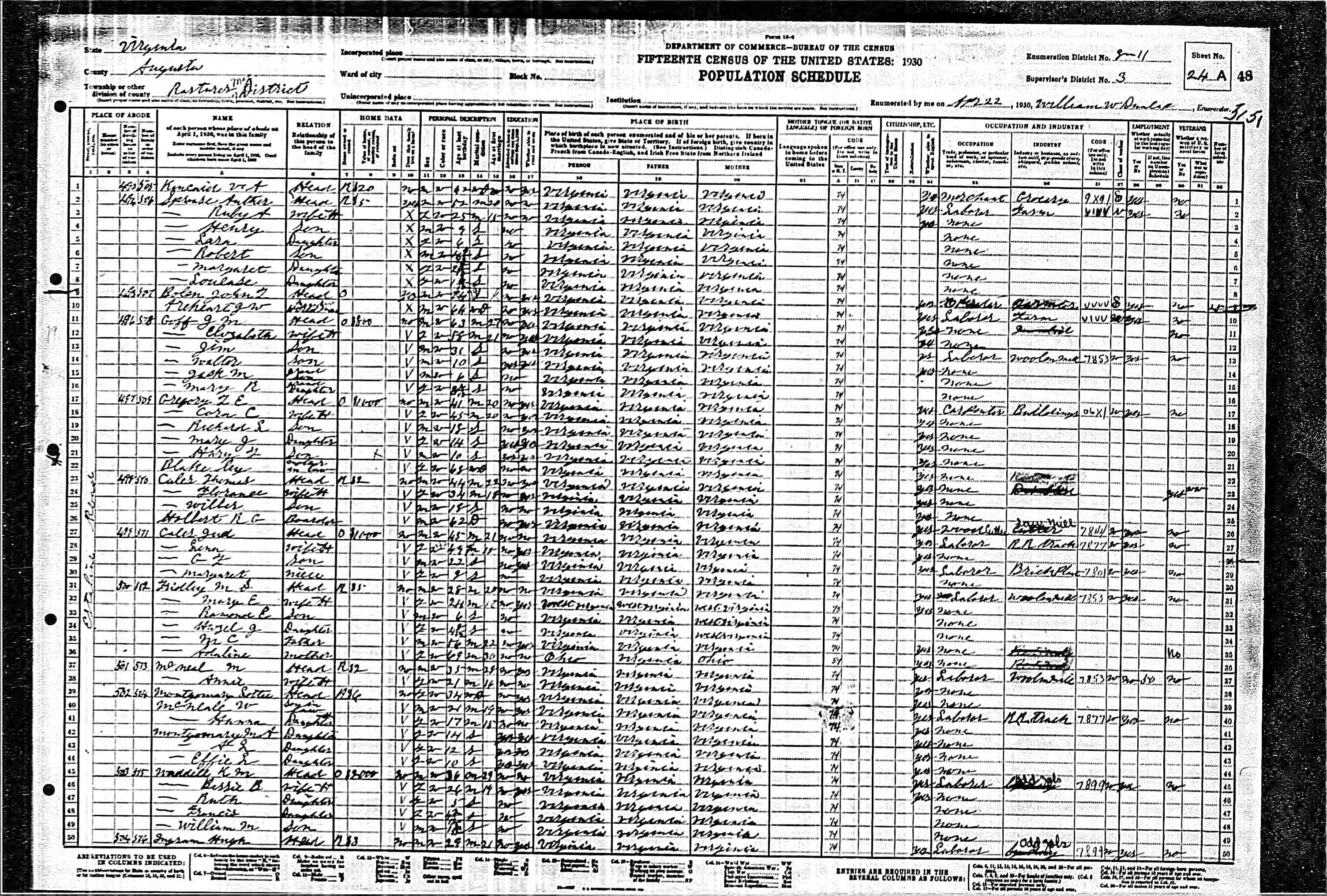 1. Census: W. Arthur Sprouse and family, 22 Apr 1930, Pastures, Augusta County, Virginia, USA. 530