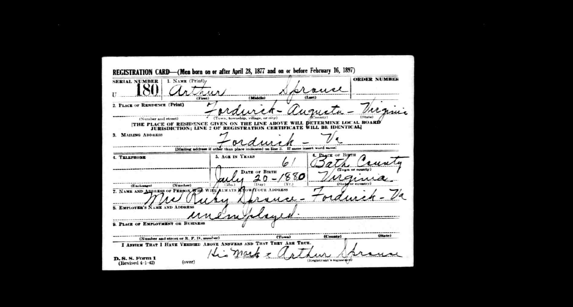 859. World War II Draft Registration Cards, 1942, Arthur Gideon Sprouse WWII Draft Registration Card.