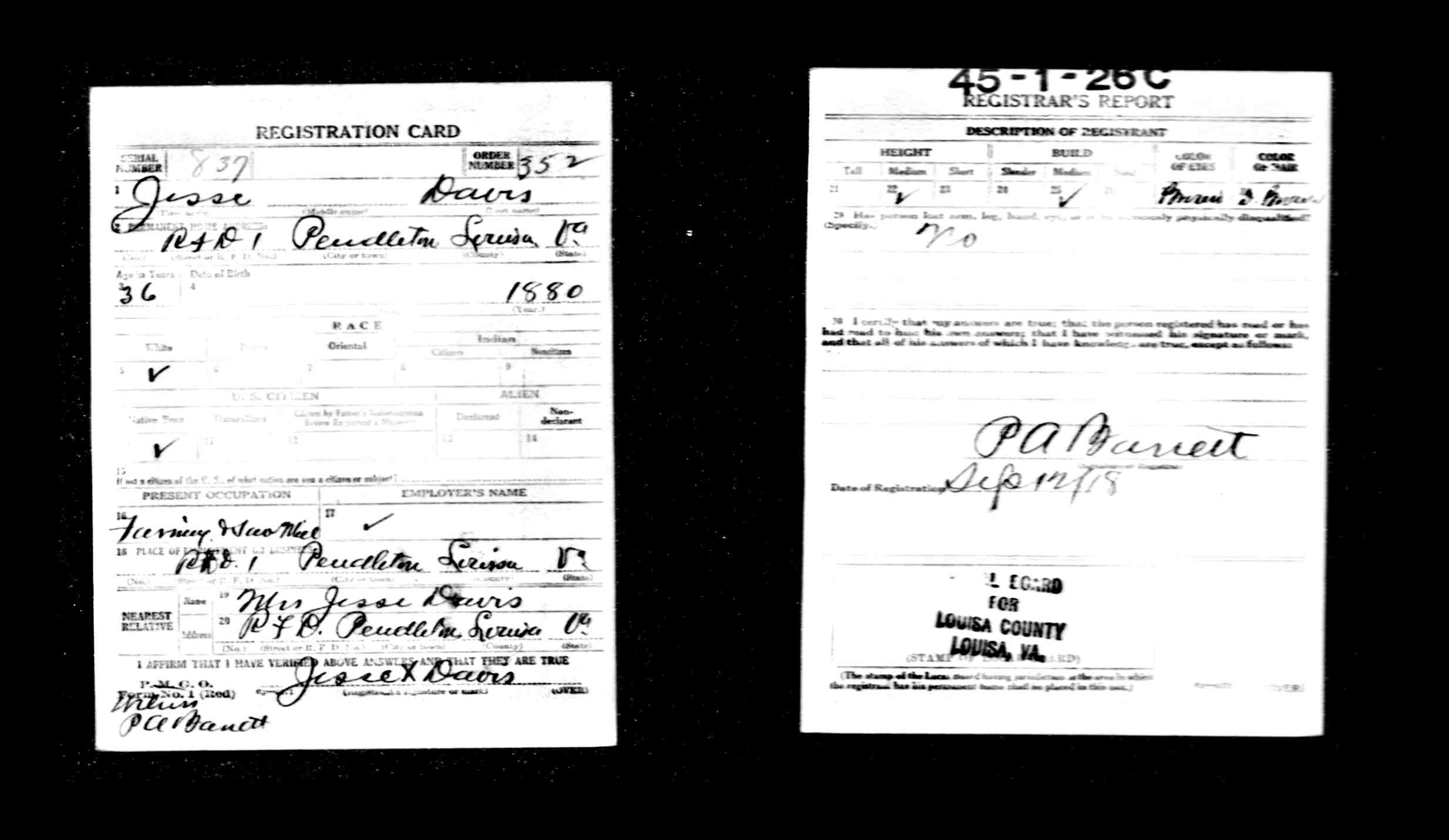 3. Legal: WWI Draft registration, 10 Sep 1918, Charlottesville, Albemarle County, Virginia, USA. 526