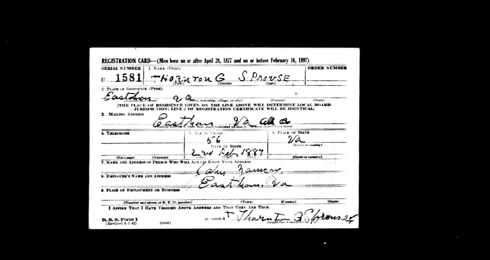 870. World War I Civilian Draft Registration Card, Lawrence Sprouse.