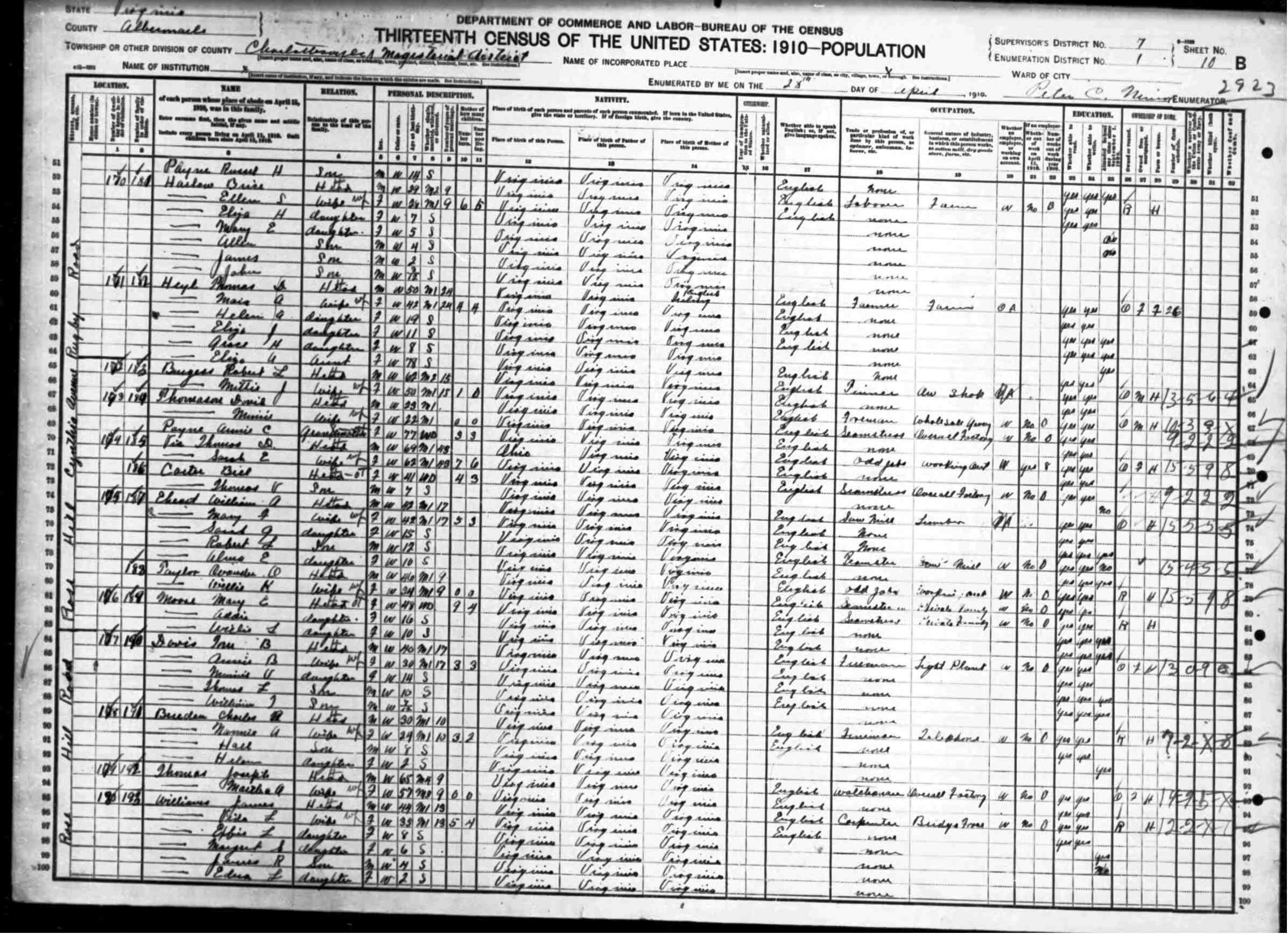 2. Census: Linwood Carver and family, 23 Apr 1910, Charlottesville, Albemarle County, Virginia, USA. 211